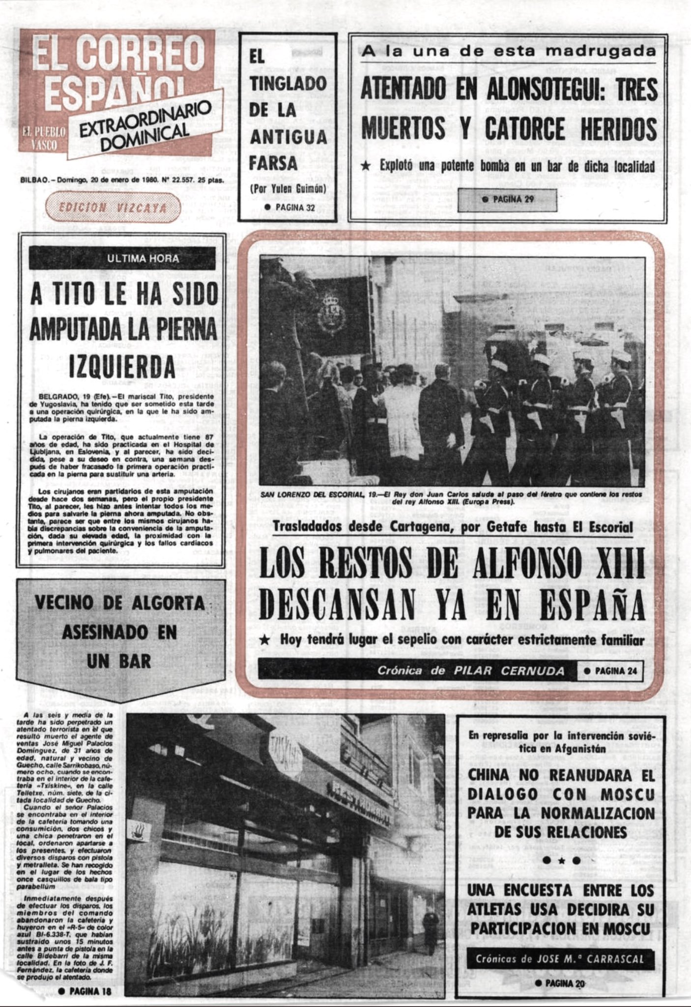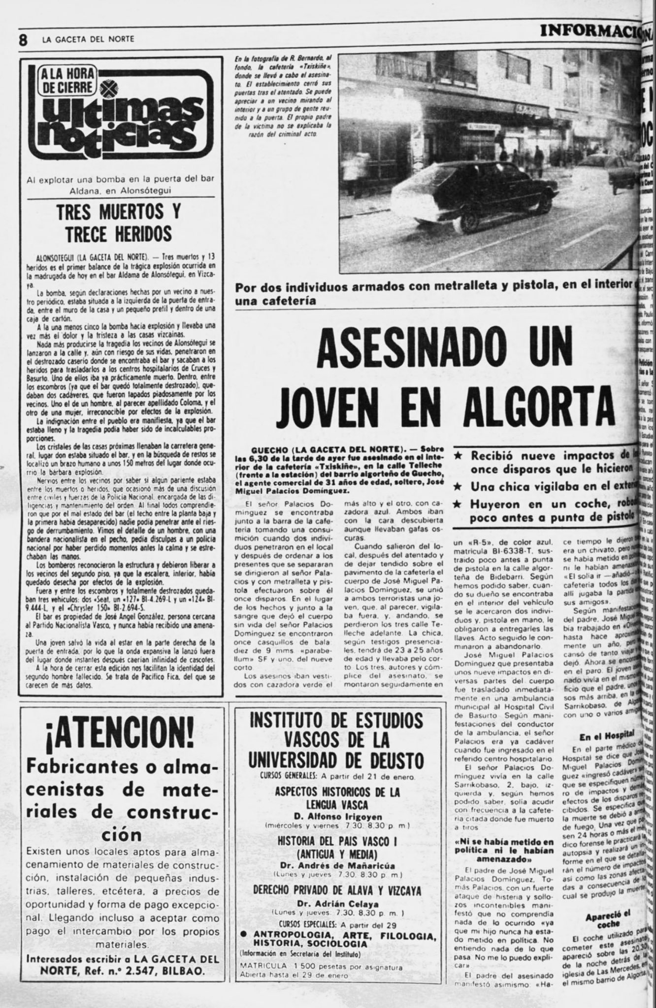Pasadas las seis y media de la tarde del 19 de enero de 1980, dos miembros de la banda terrorista ETA asesinaban a tiros en el barrio de Algorta (Guecho) al agente comercial JOSÉ MIGUEL PALACIOS DOMÍNGUEZ. Todas las tardes jugaba una partida de cartas en el reservado de la cafetería Txiskiñe, cerca de su domicilio. Esa tarde había unas quince personas jugando a las cartas o presenciando las partidas. En torno a las siete menos cuarto dos chicos y una chica penetraron en el bar a cara descubierta, ordenaron apartarse a los presentes y efectuaron nueve disparos en la cabeza, cuello y pecho de José Miguel.