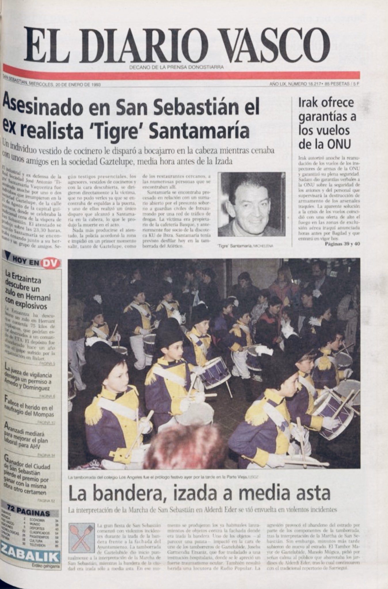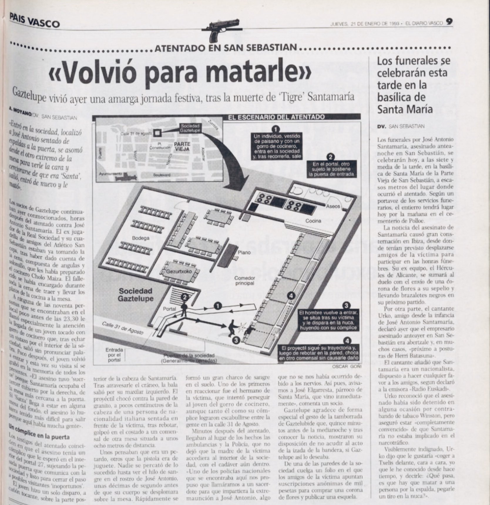 El 19 de enero de 1993 el grupo Donosti de ETA asesinaba en San Sebastián al hostelero y exjugador de la Real Sociedad JOSÉ ANTONIO SANTAMARÍA VAQUERIZA. Tres miembros de ese grupo, tras vigilar previamente los hábitos de José Antonio, lo asesinaron de un tiro en la nuca mientras cenaba en la sociedad gastronómica Gaztelupe con motivo de la Tamborrada que daba inicio a las fiestas patronales de San Sebastián.