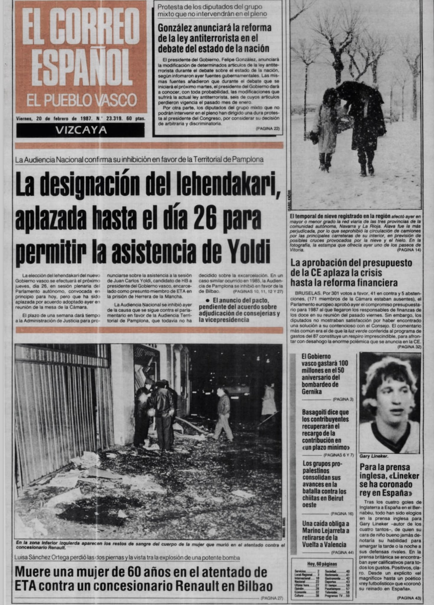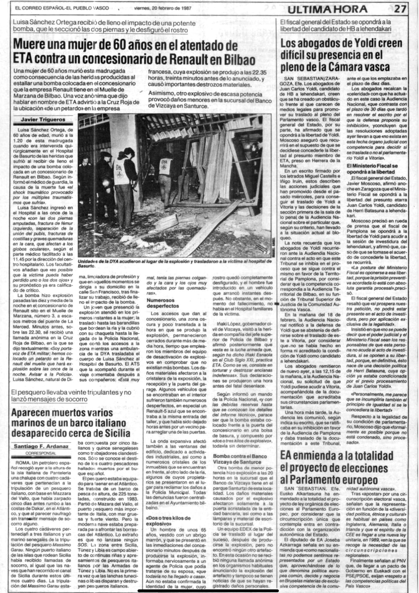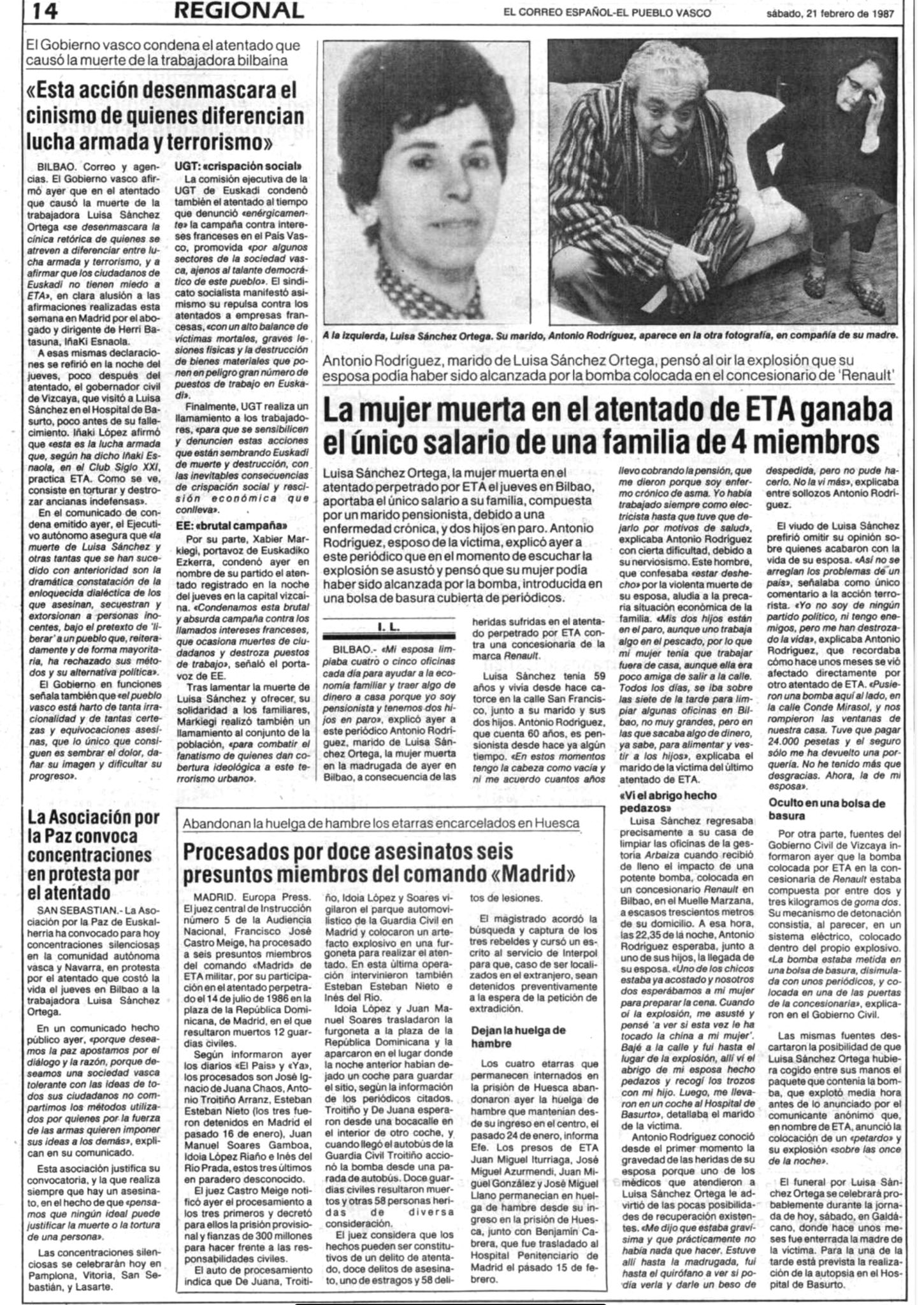 El 19 de febrero de 1987 la banda terrorista ETA mata en Bilbao a MARÍA LUISA SÁNCHEZ ORTEGA. Volvía a casa a eso de las diez y media de la noche después de su jornada de trabajo habitual como limpiadora cuando la alcanzó de lleno la explosión de un artefacto de considerable potencia colocado en un concesionario de Renault de Bilbao. María Luisa quedó gravemente herida: sufrió la amputación de ambas piernas, heridas graves en el pubis, fracturas de costillas y graves quemaduras en la cara que afectaban a los globos oculares. Un coche de la asociación de ayuda en carretera Detente y Ayuda (DYA) recogió a la herida y la trasladó al hospital bilbaíno de Basurto, donde, tras ser intervenida quirúrgicamente, falleció pasada la una de madrugada del 19 de febrero.