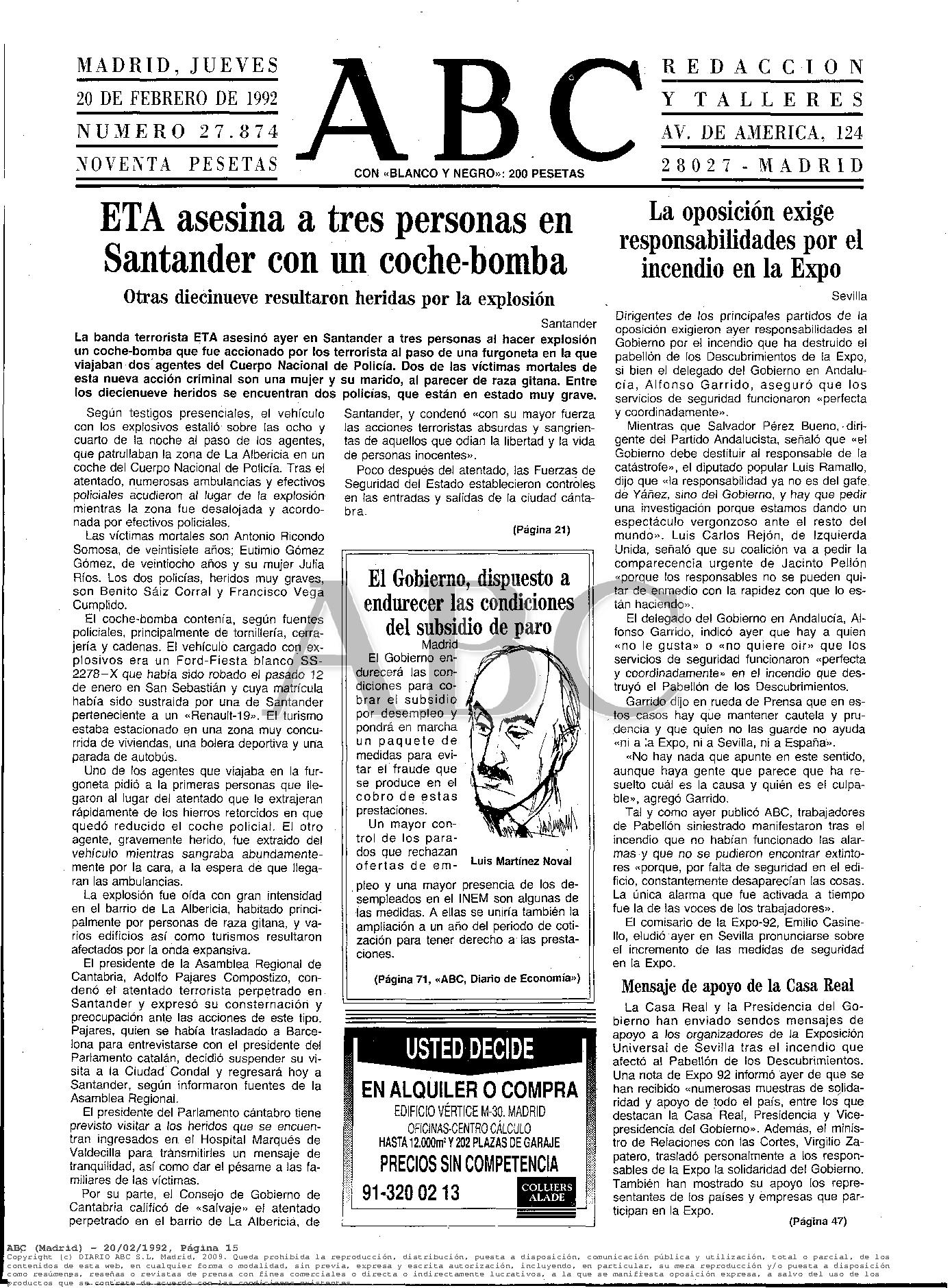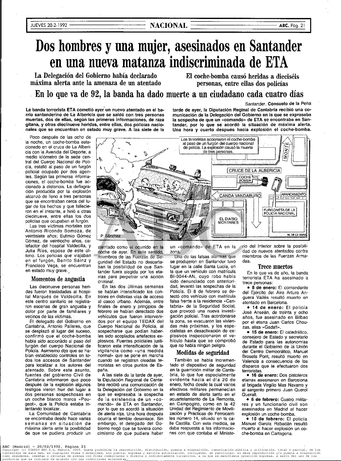El 19 de febrero de 1992 fallecen víctimas de la explosión de un coche-bomba en el barrio obrero de La Albericia de Santander JULIA RÍOS RIOZ, su marido EUTIMIO GÓMEZ GÓMEZ y el estudiante ANTONIO RICONDO SOMOZA.