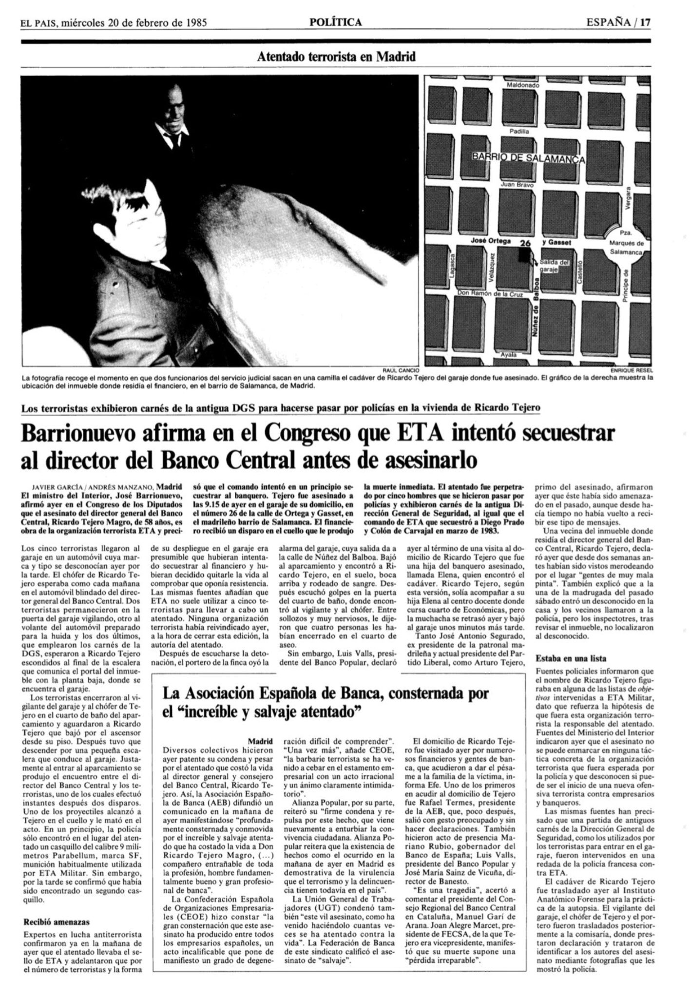 El 19 de febrero de 1985 la banda terrorista ETA asesinaba en Madrid a RICARDO TEJERO MAGRO, consejero y director general del Banco Central. En torno a las 9:00 horas dos terroristas se hicieron pasar por policías de la Dirección General de Seguridad para entrar en el garaje de su casa, en la calle Ortega y Gasset del madrileño barrio de Salamanca. Allí redujeron al vigilante del inmueble y al chófer de Ricardo, encerrándolos en un cuarto de aseo. Otros dos terroristas aguardaban en el exterior y un quinto se quedó al volante de un coche, preparado para huir. Los etarras esperaron a que el director del banco descendiera desde el portal por la escalera, y en ese momento le dispararon dos tiros en la nuca que le provocaron la muerte en el acto.