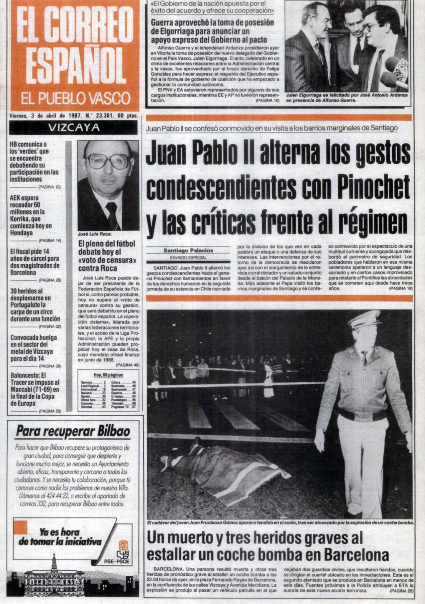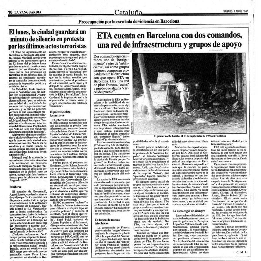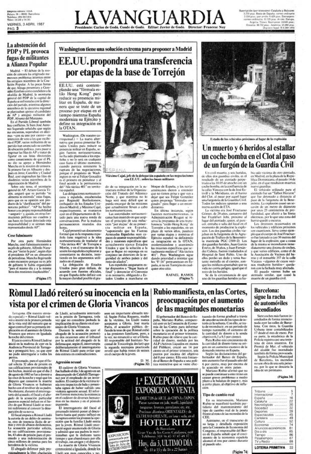 El 2 de abril de 1987, en torno a las 22:00 horas, JUAN FRUCTUOSO GÓMEZ fue alcanzado de lleno por la explosión de un coche-bomba en Barcelona. La deflagración fue brutal y su cuerpo se encontró a treinta metros del lugar de la explosión.
