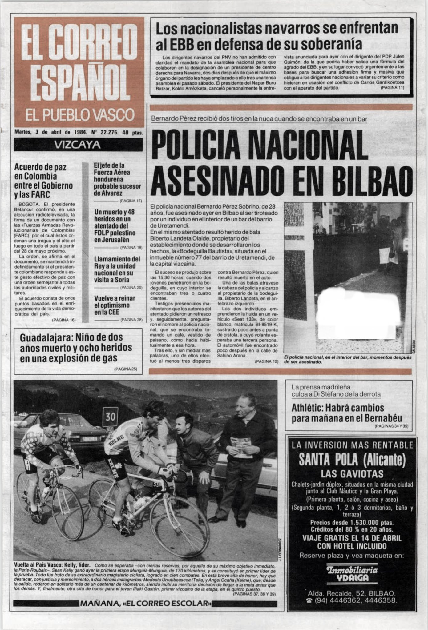 En torno a las cuatro de la tarde del 2 de abril de 1984, y mientras tomaba un café en el Bar Bautista del barrio bilbaíno de Uretamendi, un etarra disparó dos veces por la espalda a BERNARDO PÉREZ SOBRINO, policía nacional, hiriéndolo mortalmente en la cabeza. Uno de los proyectiles alcanzó al dueño del establecimiento, Lisardo Landeta Olalde, que tuvo que ser intervenido quirúrgicamente en el Hospital Civil de Basurto de una herida en el brazo.