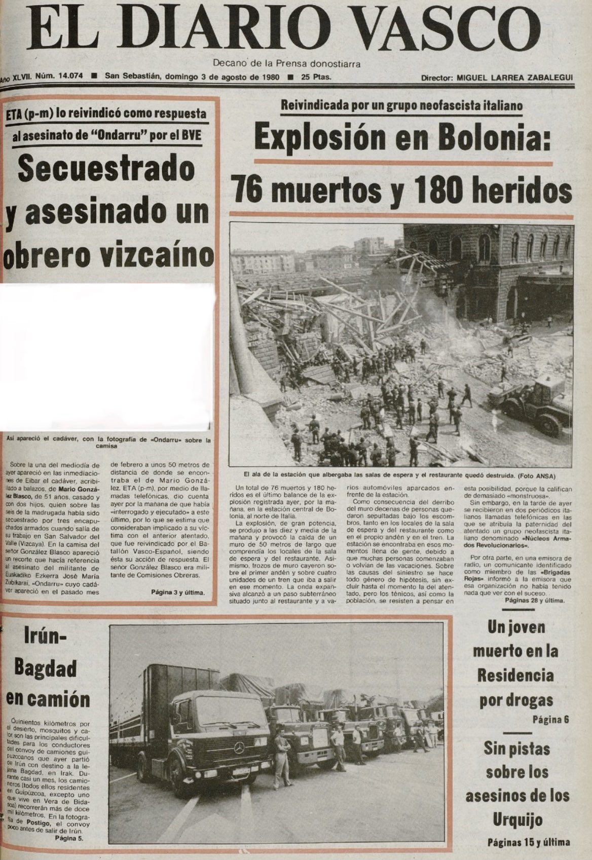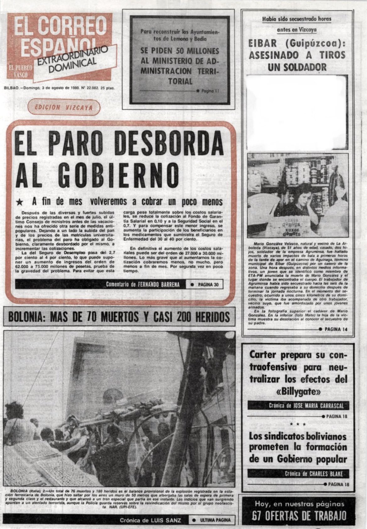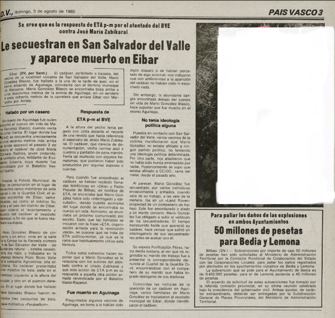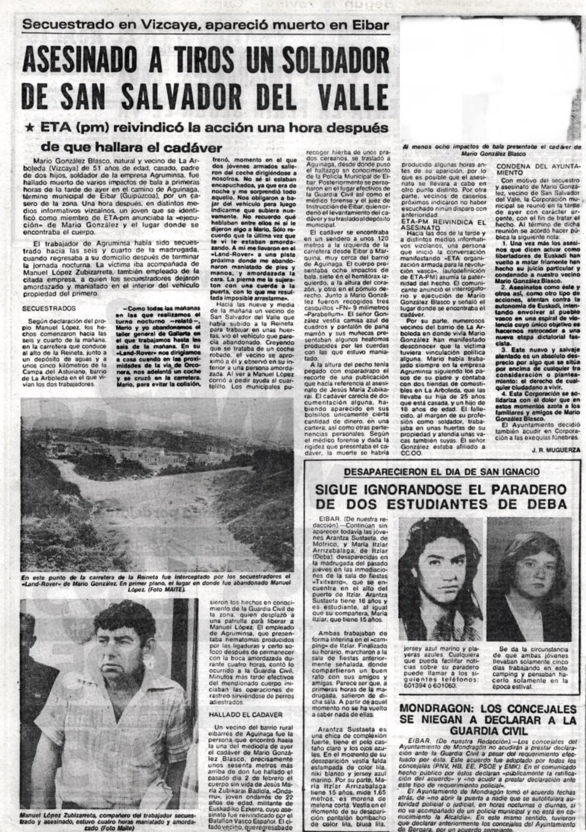 El 2 de agosto de 1980 la banda terrorista ETA secuestraba y asesinaba en Éibar (Guipúzcoa) a MARIO GONZÁLEZ BLASCO, trabajador de la empresa Agruminsa en Vizcaya.