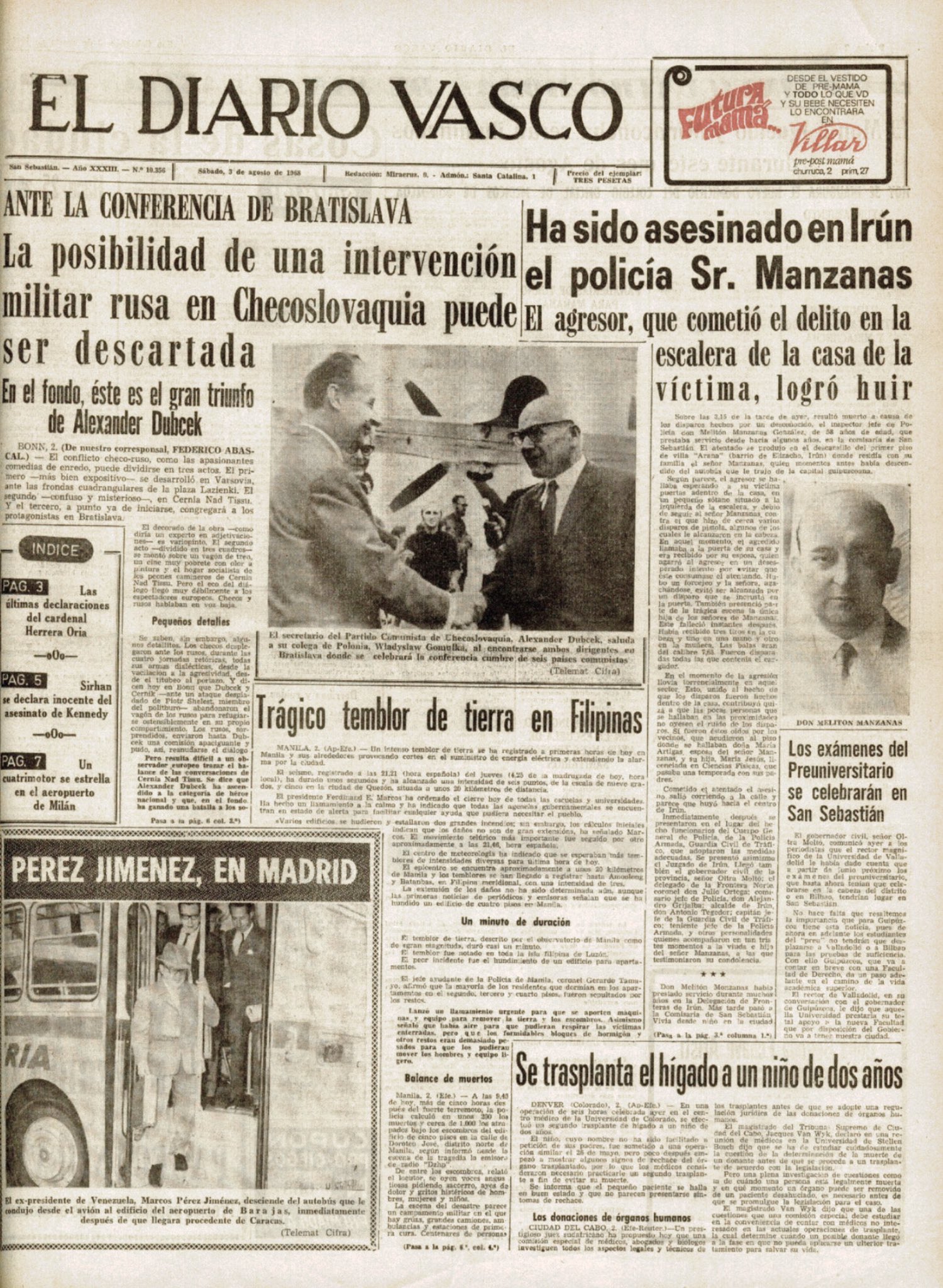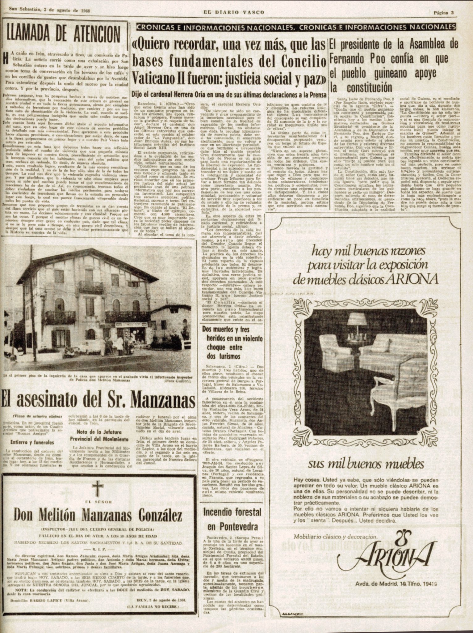 El 2 de agosto de 1968 la banda terrorista ETA asesinaba en Irún (Guipúzcoa) al inspector jefe de Policía MELITÓN MANZANAS GONZÁLEZ. Ese día, Melitón se trasladó en autobús desde la comisaría de San Sebastián a su domicilio en Irún. Al llegar a Villa Arana, abrió la puerta y subió la escalera. Su mujer le oyó y abrió la puerta. Le dijo «vienes mojado»… y en ese momento sonó un disparo que alcanzó a Manzanas por la espalda. La mujer vio al asesino, un individuo joven, de estatura media, bigote y largas patillas. Incluso llegó a forcejear con él. El asesino realizó varios disparos más, aunque no llegó a herir a la mujer del policía. También fue testigo la hija de Melitón, que se asomó a la puerta del domicilio al oír el primer disparo. Su madre la empujó al interior de la casa y ella se acercó a una ventana, pidiendo ayuda a gritos.