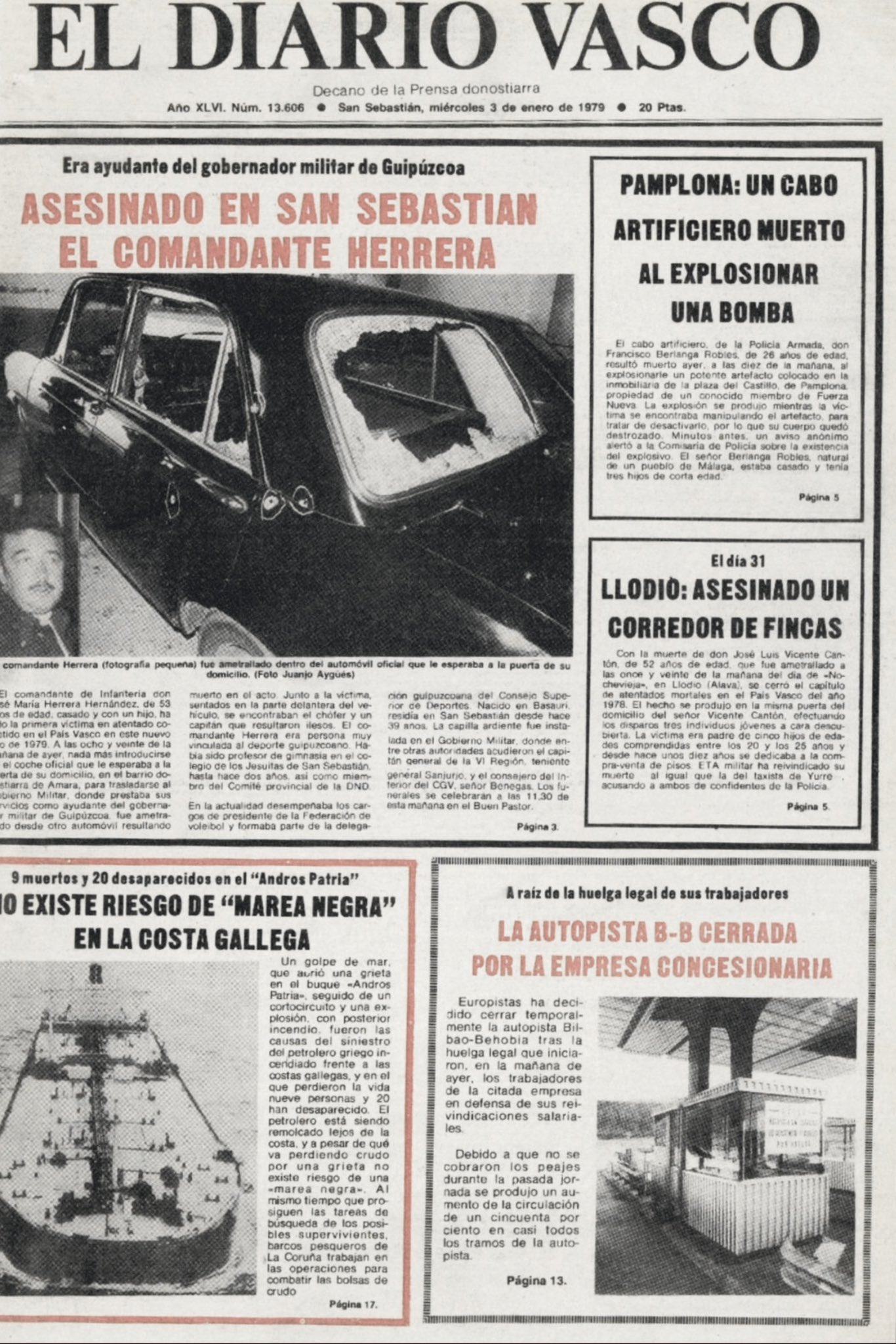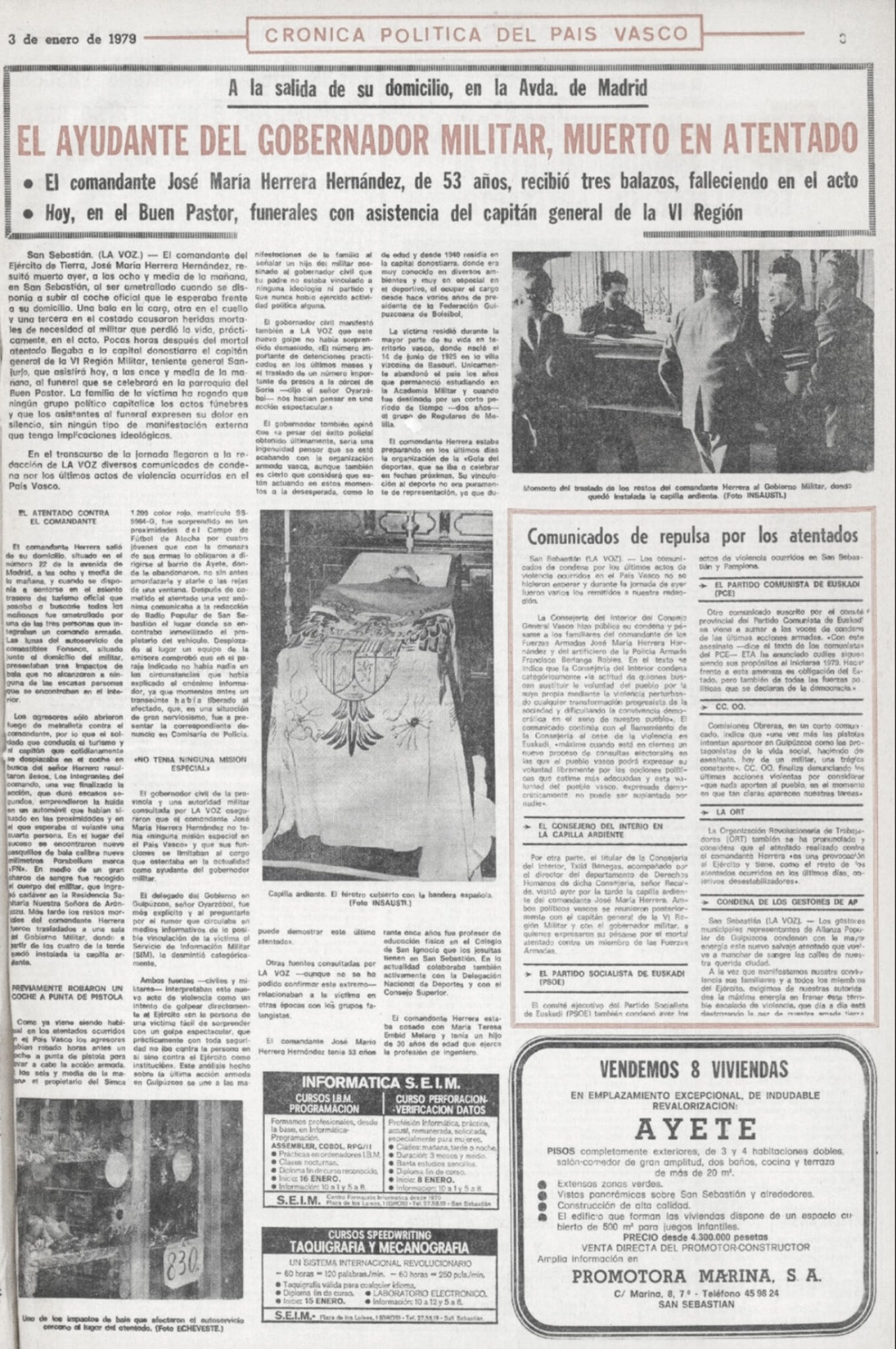 El 2 de enero de 1979 la banda terrorista ETA asesinaba a tiros en San Sebastián al comandante JOSE MARÍA HERRERA HERNÁNDEZ. Varios miembros del grupo Otxobi de ETA dispararon contra el comandante cuando se dirigía desde su domicilio al coche oficial que debía llevarlo al Gobierno Militar. Fue alcanzado en la cabeza y en el cuello, y falleció mientras era trasladado a un centro sanitario.