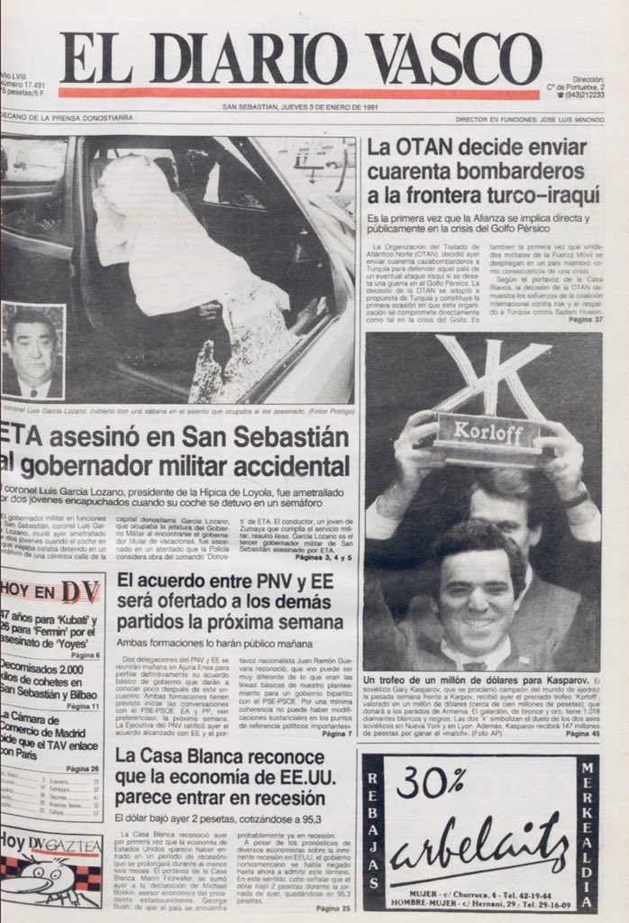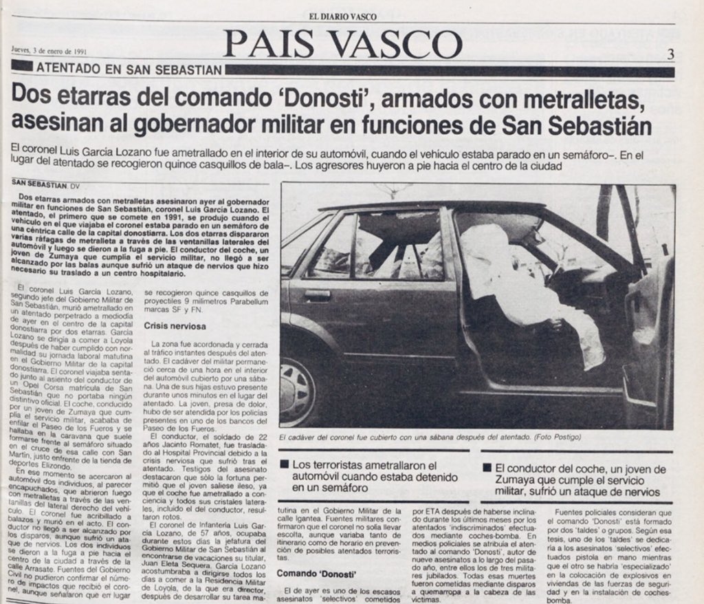 En 1991, el previo a las Olimpiadas de Barcelona, ETA intensificó su actividad terrorista. La primera víctima mortal de las 45 de ese año fue el coronel del Ejército de Tierra, LUIS GARCÍA LOZANO, asesinado el 2 de enero. García Lozano fue acribillado a balazos en San Sebastián por miembros de la banda terrorista ETA. Los disparos fueron efectuados con una metralleta y el cuerpo del coronel García Lozano recibió dieciséis impactos.