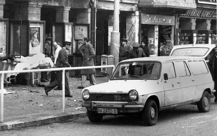 Casi a la misma hora, FRANCISCO BERLANGA ROBLES, cabo del Cuerpo de Artificieros de la Policía Nacional, moría al intentar desactivar una bomba en las oficinas de la Inmobiliaria Jiménez Fuentes de Pamplona.