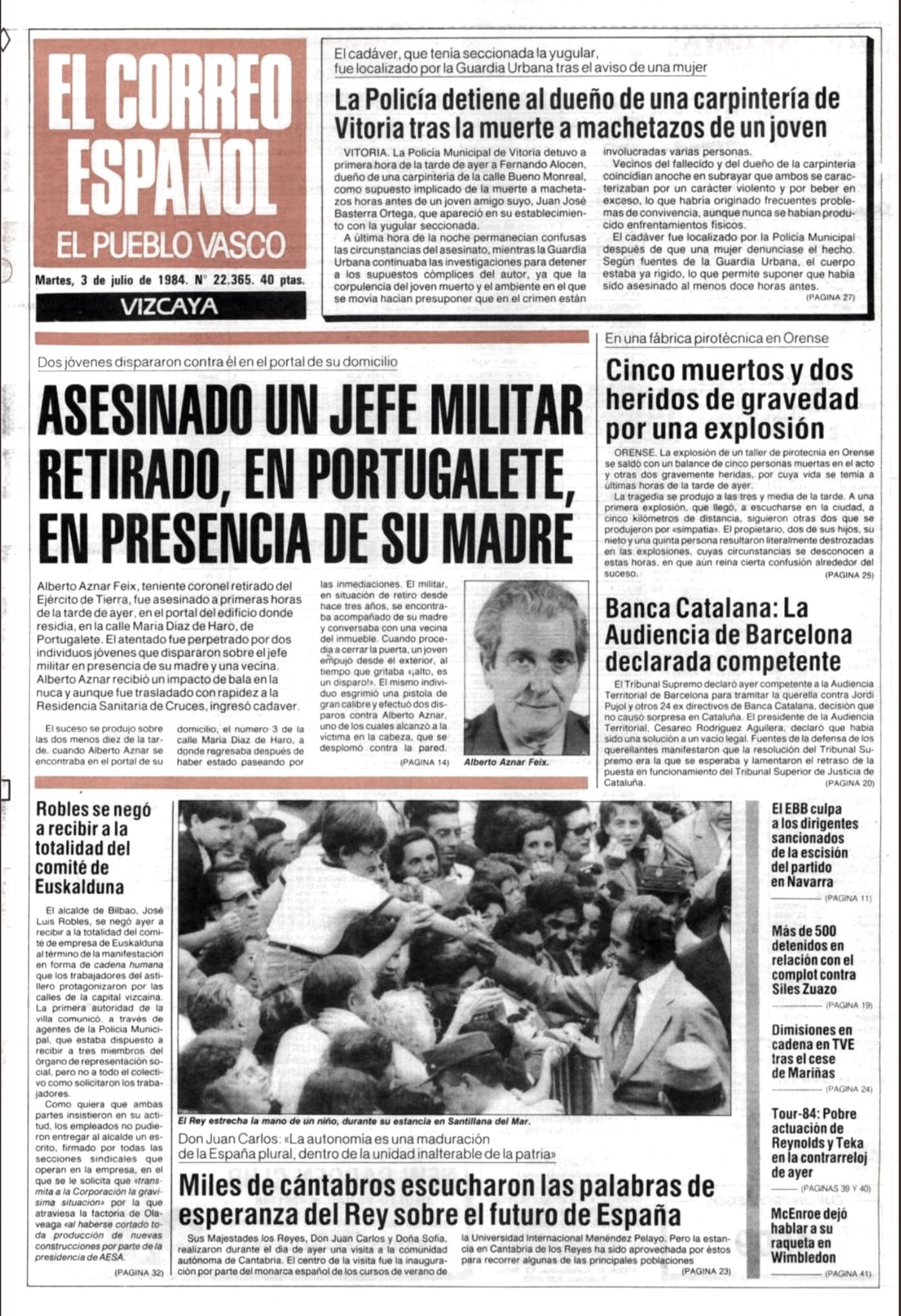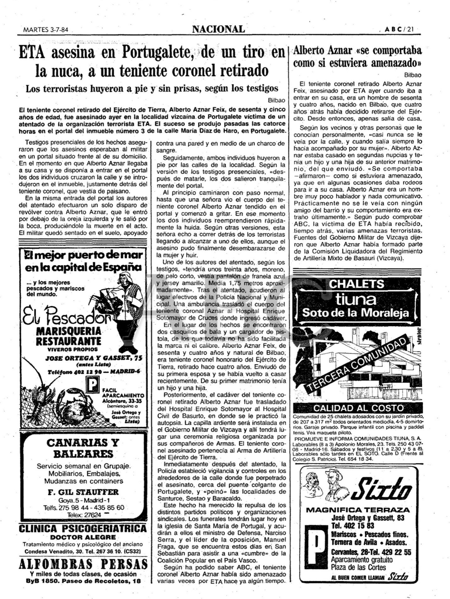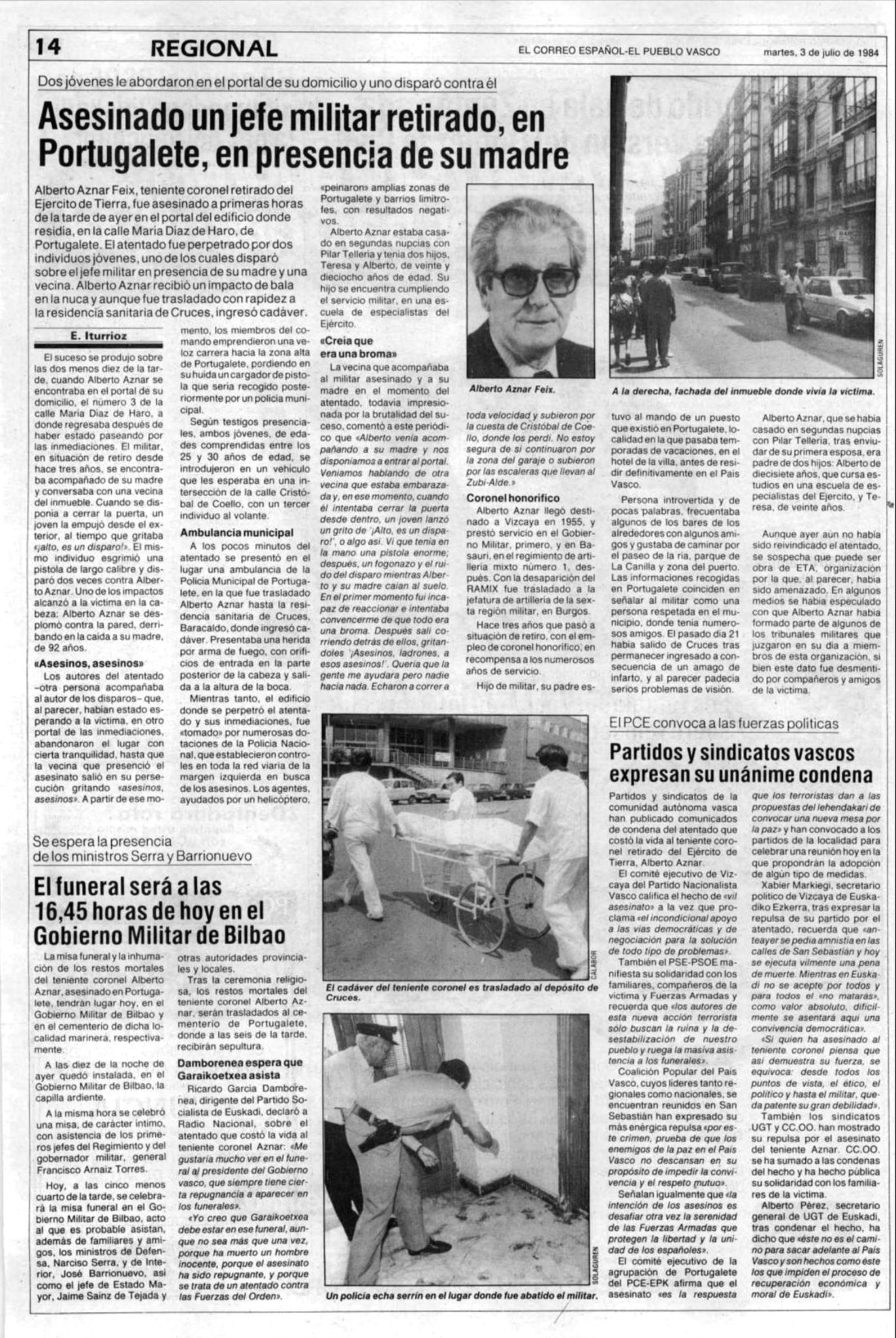 El 2 de julio de 1984 la banda terrorista ETA asesinaba a tiros en Portugalete al teniente coronel de Artillería retirado ALBERTO AZNAR FEIX. El asesinato se produjo en torno a las dos de la tarde en presencia de la madre del militar retirado, que tenía 92 años.