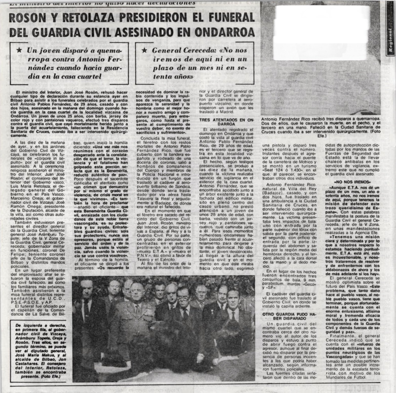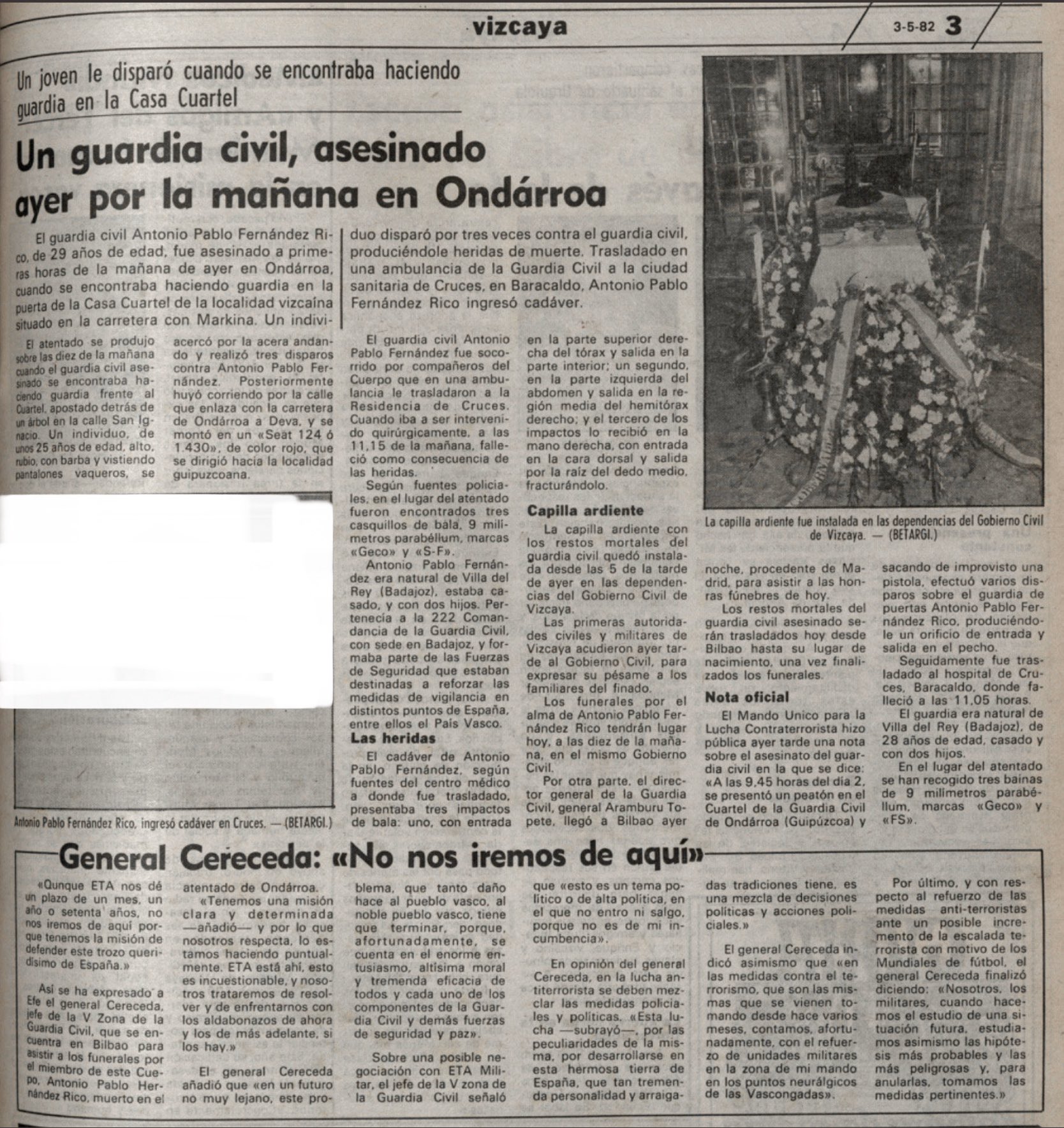 A las diez menos cuarto de la mañana del domingo 2 de mayo de 1982 la banda terrorista ETA asesinaba en la localidad vizcaína de Ondárroa al guardia civil PABLO FERNÁNDEZ RICO cuando custodiaba la casa cuartel de esa localidad vizcaína. Un terrorista se aproximó caminando y, cuando estuvo suficientemente cerca del guardia civil, le disparó tres tiros que le alcanzaron en el hombro, el brazo derecho y la región abdominal.