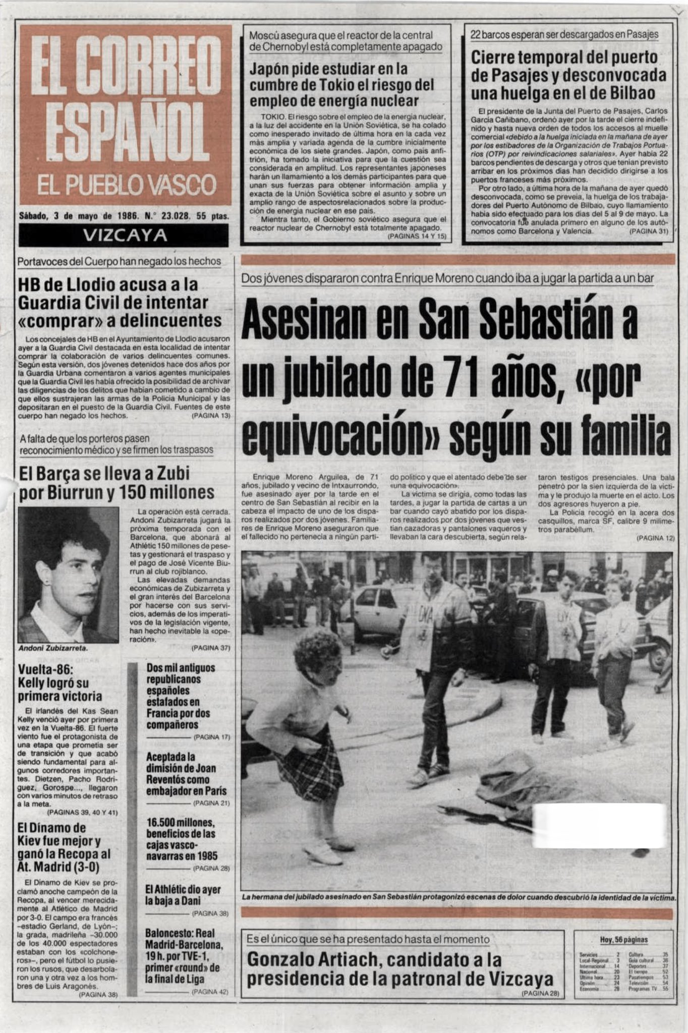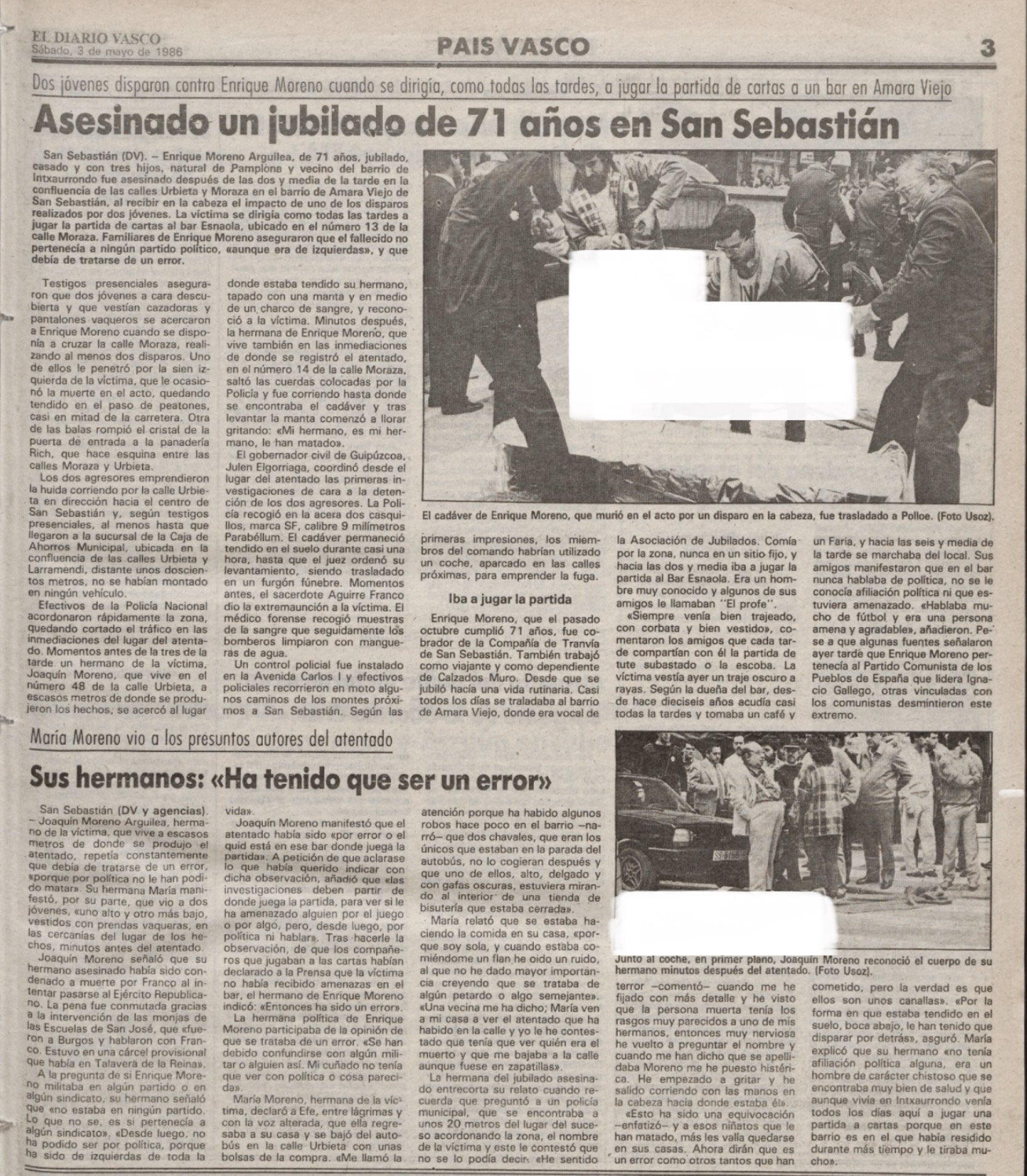 En torno a las 16:00 horas de la tarde del 2 de mayo de 1986, dos miembros de ETA asesinaban en la calle Moraza de San Sebastián a ENRIQUE MORENO ARGUILEA. Se acababa de bajar del autobús en el barrio donostiarra de Amara y le dispararon un tiro en la nuca cuando se dirigía al Bar Esnaola a jugar una partida de cartas con varios amigos. A continuación, los terroristas huyeron a pie.