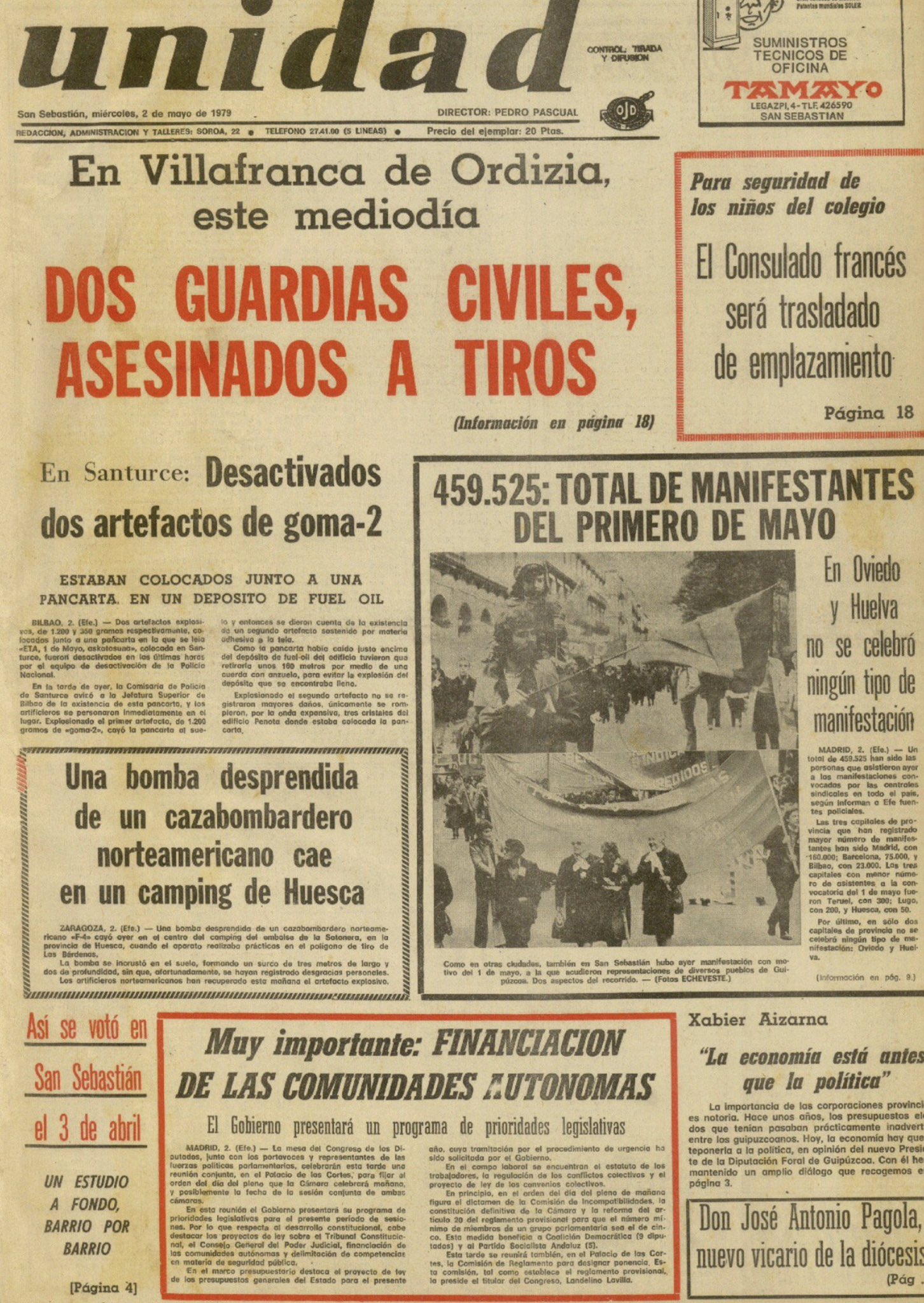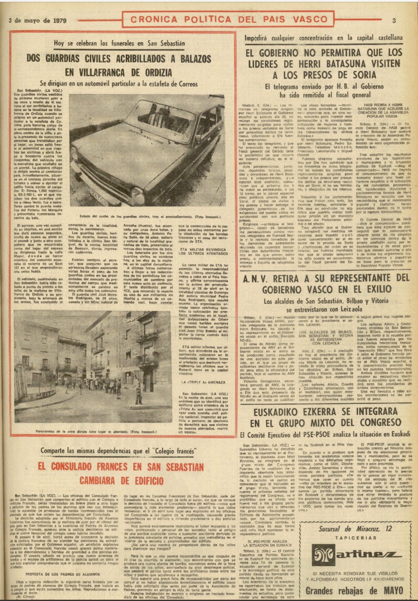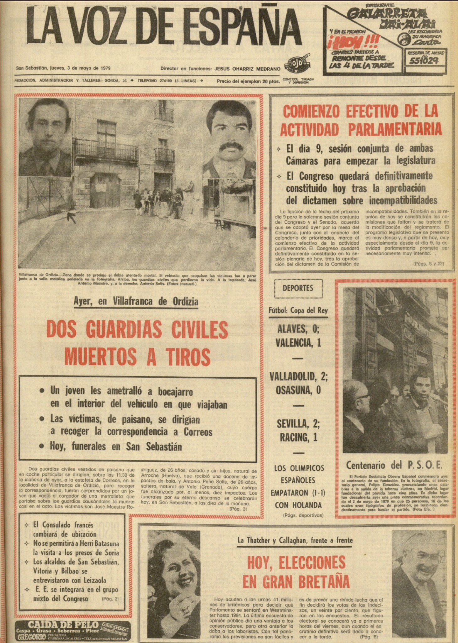 El miércoles 2 de mayo de 1979 ETA asesinaba en Villafranca de Ordicia (Guipúzcoa) a los guardias civiles ANTONIO PEÑA SOLÍS y JOSÉ MIGUEL MAESTRE RODRÍGUEZ.A las once y media de la mañana, como hacían diariamente, Antonio y José Miguel se dirigieron a la estafeta de Correos para recoger la correspondencia del cuartel. Iban vestidos de paisano en un coche particular. Era miércoles, día de mercado en la localidad, lo que obligaba a los coches a circular muy despacio. Cuando el vehículo se encontraba en la calle Mayor, dos etarras le salieron al paso. Uno de ellos, con una metralleta, se colocó delante del turismo y disparó una primera ráfaga. Después disparó una segunda ráfaga desde el costado derecho. A continuación se montaron en un vehículo donde les esperaba un tercer terrorista y huyeron del lugar.
