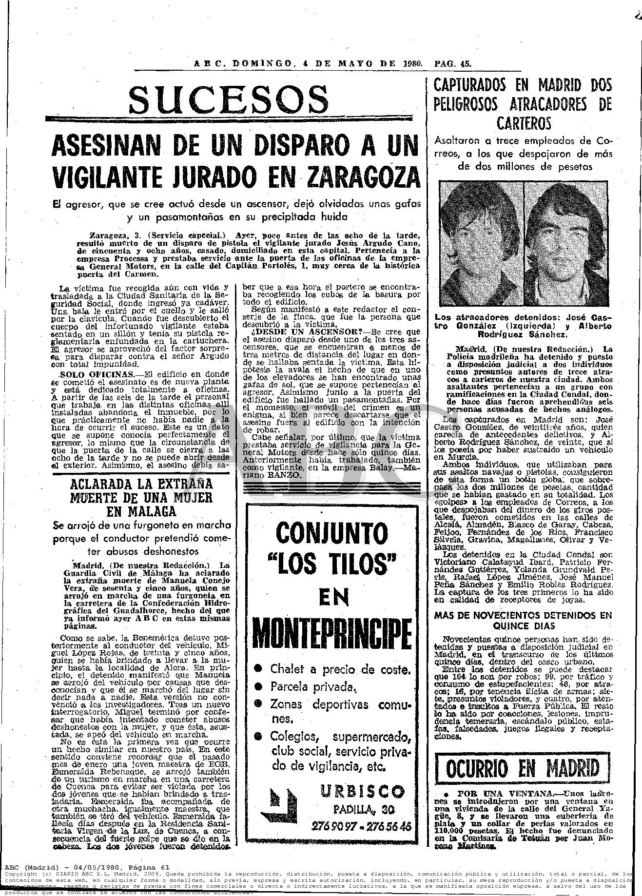 La tarde del 2 de mayo de 1980, el vigilante jurado Jesús Argudo Cano se encontraba a las puertas las oficinas de la General Motors en Zaragoza prestando sus servicios. Pasadas las 19.00 horas, varios individuos entraron en el edificio y dispararon contra él. La víctima quedó tendida en la silla y murió camino del hospital. Dos grupos terroristas reivindicaron el asesinato: el Frente Revolucionario Antifascista y Patriota (FRAP), que ya había desaparecido, y el Frente Revolucionario Antifascista Vasco Aragonés (FRAVA), hipótesis más probable.