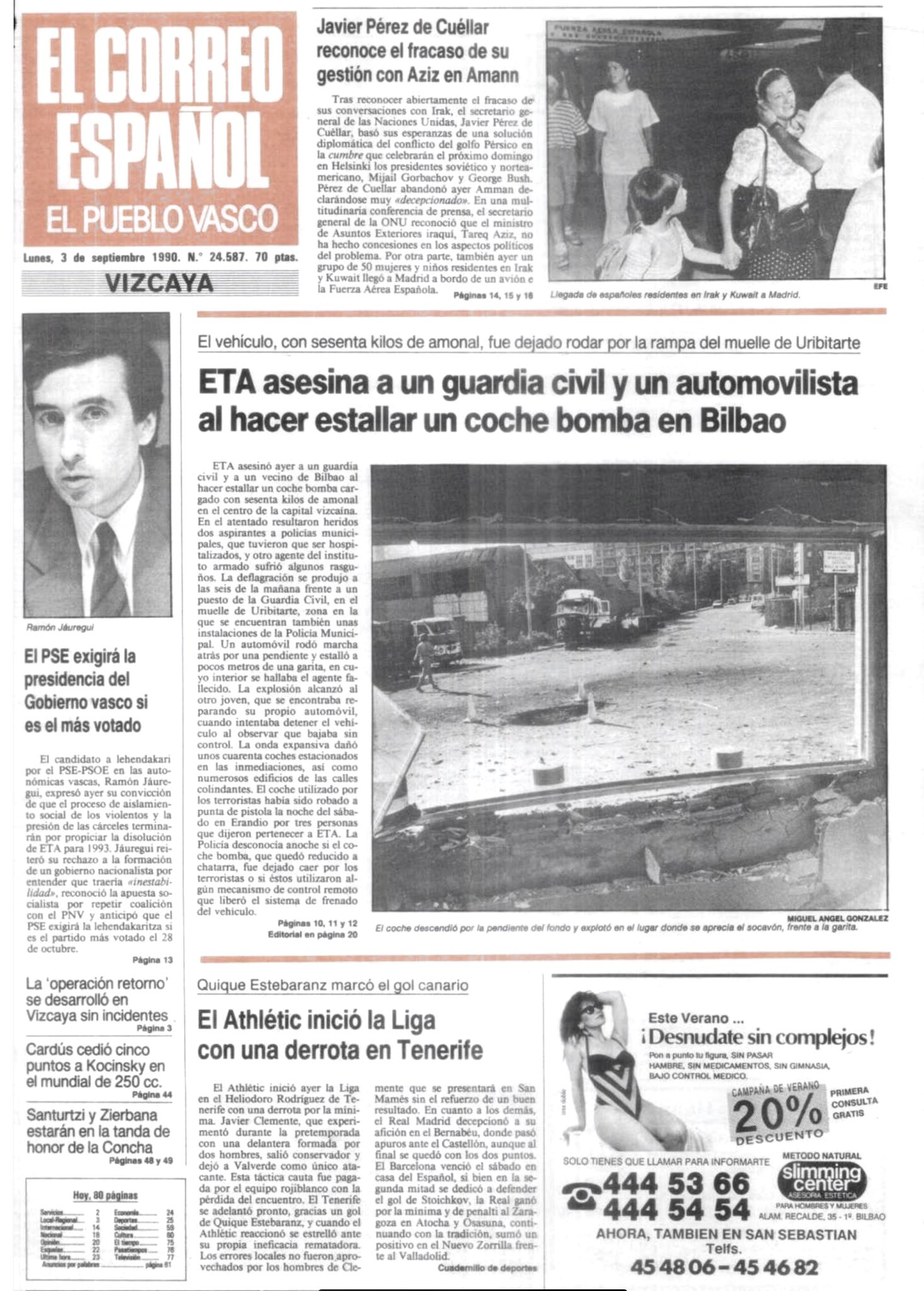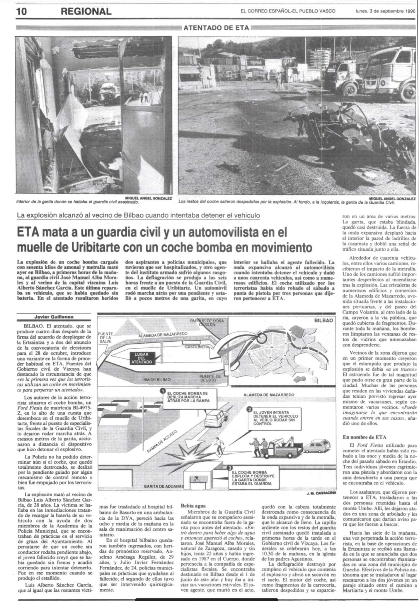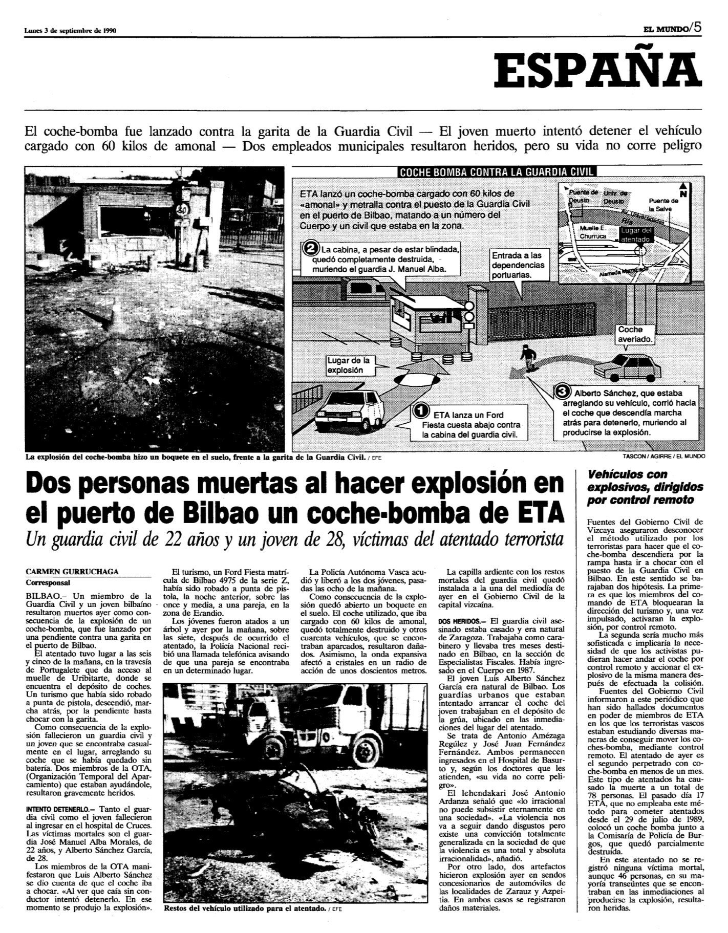 Hacia las seis de la mañana del 2 de septiembre de 1990 la banda terrorista ETA asesinaba al guardia civil JOSÉ MANUEL ALBA MORALES y al civil LUIS ALBERTO SÁNCHEZ GARCÍA mediante un coche-bomba lanzado por la rampa que daba acceso al muelle de Uribitarte del puerto de Bilbao. La rampa llevaba hasta la garita del Servicio Fiscal de la Guardia Civil donde trabajaba el agente Alba.