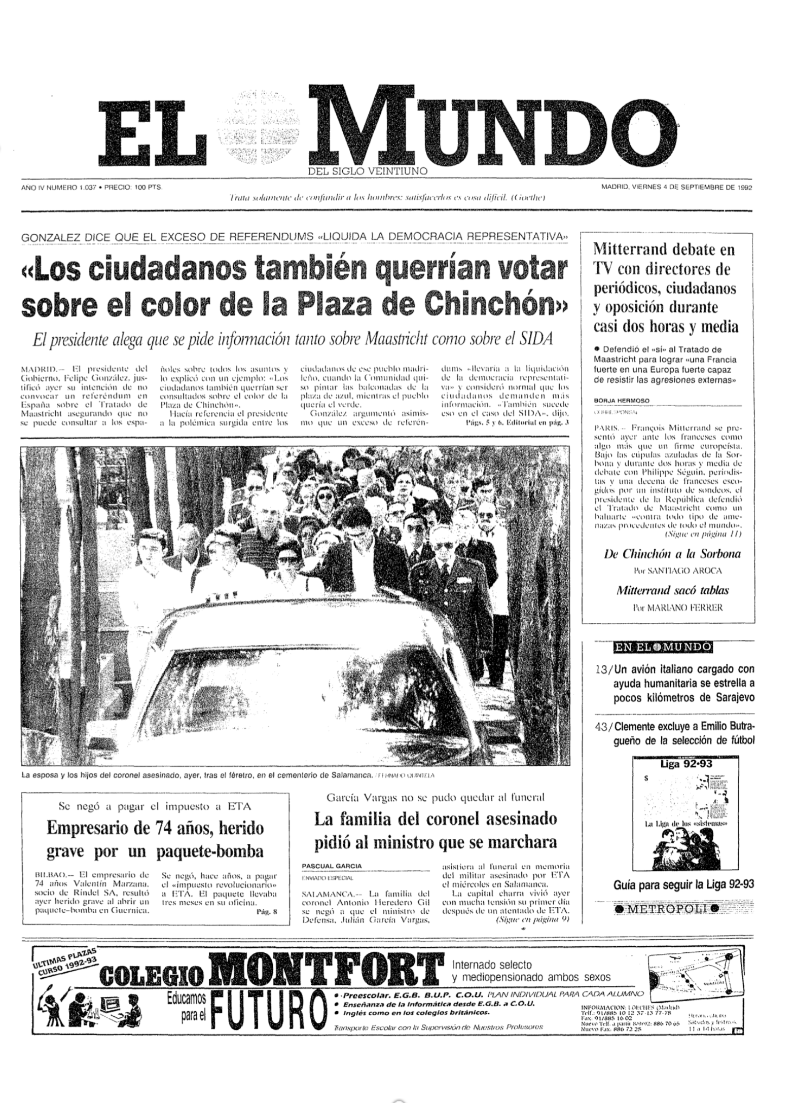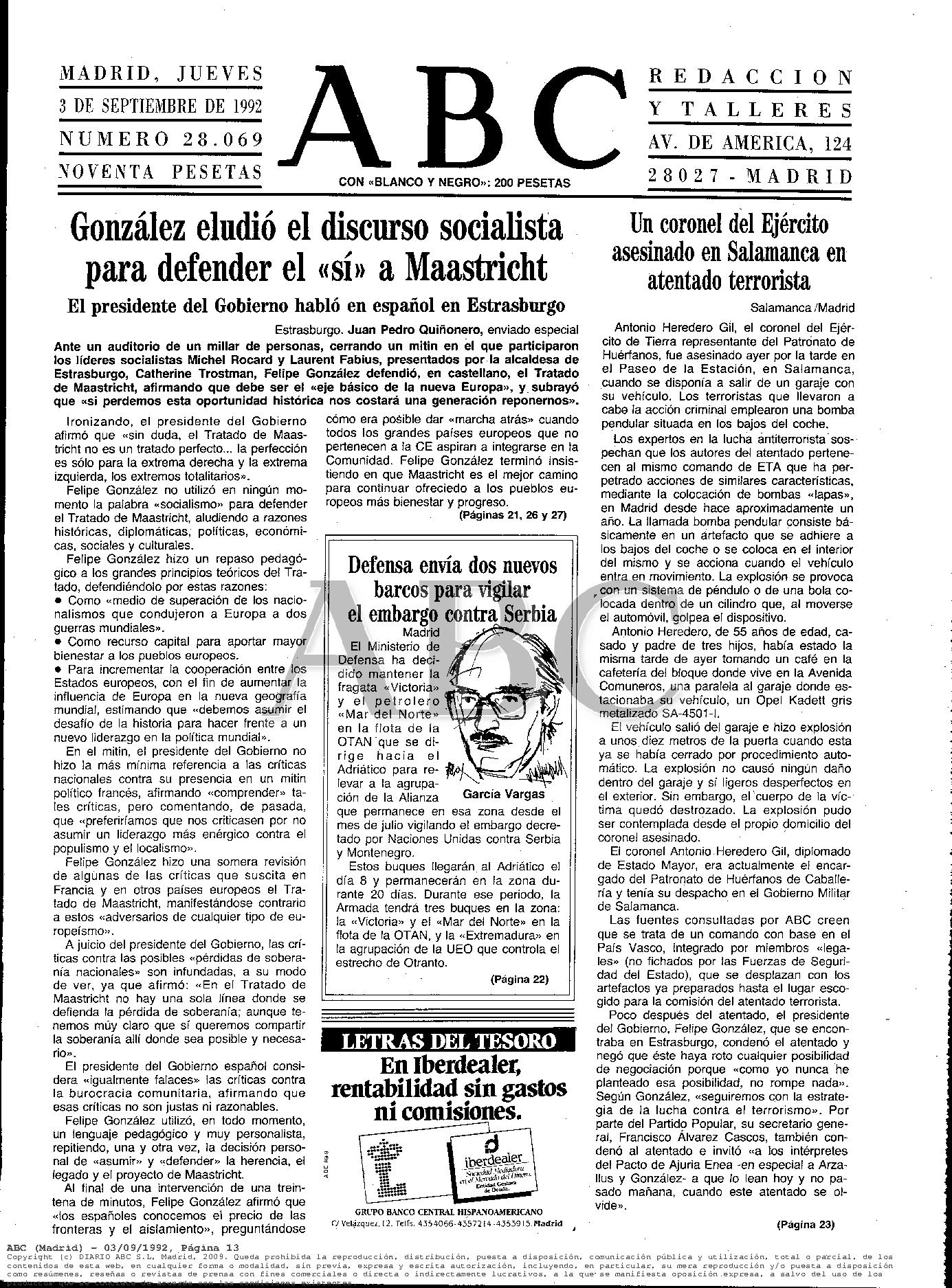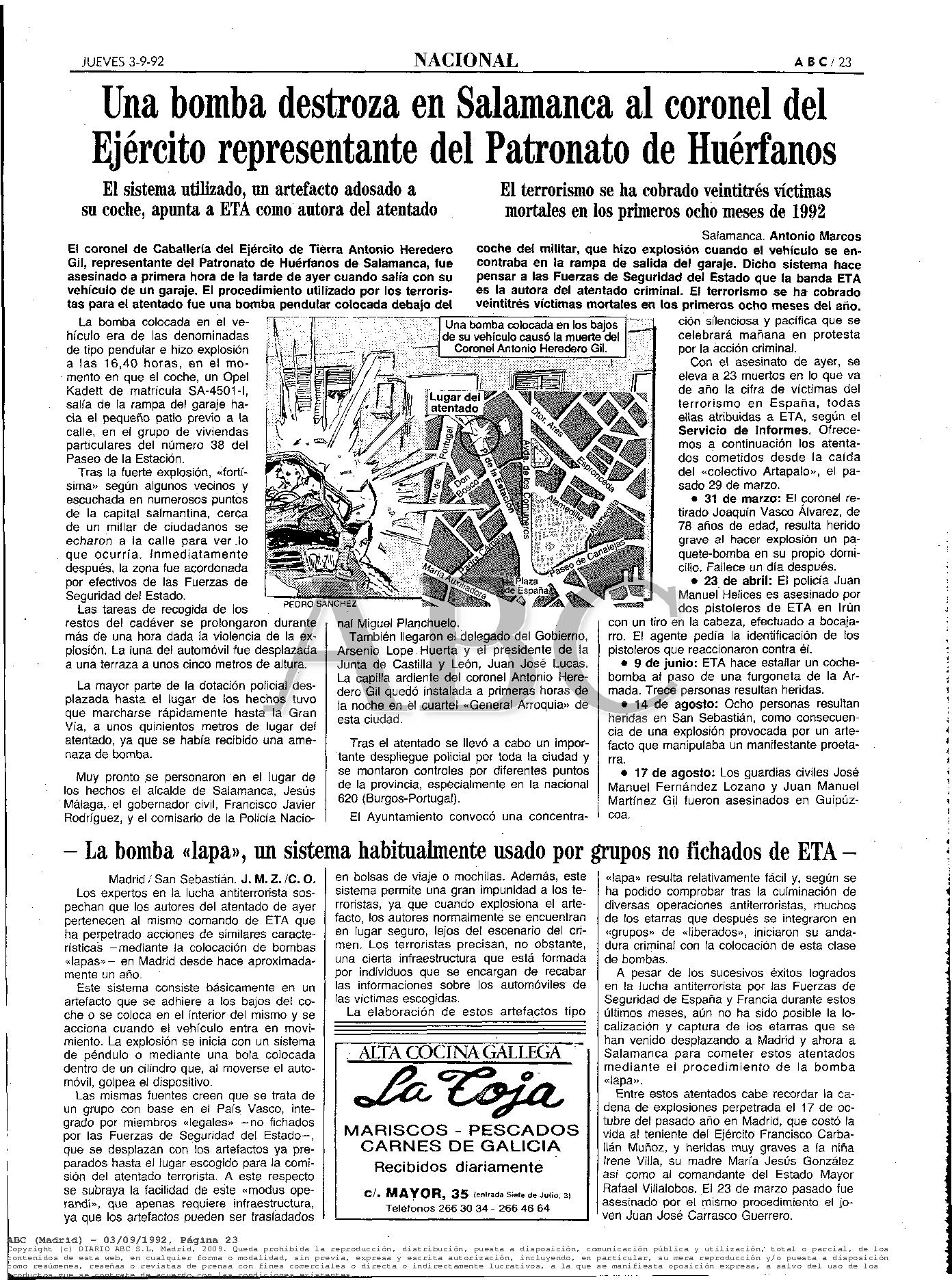 Hacia las 16:30 horas del 2 de septiembre de 1992, la banda terrorista ETA asesinaba en Salamanca al coronel del Ejército de Tierra en la reserva ANTONIO HEREDERO GIL mediante una bomba lapa adosada a los bajos de su coche que se activó por el sistema conocido como «de péndulo» al moverse el vehículo.