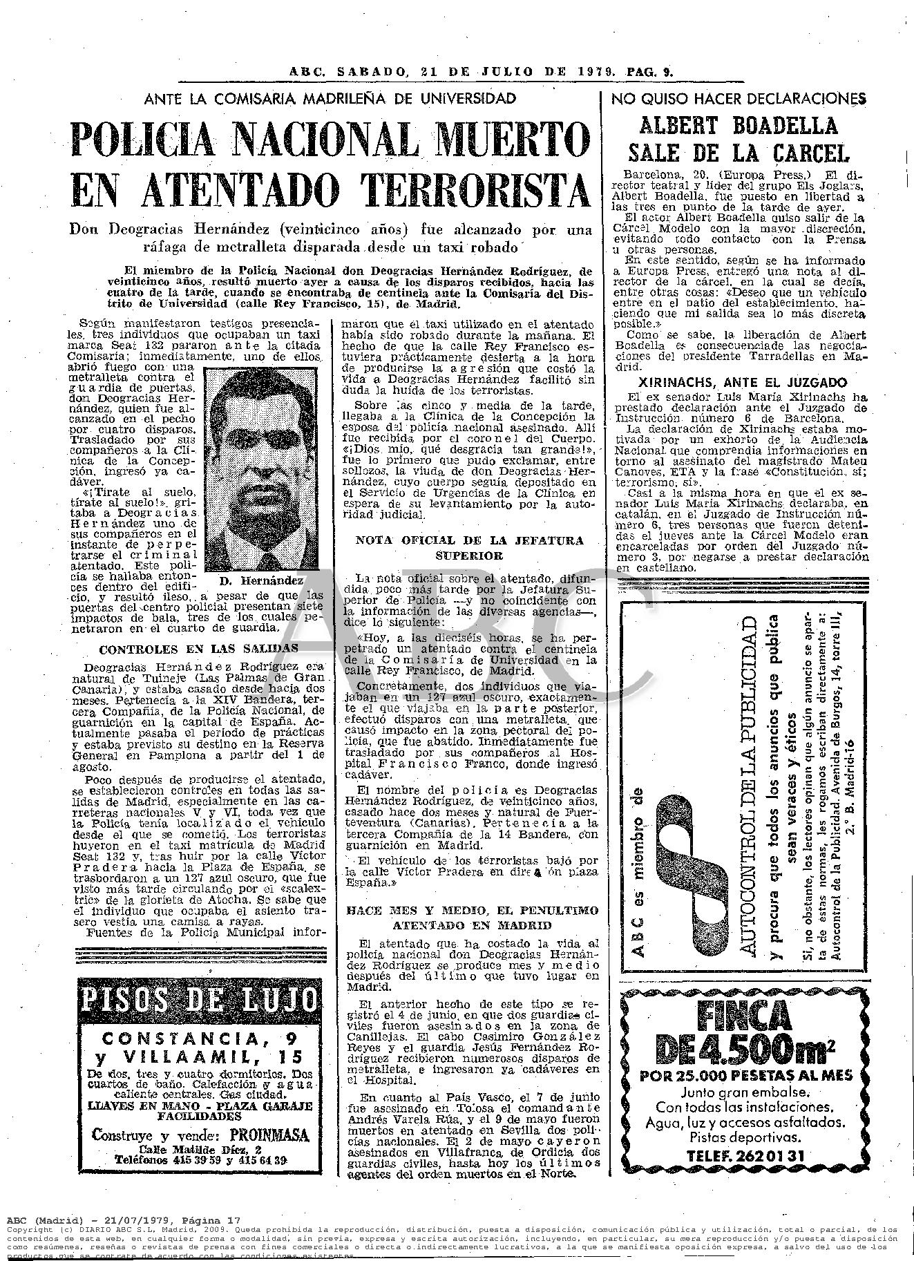 El 20 de julio de 1979, cuando el agente de la Policía Nacional Deogracias Hernández Rodríguez se encontraba de guardia a las puertas de la comisaría del distrito Universidad, varios terroristas de los GRAPO se acercaron a él en un taxi robado y dispararon una ráfaga con una metralleta. Eran cerca de las 16.00 y el agente recibió cuatro tiros en el tórax. Falleció al instante. Dos miembros del comando fueron detenidos por el asesinato una semana más tarde y otro murió en un enfrentamiento con las fuerzas y cuerpos de seguridad del Estado.