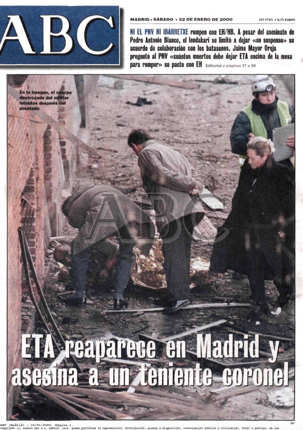 El 21 de enero de 2000 la banda terrorista ETA asesina en Madrid el teniente coronel del Ejército PEDRO ANTONIO BLANCO GARCÍA. El año 2000 fue especialmente duro. Con 23 personas asesinadas, rompió la tendencia a la baja que se inició en 1993. Además, y como respuesta a la firma del Acuerdo por las Libertades y Contra el Terrorismo entre PP y PSOE, los concejales socialistas pasaron también a ser objetivo prioritario de ETA, como ya ocurría con los dirigentes y personajes relevantes del PSOE y con todos los cargos del PP, del nivel que fuesen.