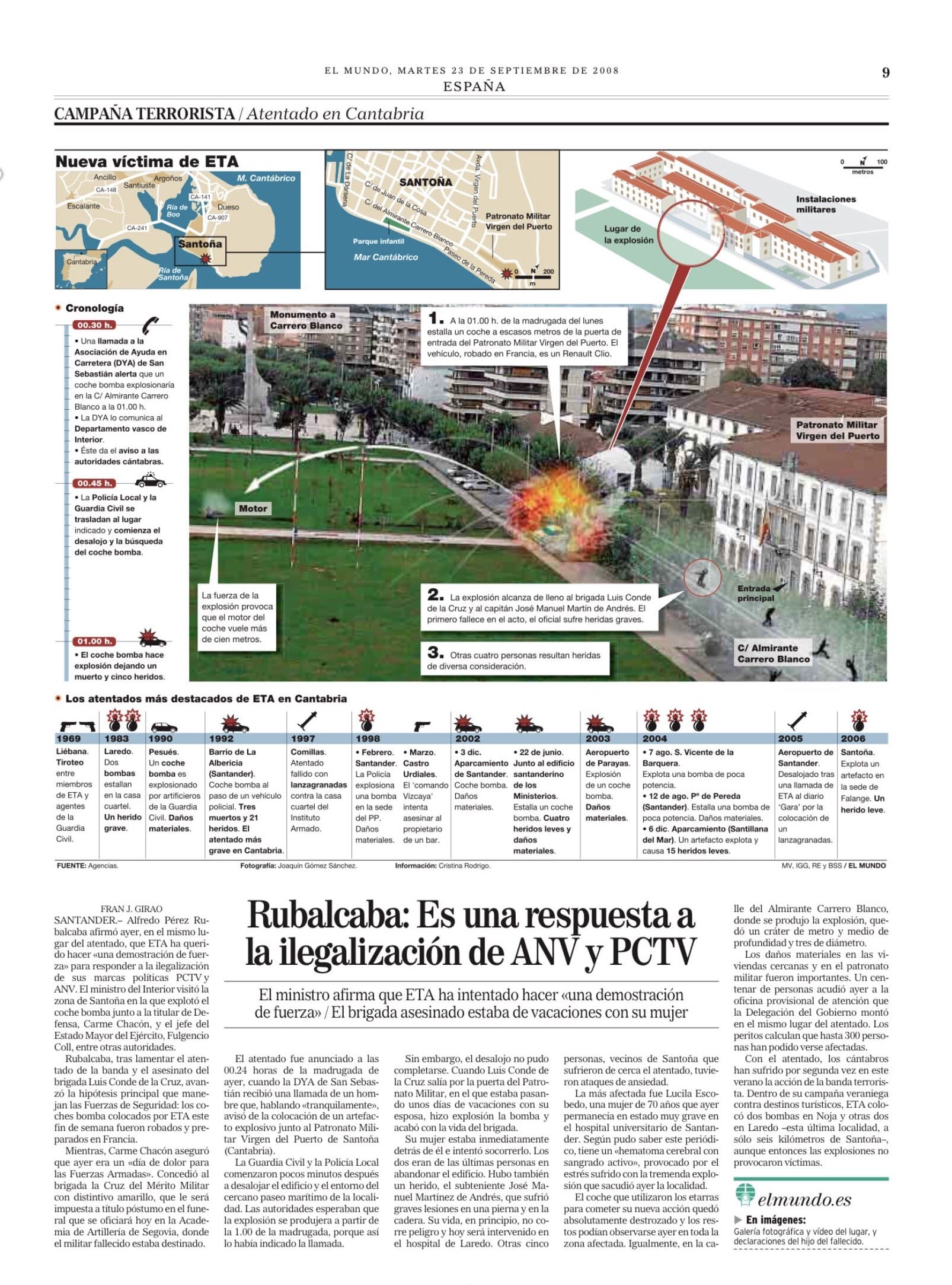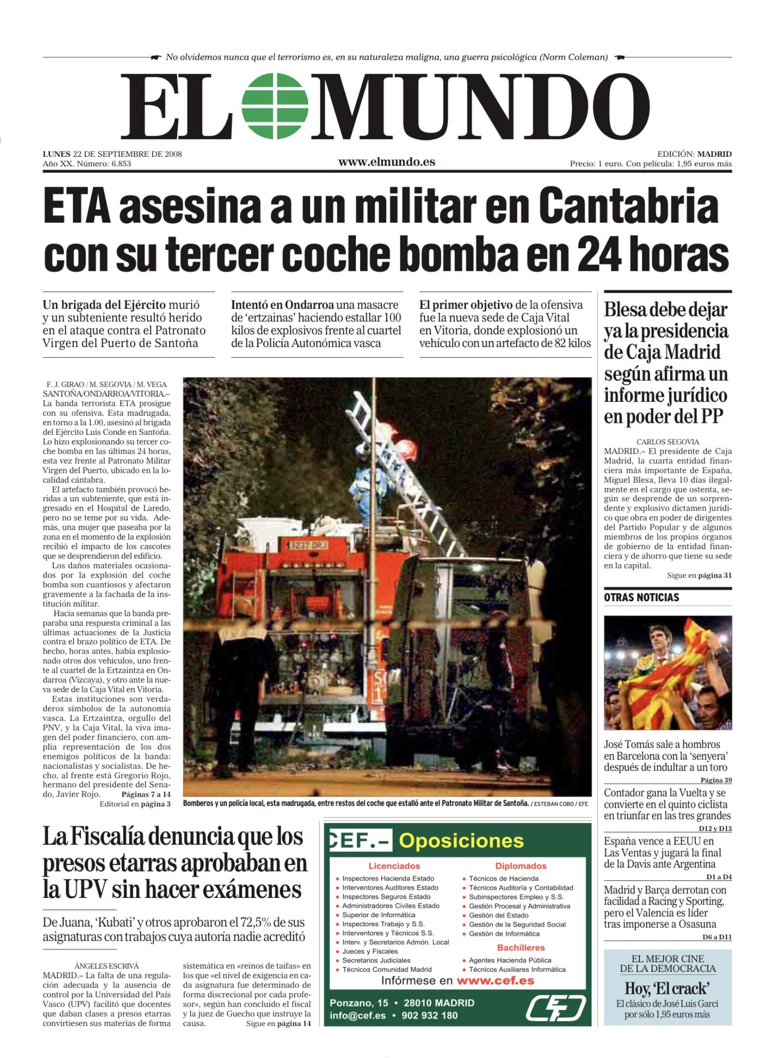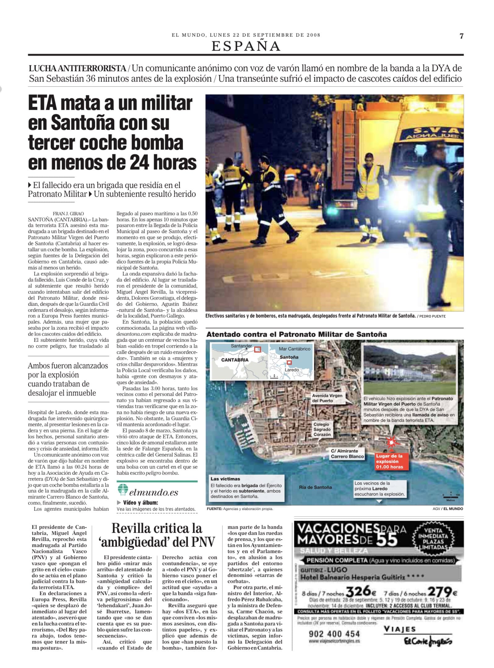 El 22 de septiembre de 2008 la banda terrorista ETA asesinaba en Santoña (Cantabria) al brigada del Ejército de Tierra LUIS CONDE DE LA CRUZ, mediante la explosión de un coche-bomba. En el atentado resultó herido grave otro militar, José Manuel Martín de Andrés, capitán del cuerpo sanitario del Ejército en Zaragoza, que fue ingresado en el Hospital de Laredo con una fractura abierta de fémur, aunque su vida no corría peligro.