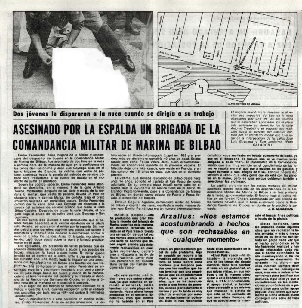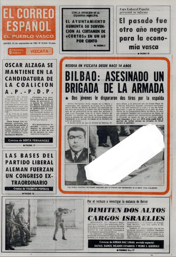 A primera hora de la mañana del 22 de septiembre de 1982, la banda terrorista ETA asesinaba en la localidad vizcaína de Erandio, de dos tiros en la cabeza, al brigada de la Armada EMILIO FERNÁNDEZ ARIAS.