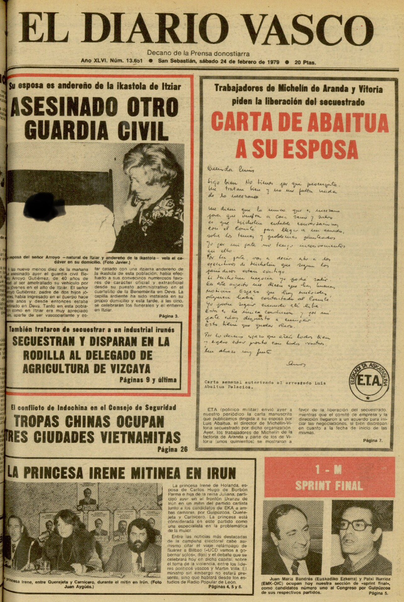 Benito Arroyo Gutiérrez, nacido en Salamanca, tenía 41 años cuando fue asesinado. Llevaba veinte destinado en el cuartel del Instituto Armado de Deba. Estaba casado con Maite Alcíbar, guipuzcoana, maestra en una ikastola de Icíar. Benito, de hecho, hablaba perfectamente el euskera. Tenían dos hijos, de 12 y 14 años.