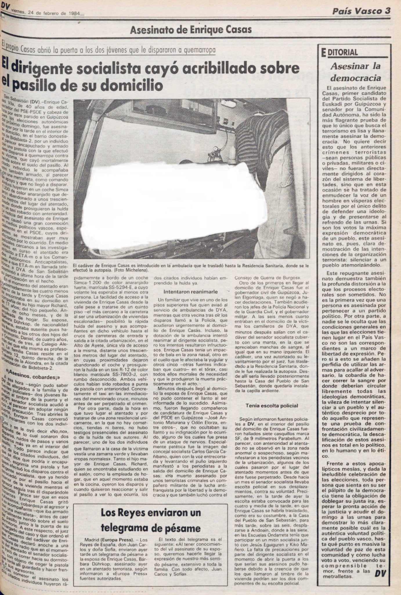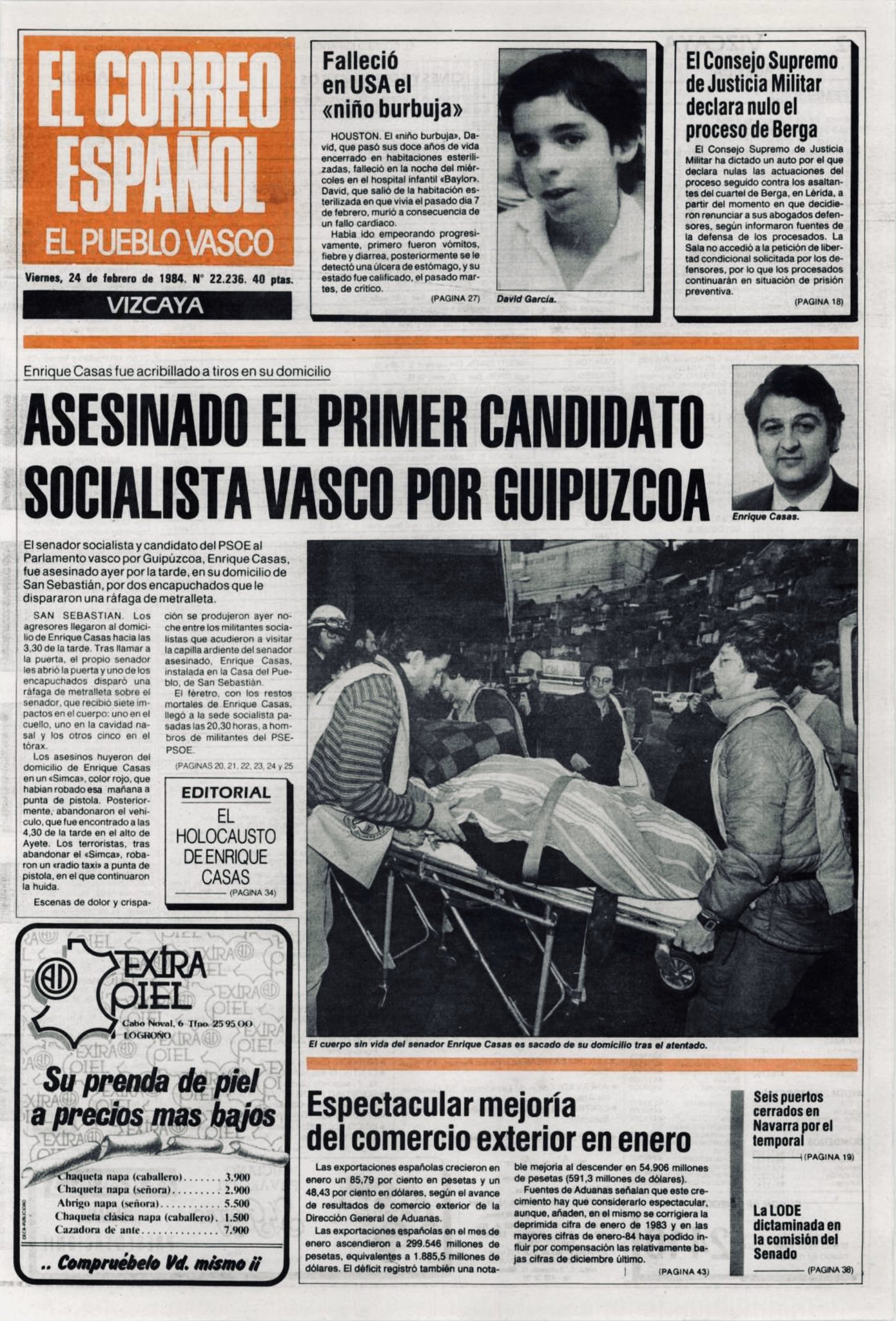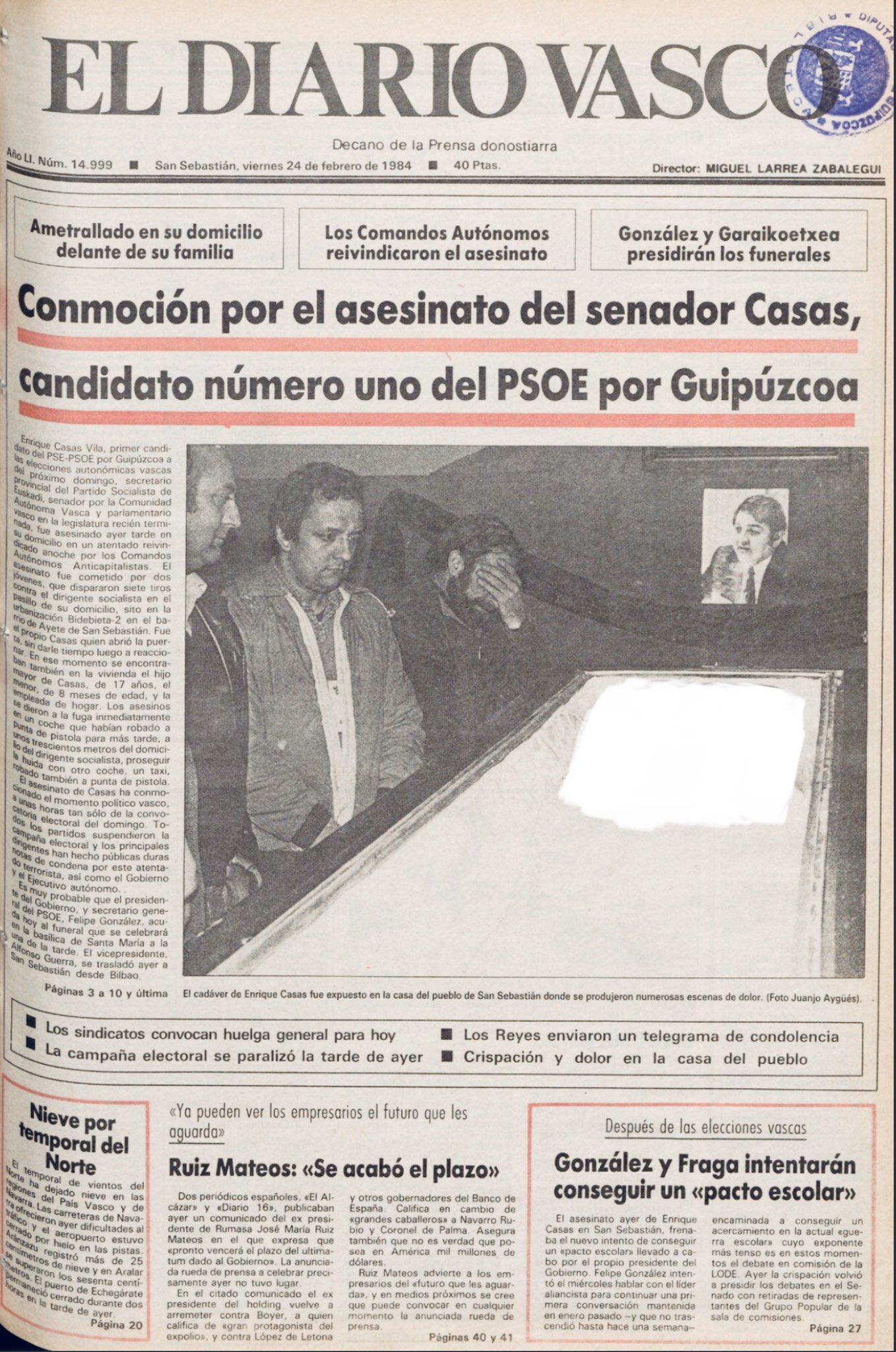 A tres días de las elecciones autonómicas, el 23 de febrero de 1984, era asesinado en la puerta de su domicilio en San Sebastián ENRIQUE CASAS VILA, senador del PSOE, parlamentario vasco, secretario de organización del PSE-PSOE, candidato número uno por Guipúzcoa en las elecciones autonómicas y miembro de la Junta de Seguridad de la Comunidad Autónoma Vasca.