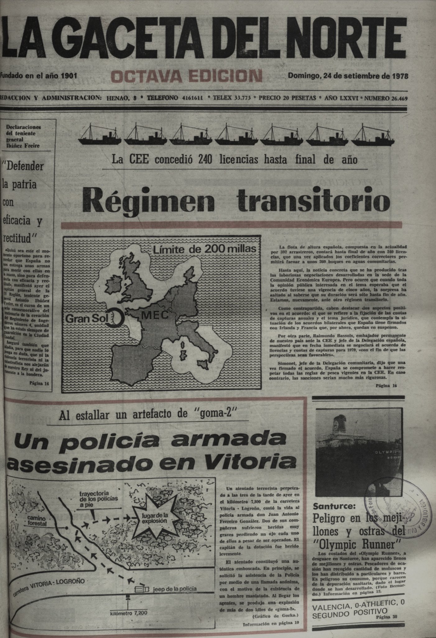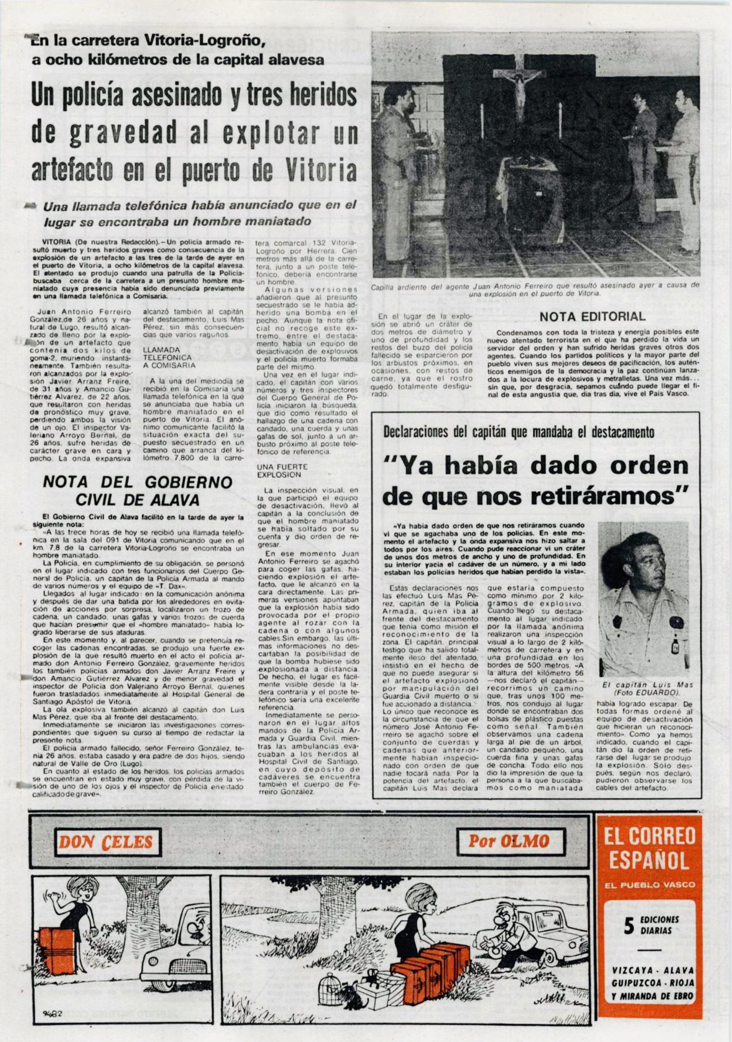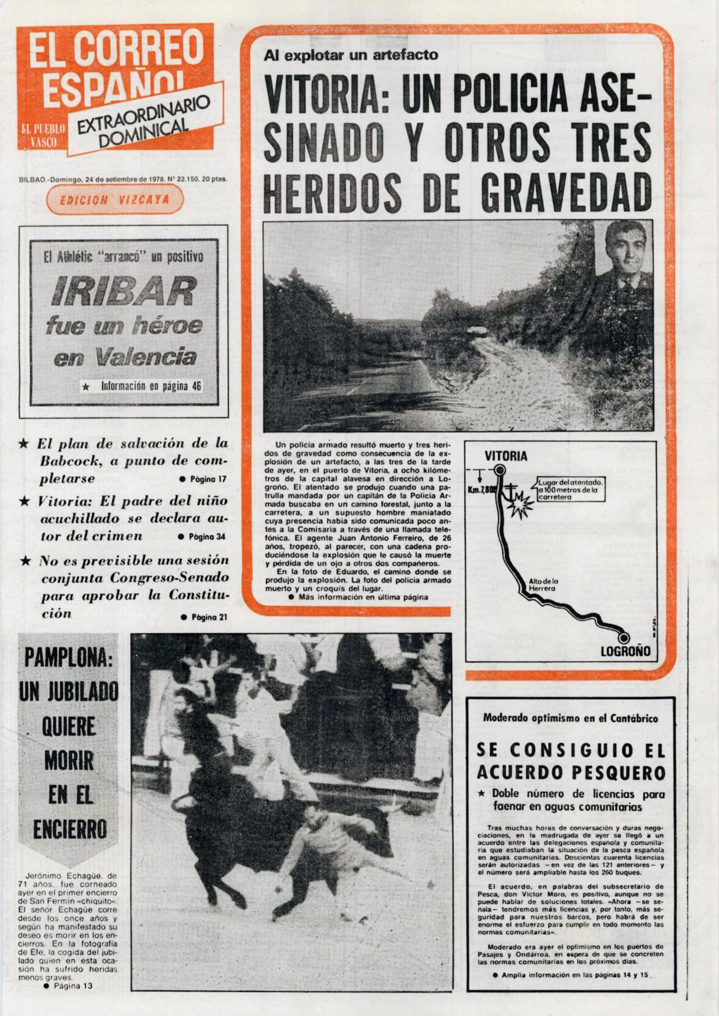 A las tres de la tarde del sábado 23 de septiembre de 1978, la banda terrorista ETA asesinaba al agente de la Policía Armada JOSÉ ANTONIO FERREIRO GONZÁLEZ mediante una bomba trampa colocada en las proximidades del puerto de Vitoria.