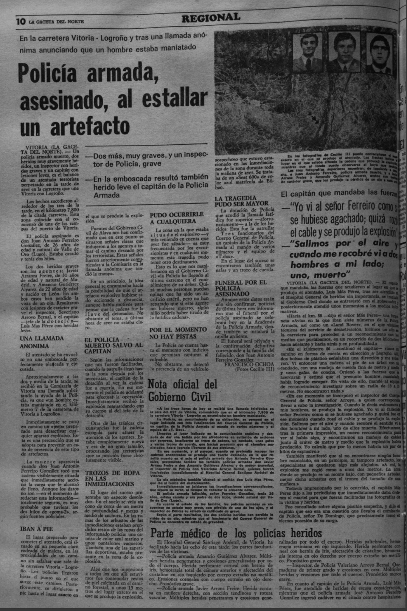 La explosión hirió de gravedad a otros cuatro agentes: Javier Arranz Freire, Amancio Gutiérrez Álvarez, Valeriano Arroyo Bernal y el capitán que mandaba el destacamento, Luis Más Pérez. El agente Arranz Freire, de 31 años, y el agente Gutiérrez Álvarez, de 22, perdieron la visión de un ojo cada uno de ellos a causa de la explosión. El inspector Arroyo Bernal, de 26 años, sufrió heridas de carácter grave en la cara y el pecho.