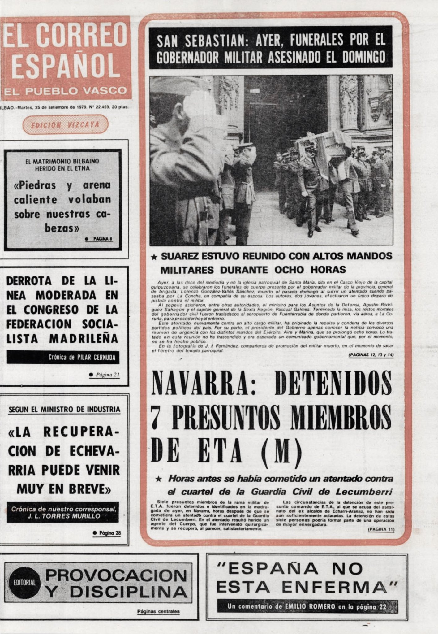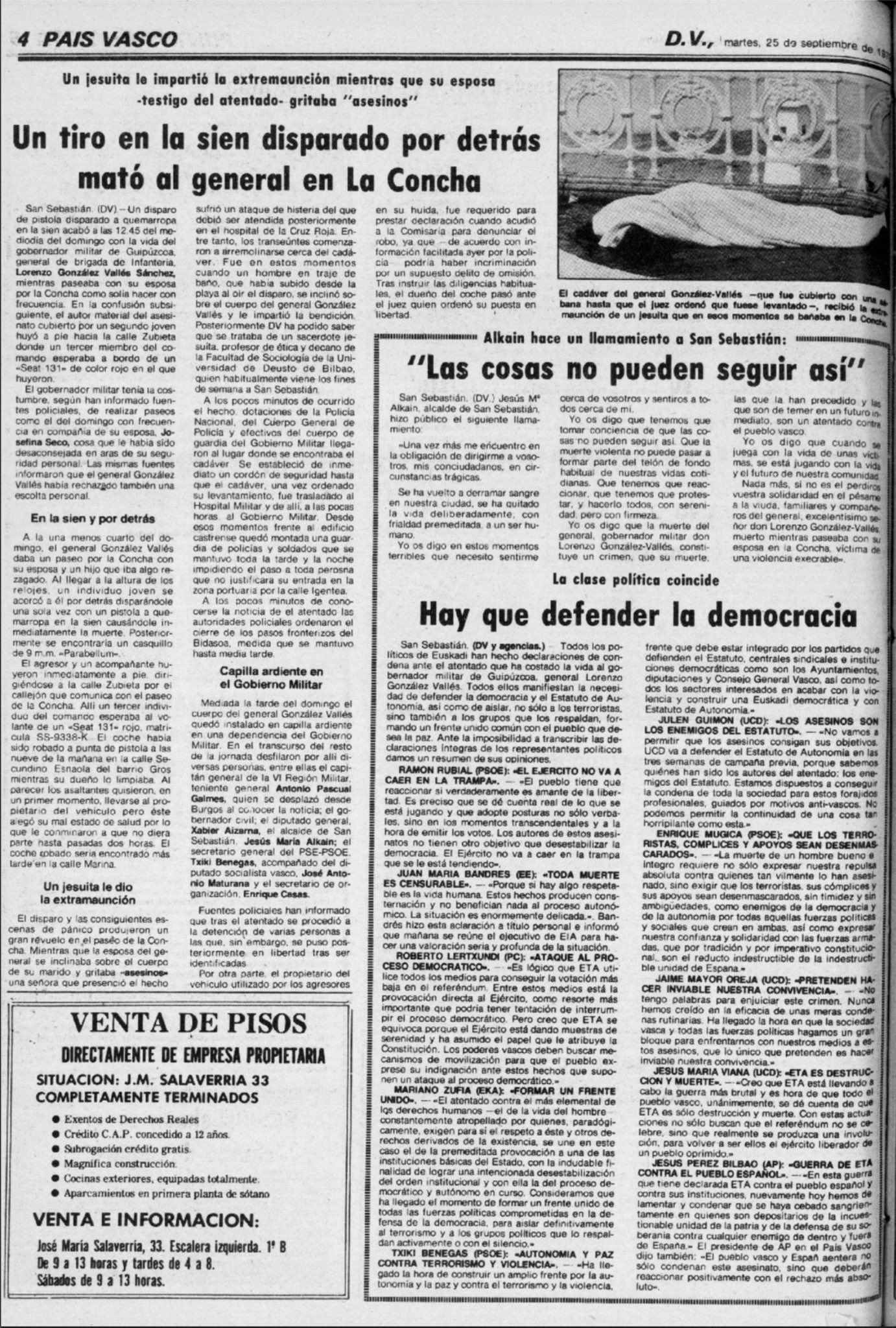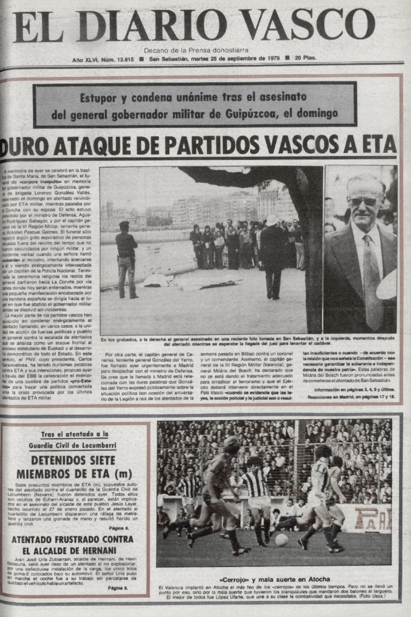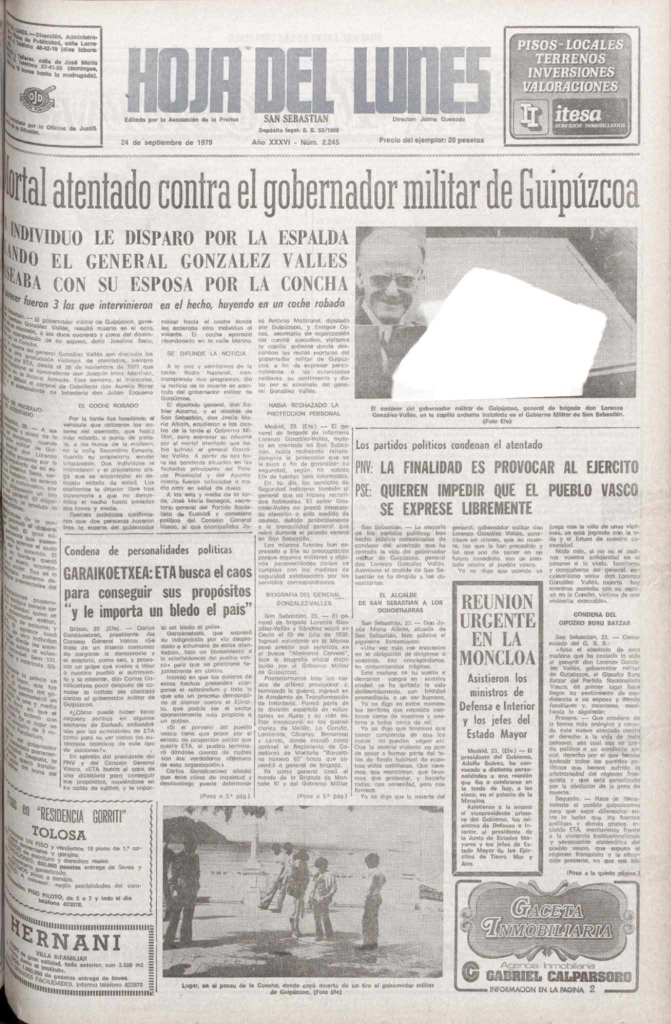 Un año después, a las doce menos cuarto del mediodía del domingo 23 de septiembre de 1979, la banda terrorista ETA asesinaba en el paseo de La Concha de San Sebastián de un tiro en la sien al gobernador militar de Guipúzcoa, el general LORENZO GONZÁLEZ-VALLÉS SÁNCHEZ.