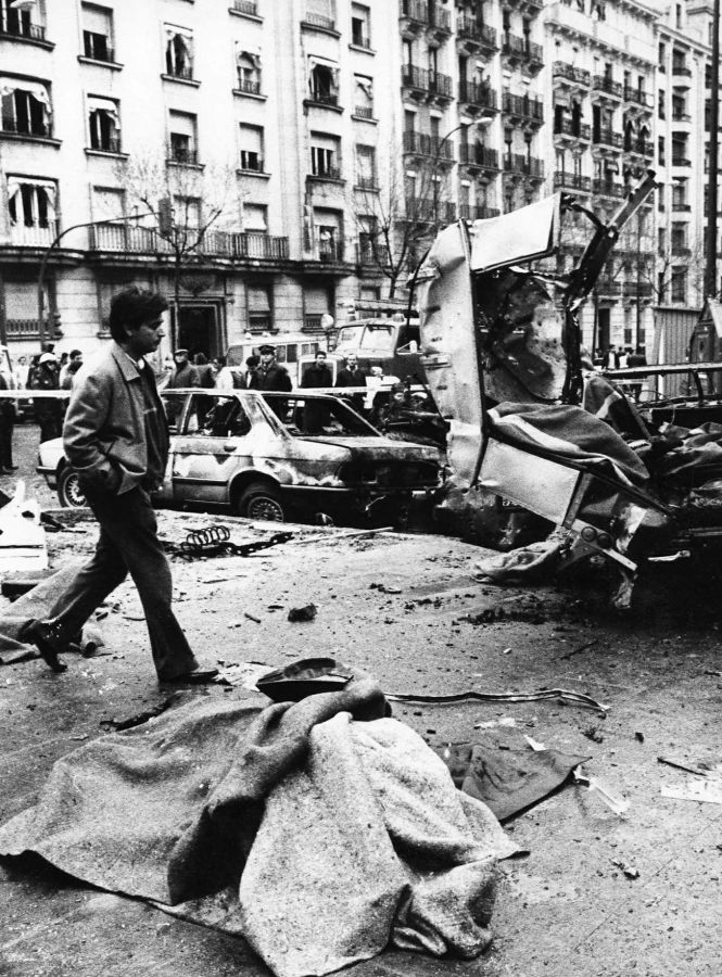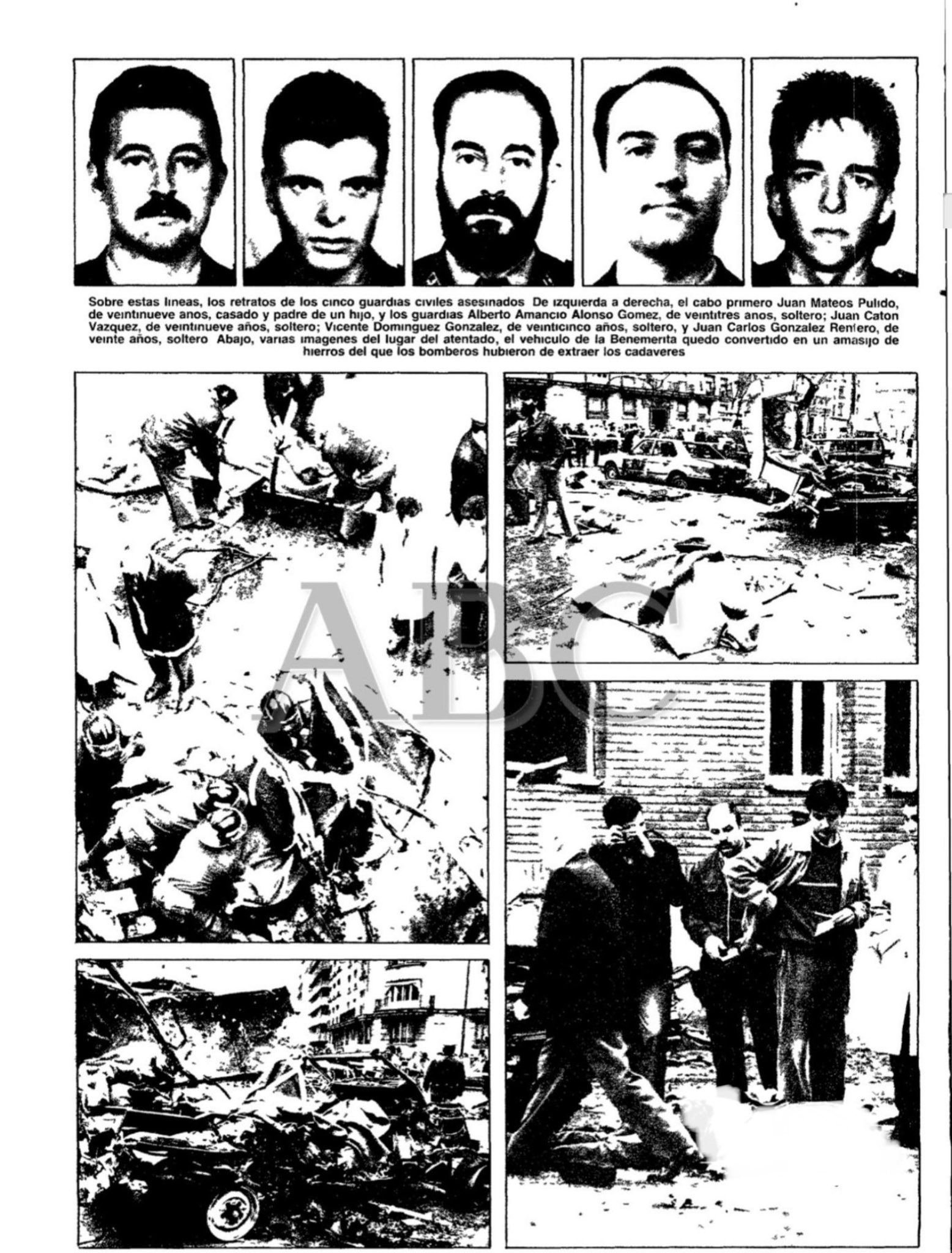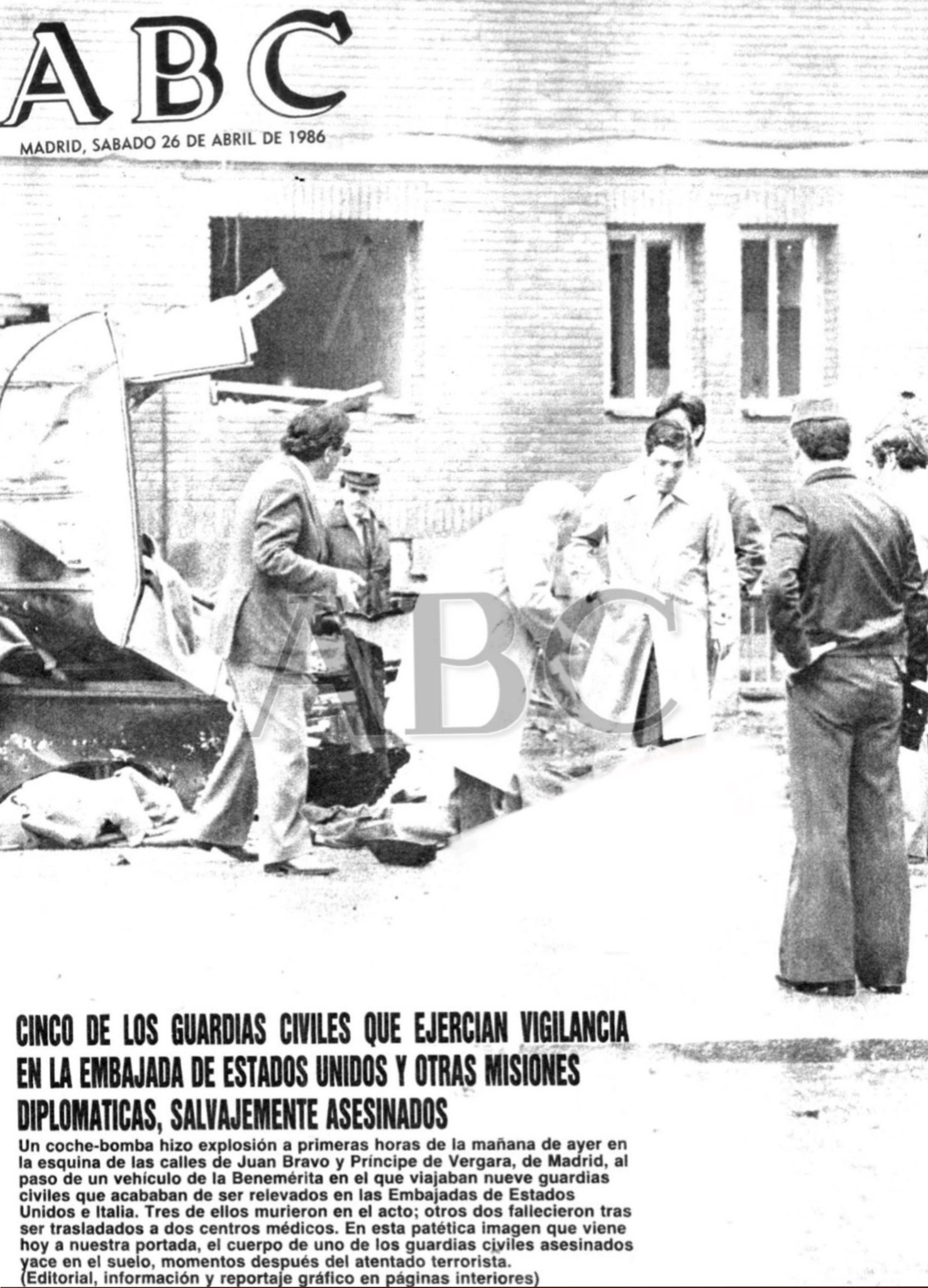 Poco después de las siete y cuarto de la mañana del 25 de abril de 1986, cinco miembros de la Guardia Civil resultaron muertos, y cuatro más heridos graves, en un atentado terrorista con coche-bomba cometido por ETA en pleno centro de Madrid. El coche contenía tres ollas a presión con doce kilos de Goma 2, otros doce de amonal y cuarenta y ocho kilos de metralla, la mayor parte tornillos.