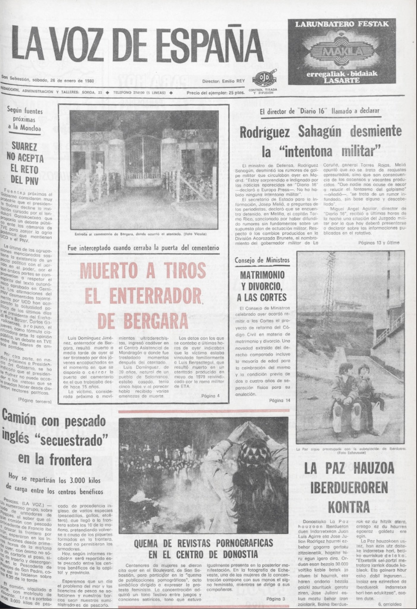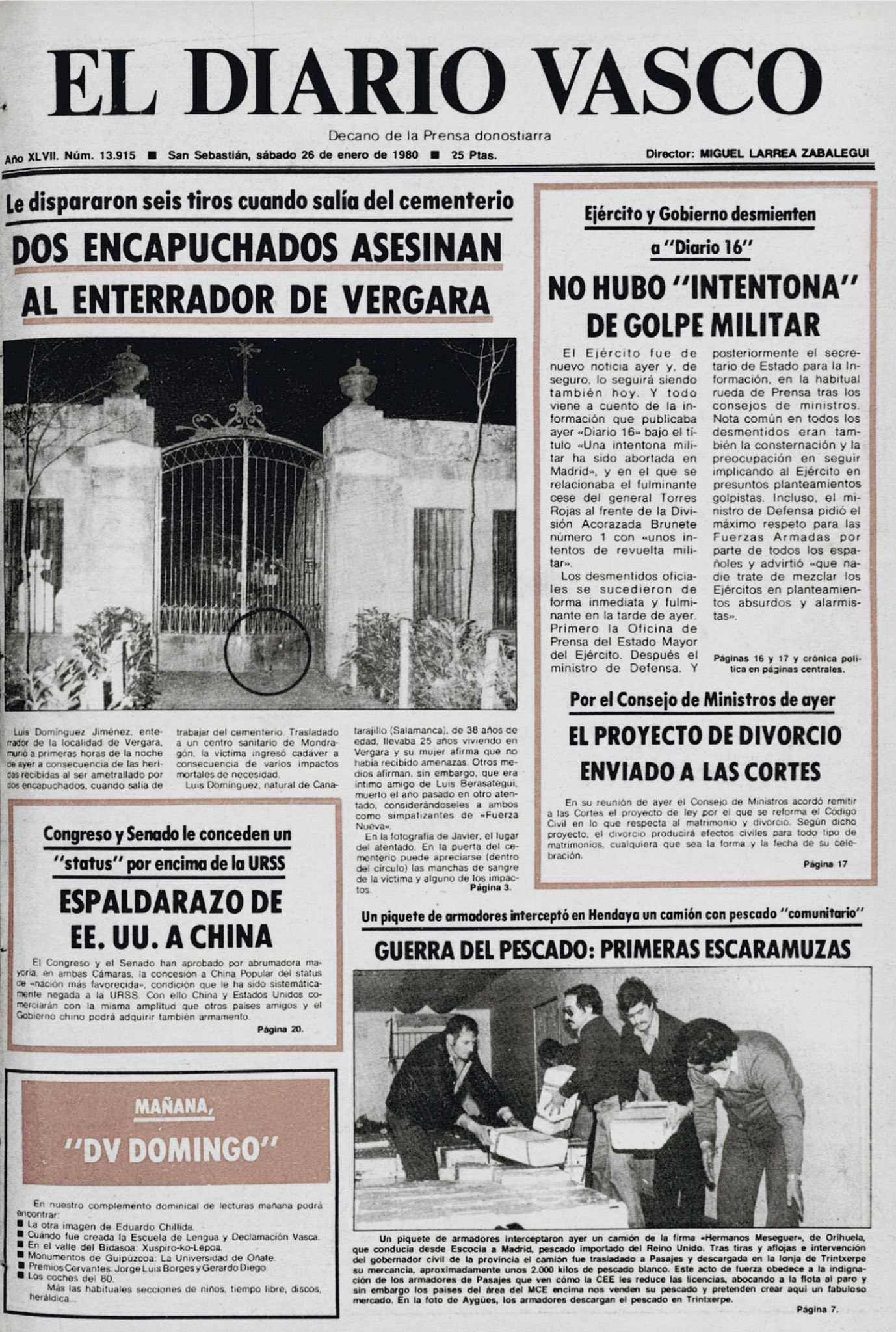 El 25 de enero de 1980 la banda terrorista ETA asesinaba a LUIS DOMÍNGUEZ JIMÉNEZ, sepulturero de Vergara (Guipúzcoa). Como tantas otras veces «alguien» le había colgado a Luis el sambenito de colaborador de las Fuerzas de Seguridad, concretamente de la Guardia Civil.