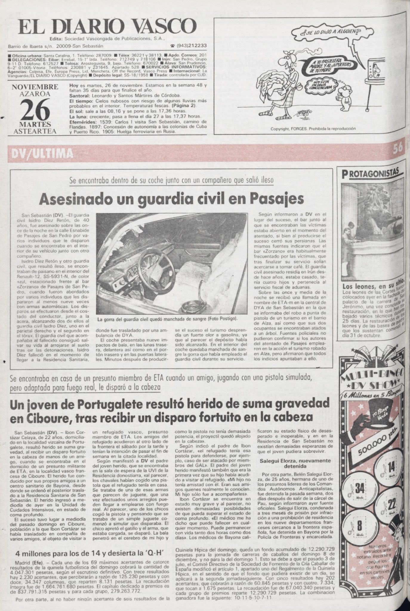 Quince horas después, a las once y cinco de la noche del 25 de noviembre de 1985, la banda terrorista ETA volvía a asesinar, esta vez en Pasajes (Guipúzcoa) al guardia civil ISIDORO DÍEZ RATÓN, que fue ametrallado en el barrio de San Pedro de esta localidad, cerca del muelle. Isidoro y su compañero, el guardia civil Juan Corrales Pozas, tenían encomendada esa noche la vigilancia del puerto.