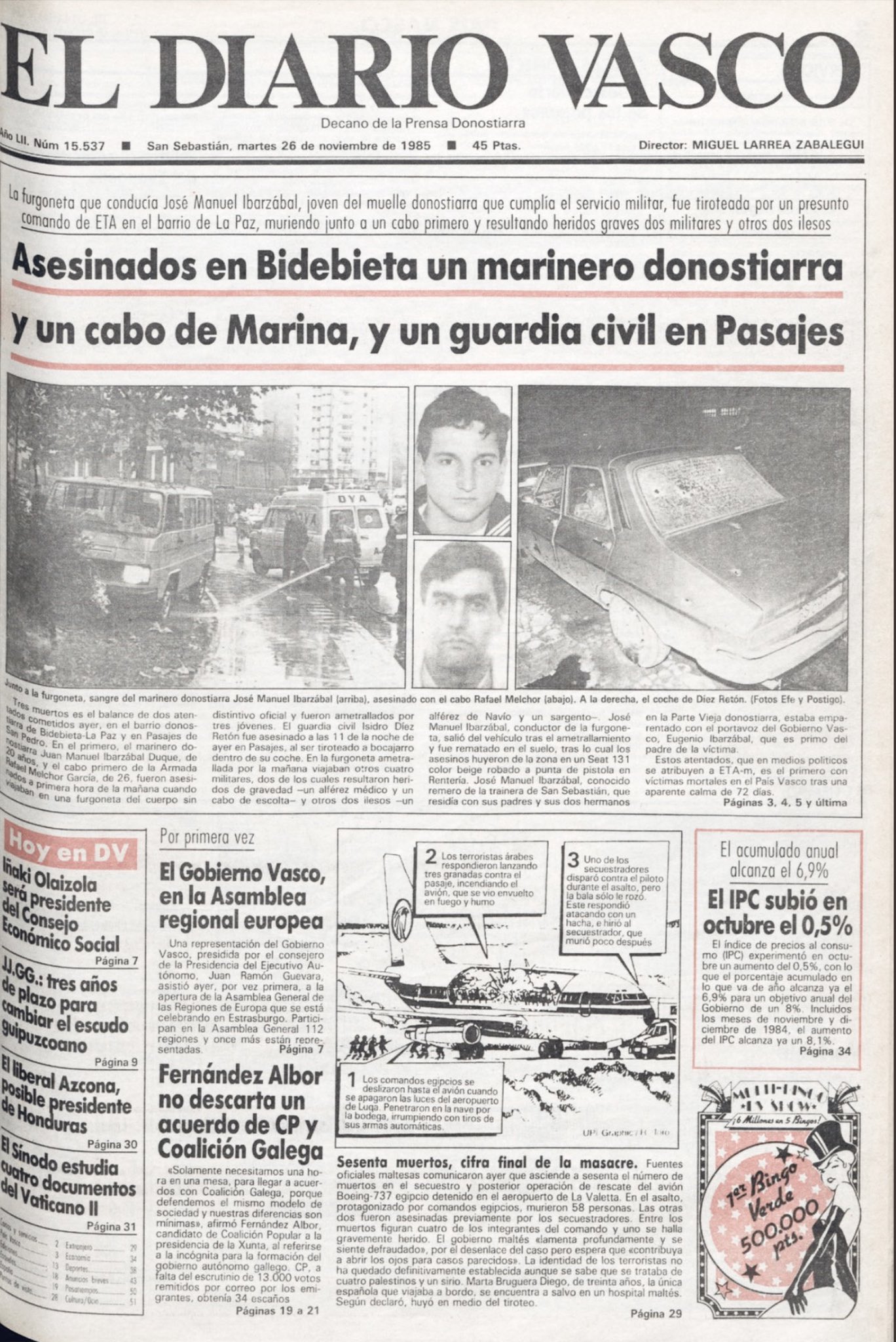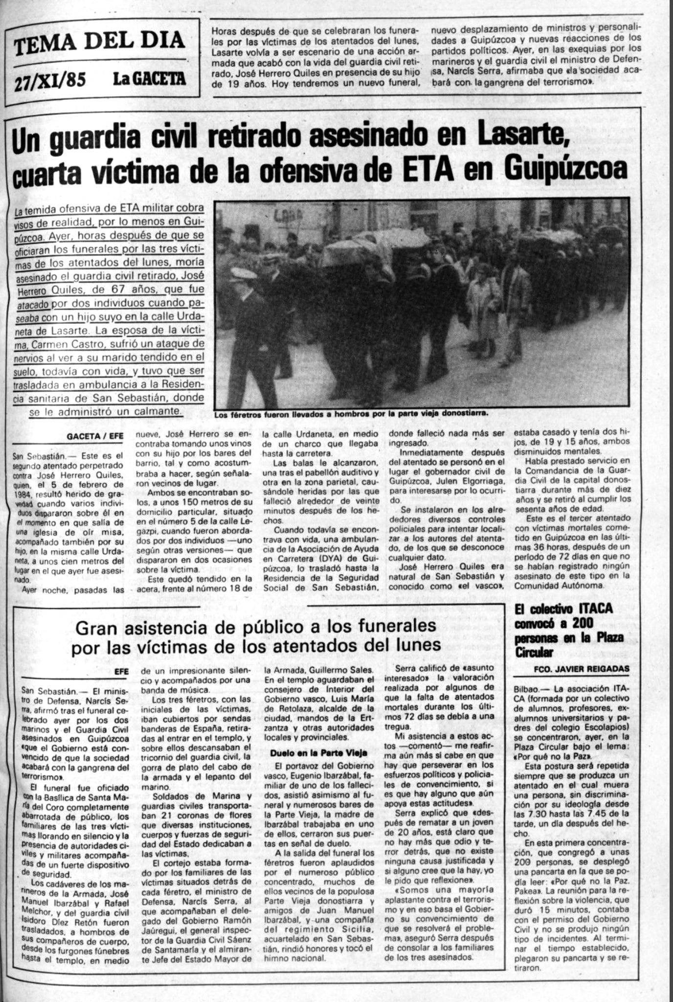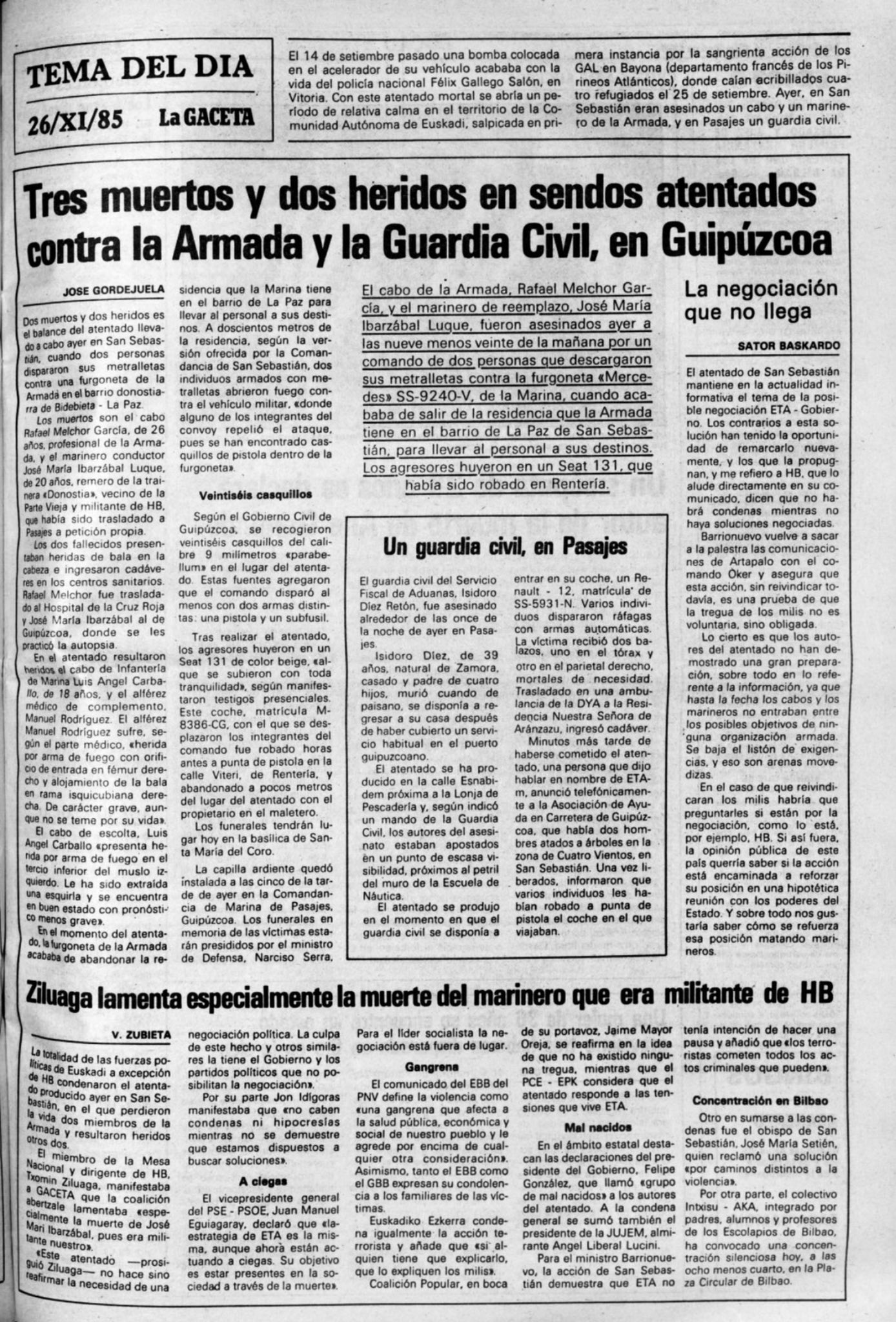 El 25 de noviembre de 1985la banda terrorista ETA asesinó a tres personas en dos atentados distintos con pocas horas de diferencia entre uno y otro. El primero de ellos tuvo lugar a las 8:20 horas en el barrio de la Paz de San Sebastián, cuando un microbús con seis militares a bordo fue ametrallado por tres miembros de la banda, provocando la muerte de JOSÉ MANUEL IBARZÁBAL DUQUE, marinero de segunda de la Armada, y RAFAEL MELCHOR GARCÍA, cabo primero radiotelegrafista. Los dos militares se dirigían a la Comandancia de Marina de Pasajes en el vehículo oficial que, tras el ametrallamiento, se estrelló contra un árbol.