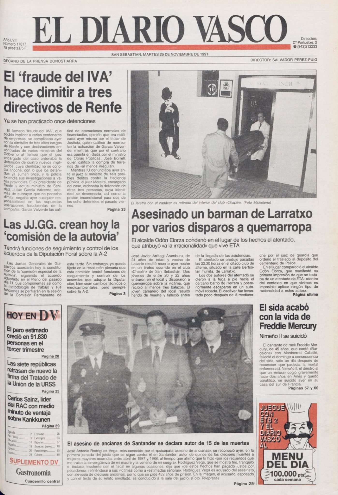 En torno a las 23:00 horas del 25 de noviembre de 1991 dos miembros de la banda terrorista ETA irrumpieron en el pub Chaplin, barra americana del barrio de Larratxo de de San Sebastián, y acribillaron a balazos a su dueño, JOSÉ JAVIER URRITEGUI ARAMBURU, que se encontraba detrás de la barra. Los dos terroristas entraron en el pub a cara descubierta y armados con una pistola y un subfusil. En ese momento se encontraban en el interior del club cuatro mujeres, tres de ellas extranjeras. José Javier falleció antes de que llegasen las asistencias sanitarias.