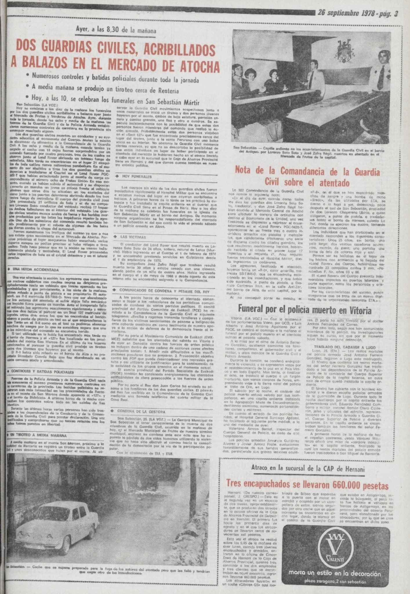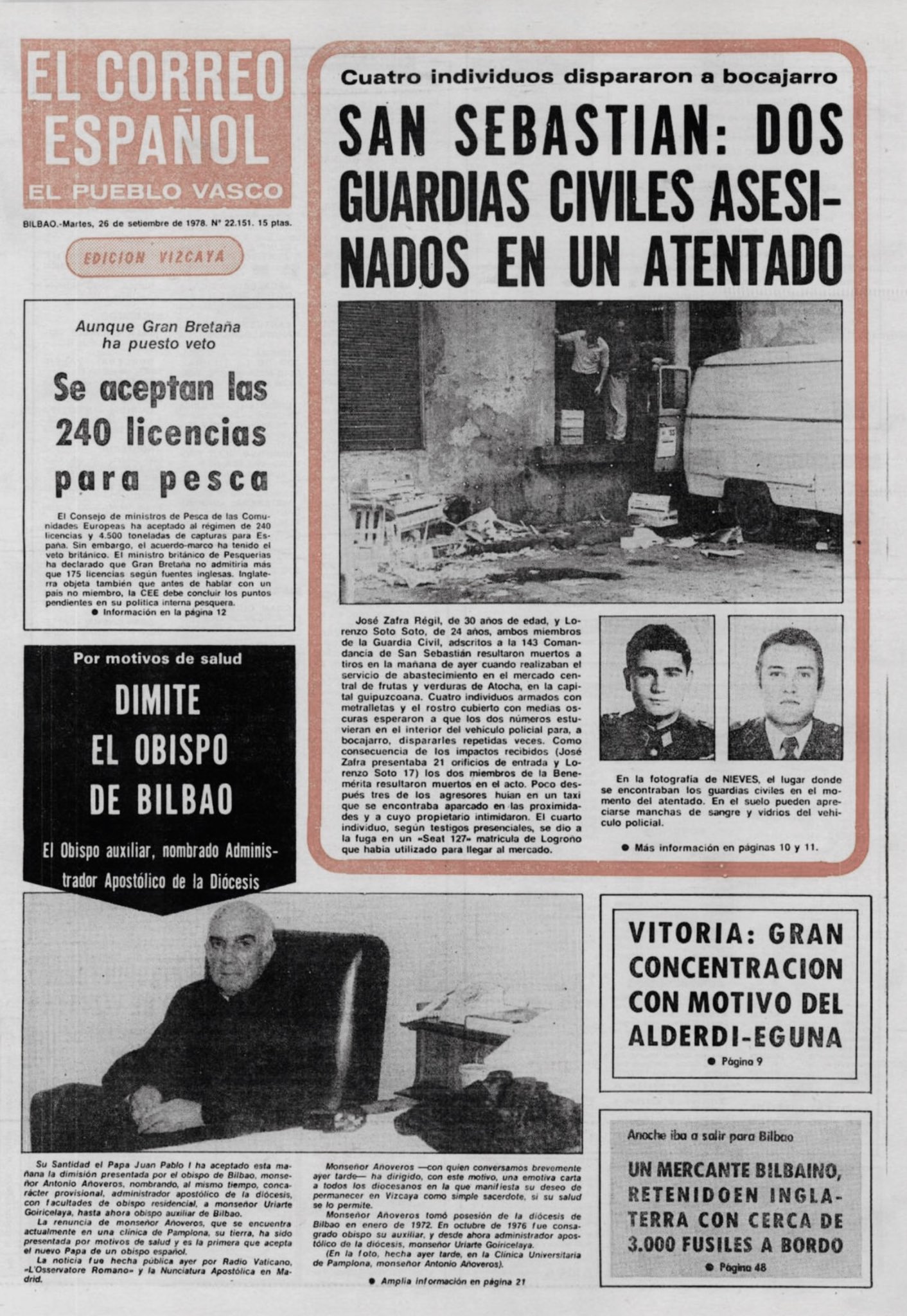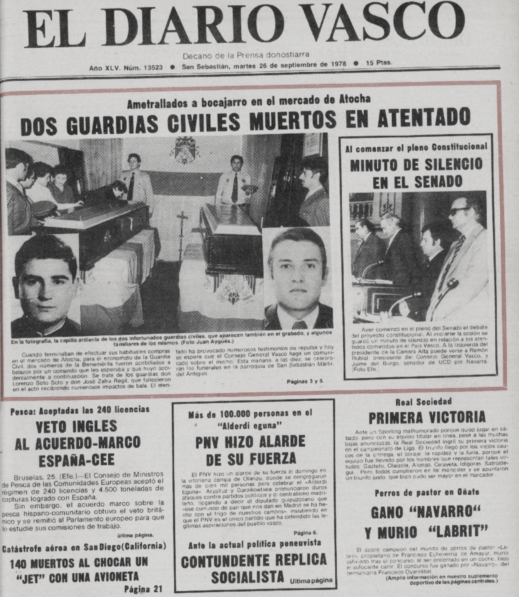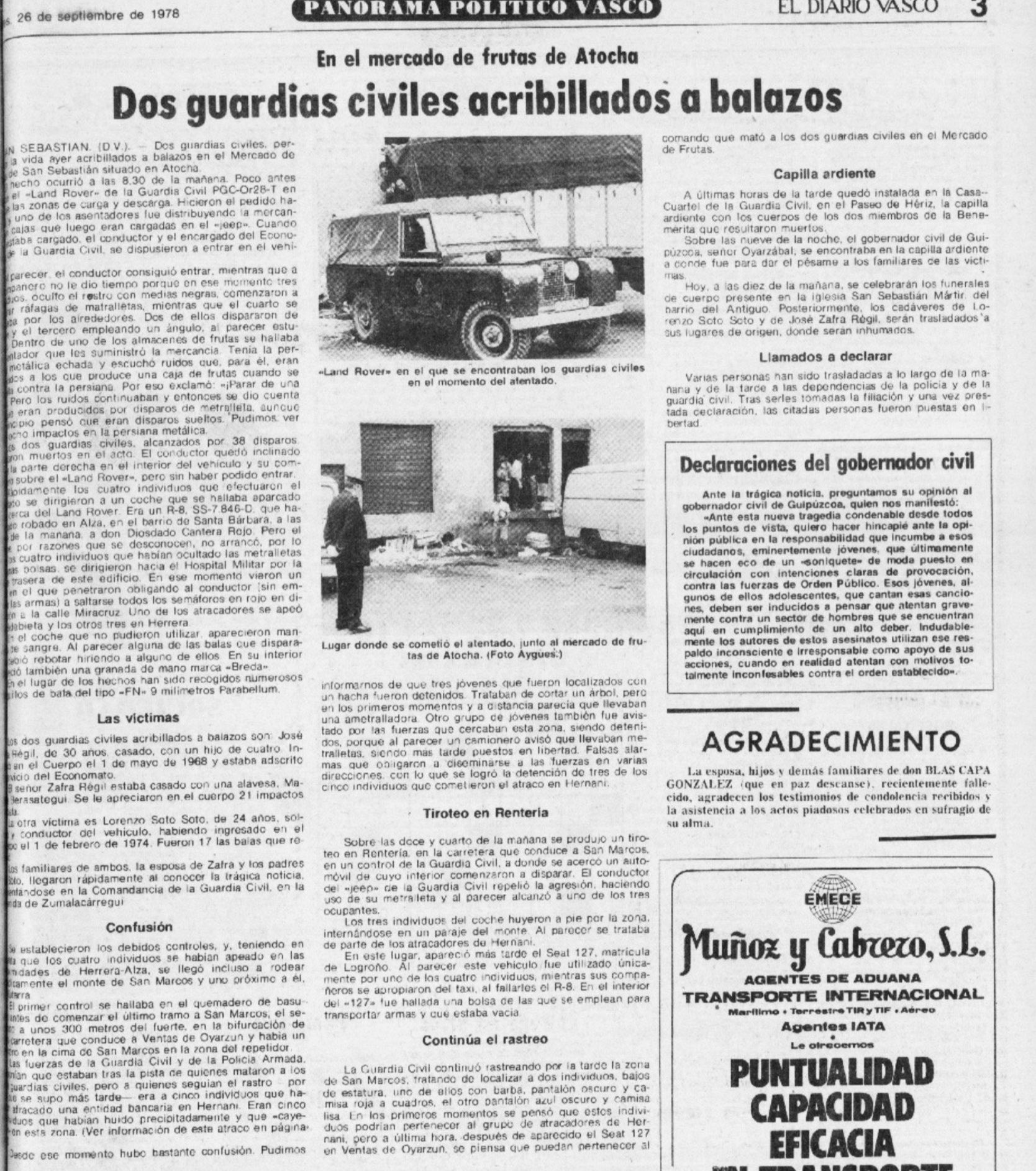 El lunes 25 de septiembre de 1978 la banda terrorista ETA acribillaba a balazos en San Sebastián un Land Rover de la Guardia Civil, matando en el acto a LORENZO SOTO SOTO, conductor del vehículo, y a JOSÉ ZAFRA RÉGIL.