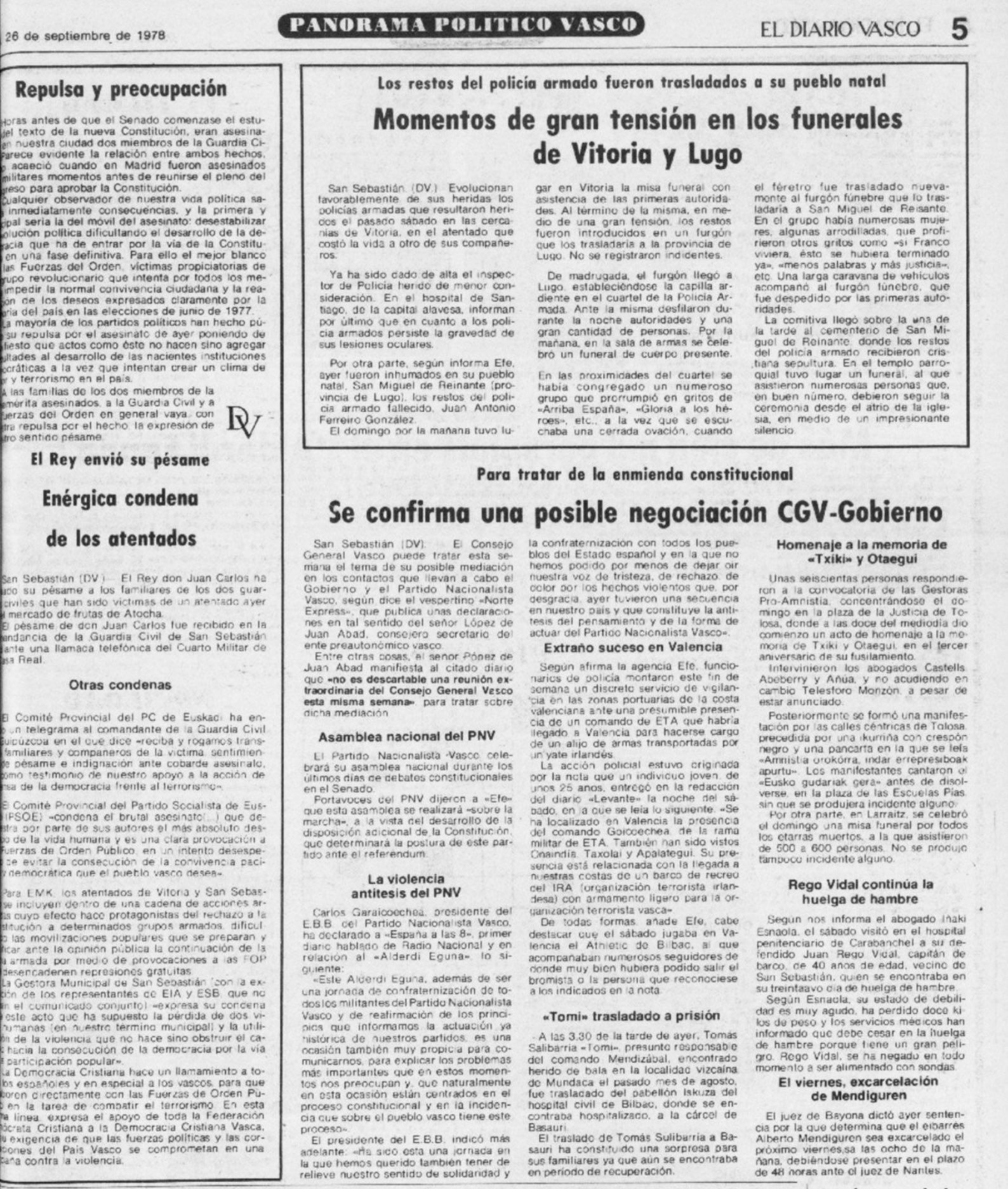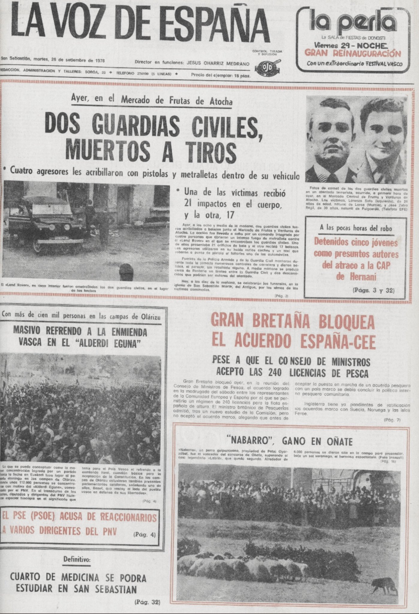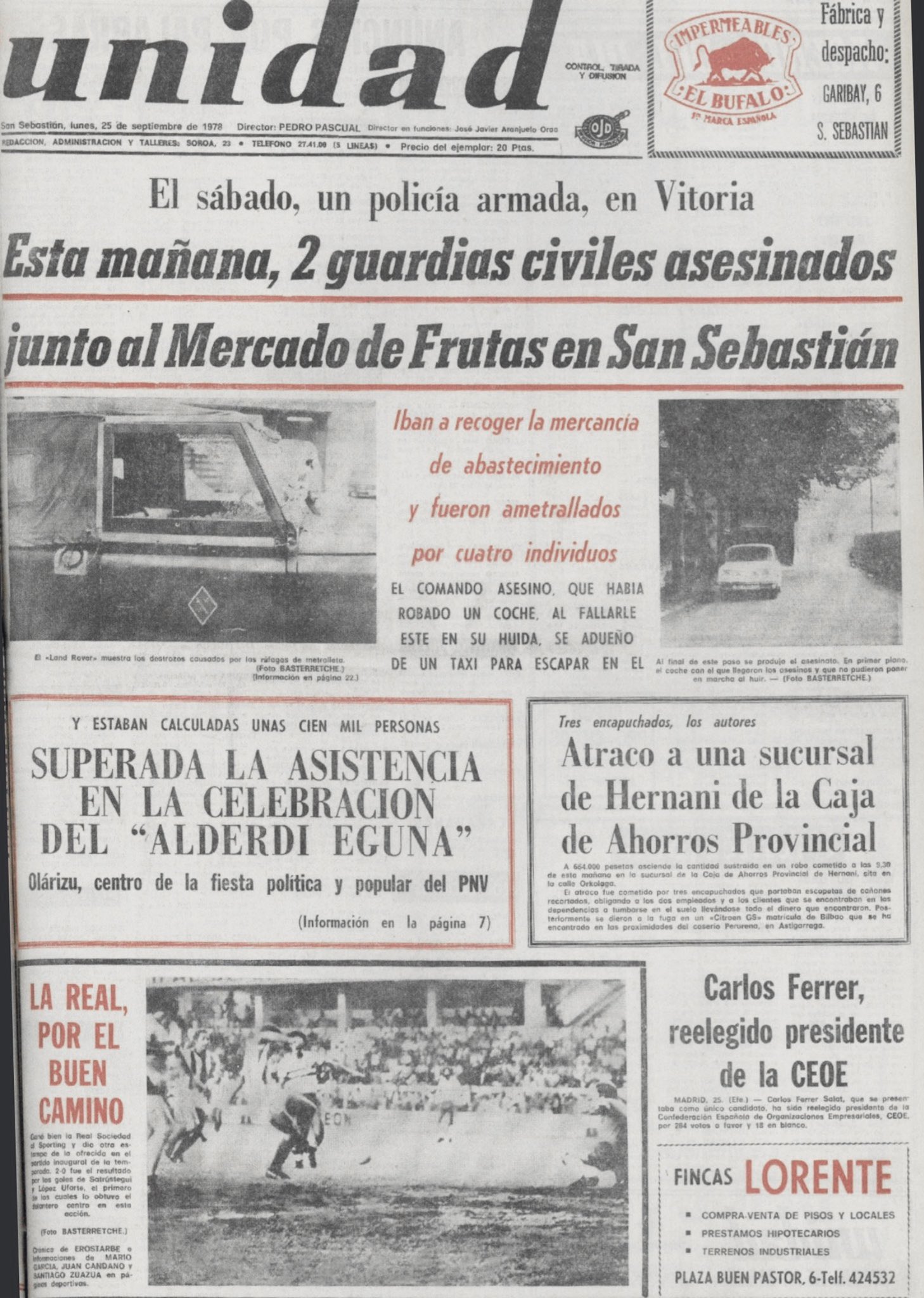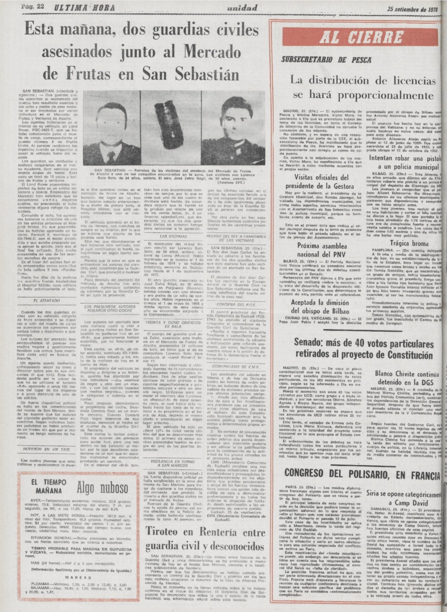 El lunes 25 de septiembre de 1978 la banda terrorista ETA acribillaba a balazos en San Sebastián un Land Rover de la Guardia Civil, matando en el acto a LORENZO SOTO SOTO, conductor del vehículo, y a JOSÉ ZAFRA RÉGIL.