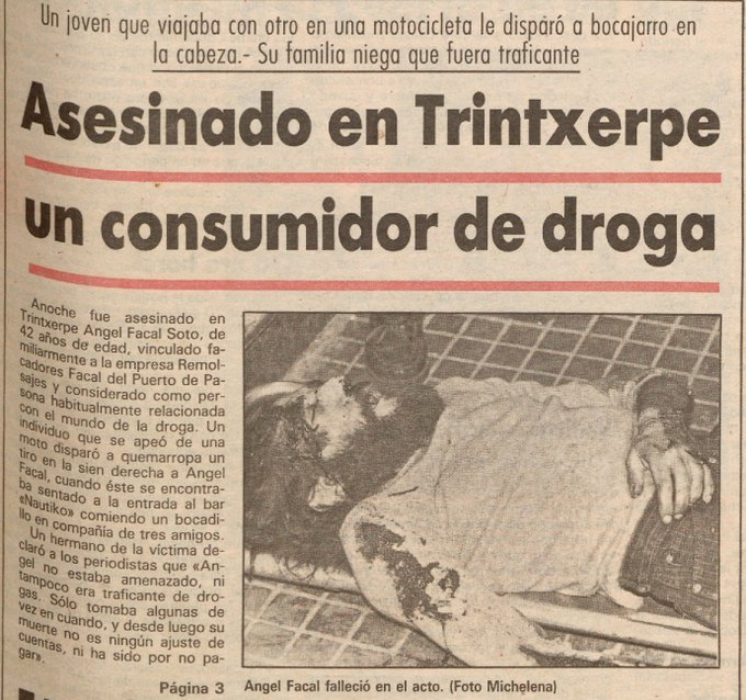 A las ocho de la noche del lunes 26 de febrero de 1985, ETA asesinaba en la puerta de un bar de la localidad guipuzcoana de Pasajes (Guipúzcoa) a ÁNGEL MANUEL FACAL SOTO, copropietario de una empresa de remolcadores.