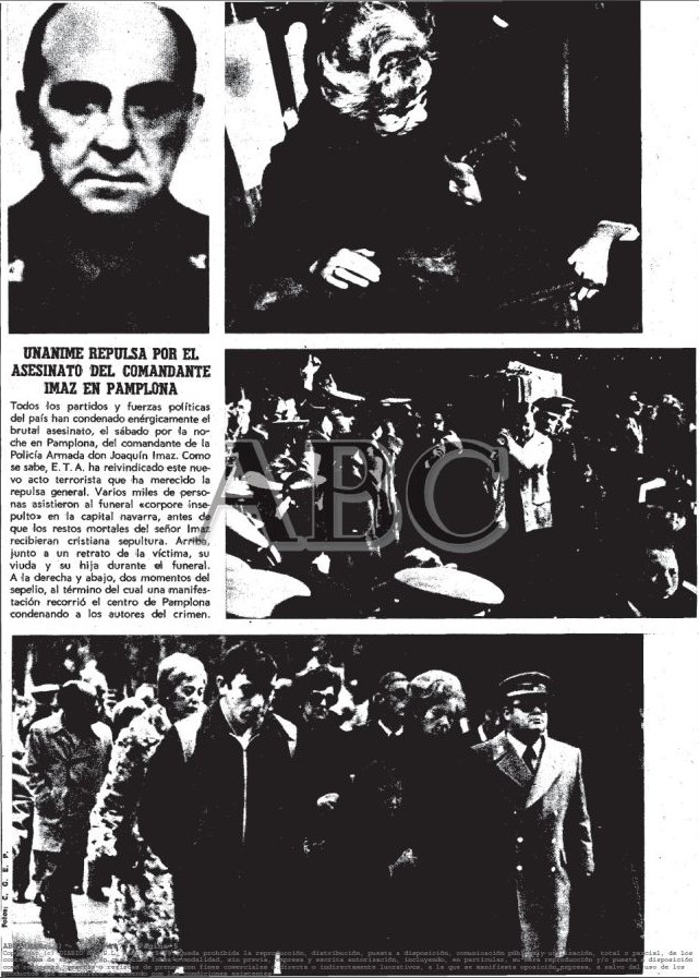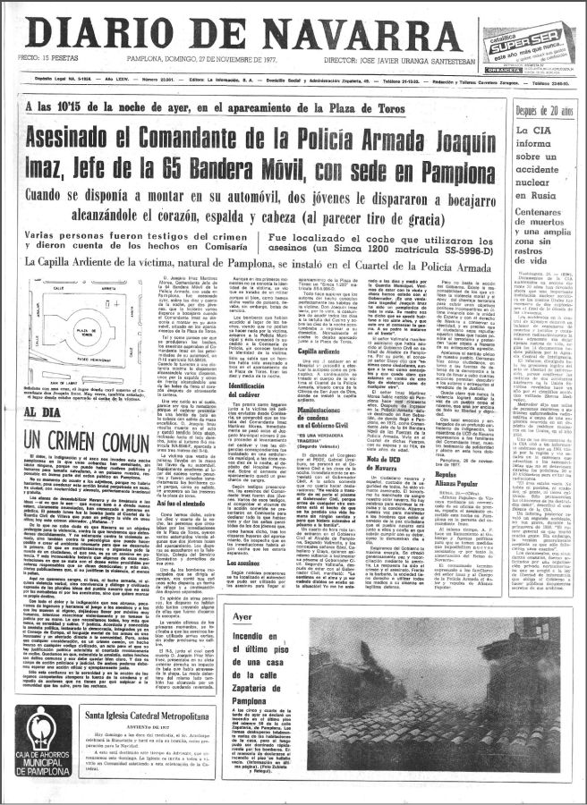 El 26 de noviembre de 1977 la banda terrorista ETA cometía su primer asesinato en Navarra. Sobre las 22:15 horas miembros de la banda dispararon por la espalda al comandante JOAQUÍN IMAZ MARTÍNEZ, jefe de la Policía Armada en Pamplona, cuando se dirigía a coger su automóvil aparcado cerca del coso taurino de la capital navarra. El cuerpo sin vida de Joaquín Imaz fue encontrado tendido al pie de un árbol y cubierto por una manta en los aparcamientos contiguos a la plaza de toros.