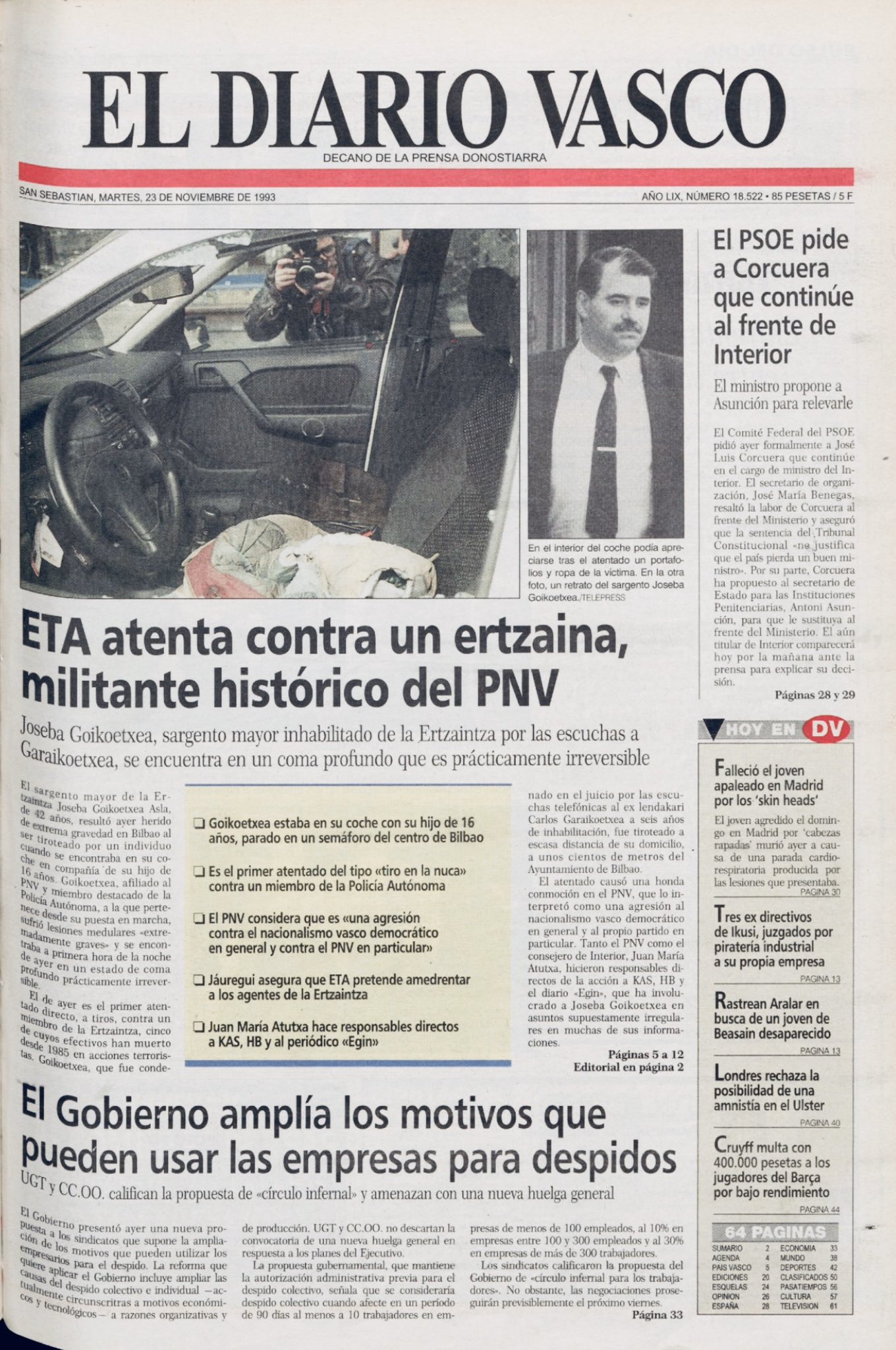 El 26 de noviembre de 1993 fallecía en Bilbao JOSEBA GOIKOETXEA ASLA, sargento mayor de la Ertzaintza y militante destacado del Partido Nacionalista Vasco (PNV), cuatro días después de que dos integrantes de la banda terrorista ETA, un hombre y una mujer, lo tiroteasen delante de su hijo de 16 años al que llevaba en su automóvil hasta la parada del autobús para ir al colegio. El chaval resultó ileso, pero Goikoetxea recibió dos impactos de bala: una le entró por la cabeza y quedó alojada en una vértebra cervical, mientras que la segunda le dañó la región lumbar. Permaneció en coma profundo hasta que falleció a las 17:30 horas del 26 de noviembre.