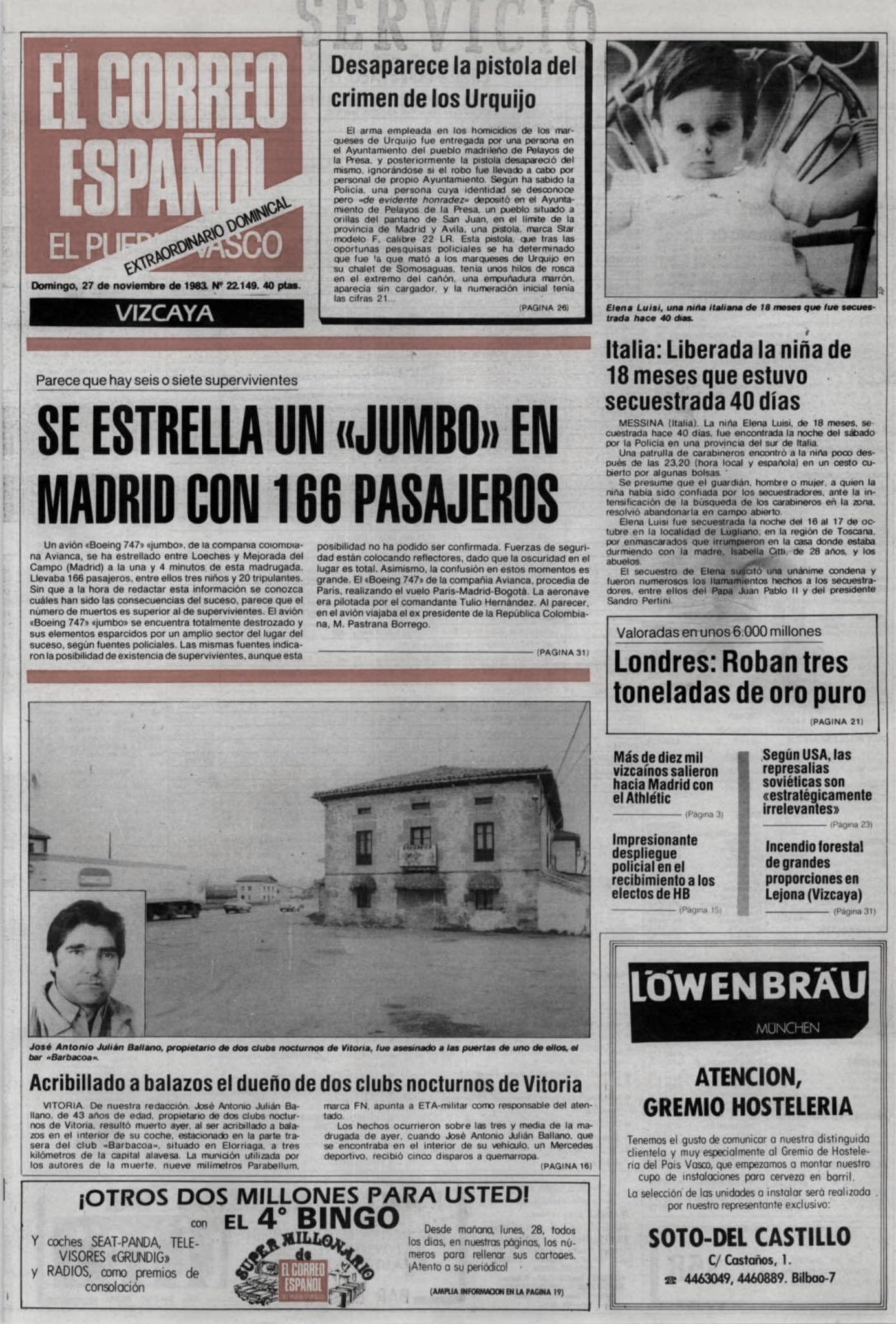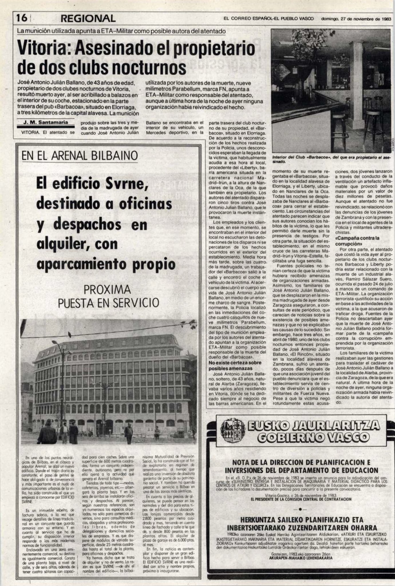 A las tres y media de la madrugada del 26 de noviembre de 1983 la banda terrorista ETA asesinaba a tiros en Vitoria a JOSÉ ANTONIO JULIÁN BAYANO, que gestionaba varios locales nocturnos en la capital alavesa, cuando se dirigía a cerrar uno de esos locales.