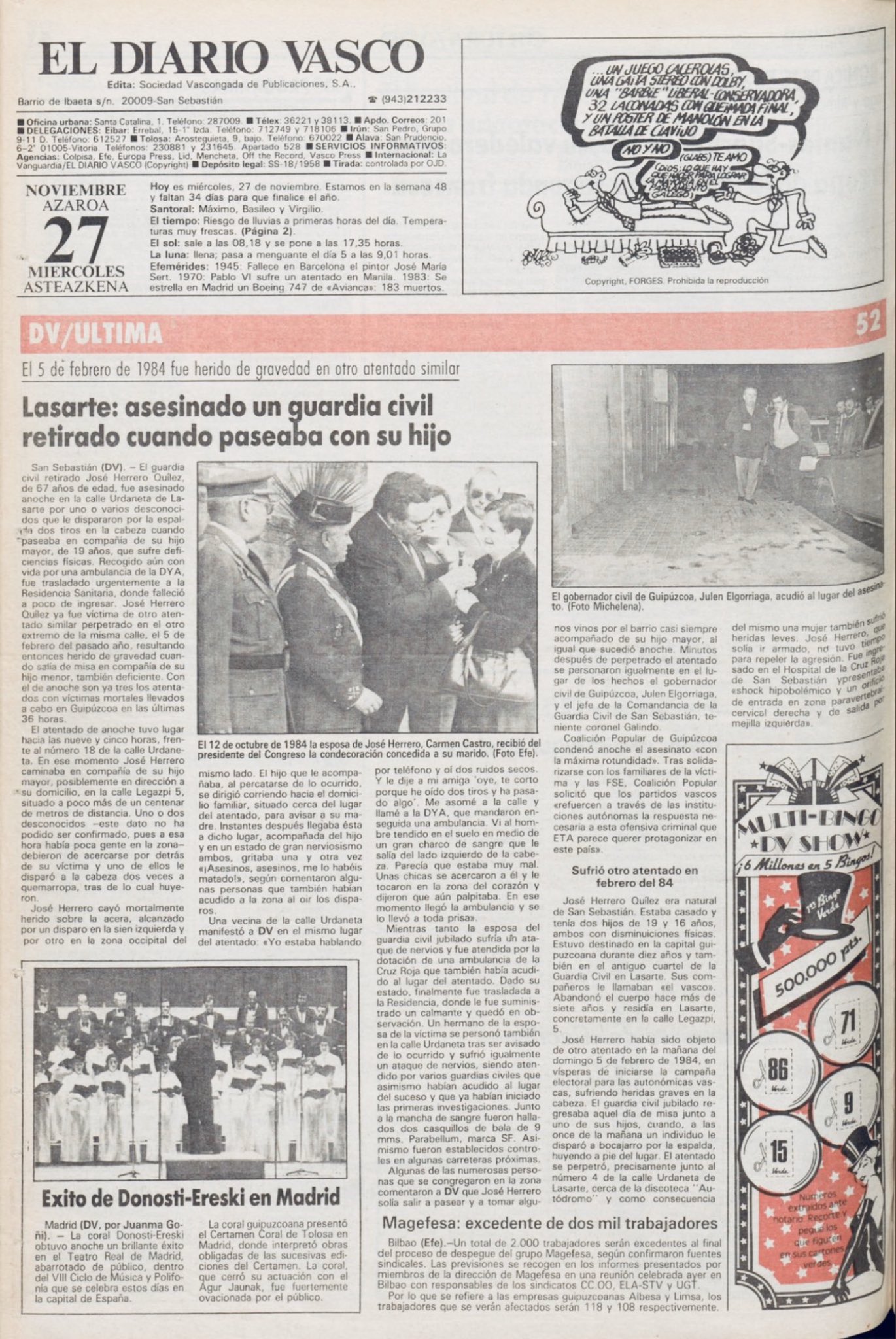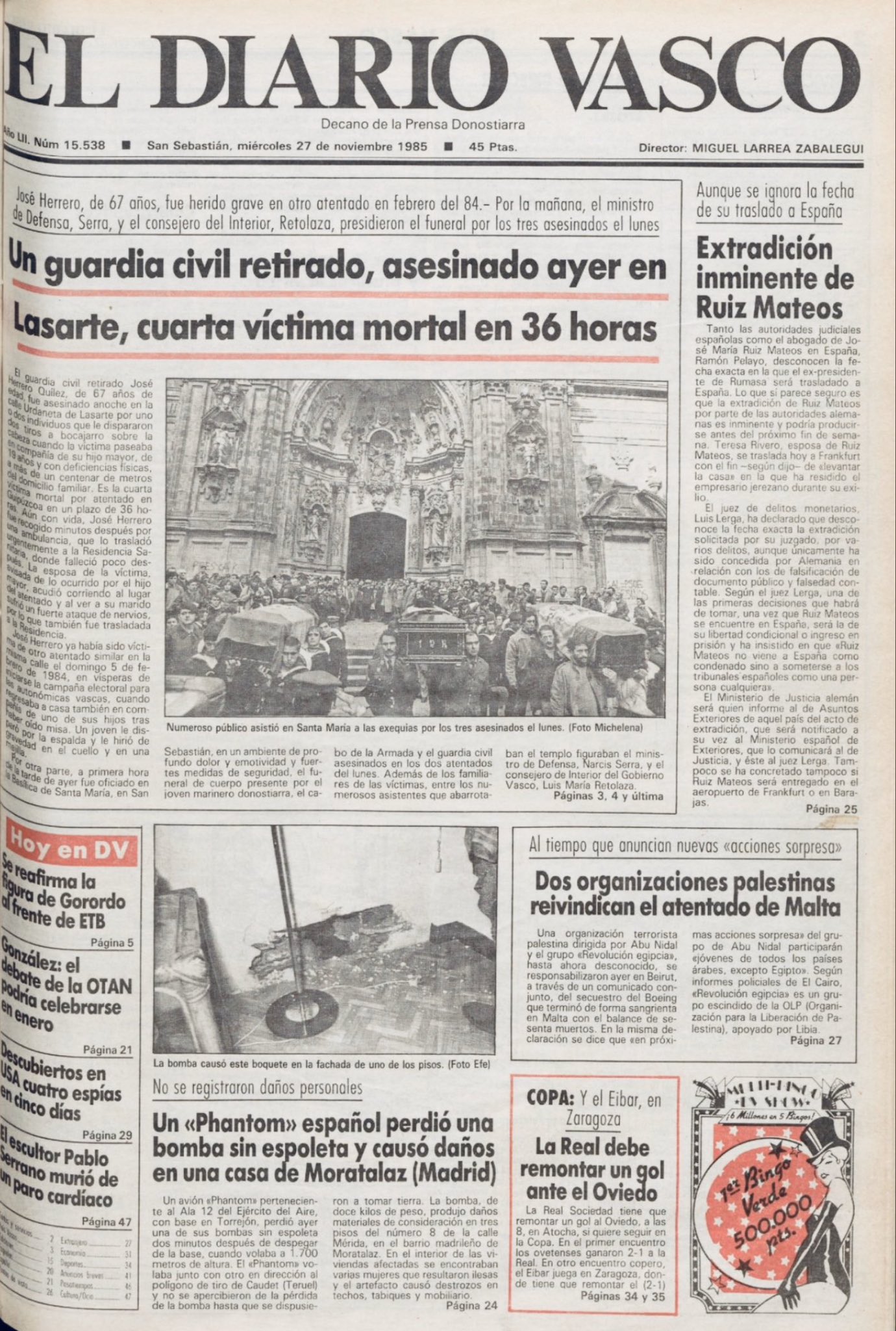 A las nueve y cuarto de la noche del 26 de noviembre de 1985, la banda terrorista ETA asesinaba en la localidad guipuzcoana de Lasarte al guardia civil jubilado JOSÉ HERRERO QUILES cuando salía de un bar de la calle Ignacio de Loyola acompañado por uno de sus hijos, Juan José, de 19 años. Herrero Quiles había estado por la tarde en el bar jugando su habitual partida de cartas. Mientras un etarra encañonaba al hijo, otro disparó dos veces en la cabeza del guardia civil.