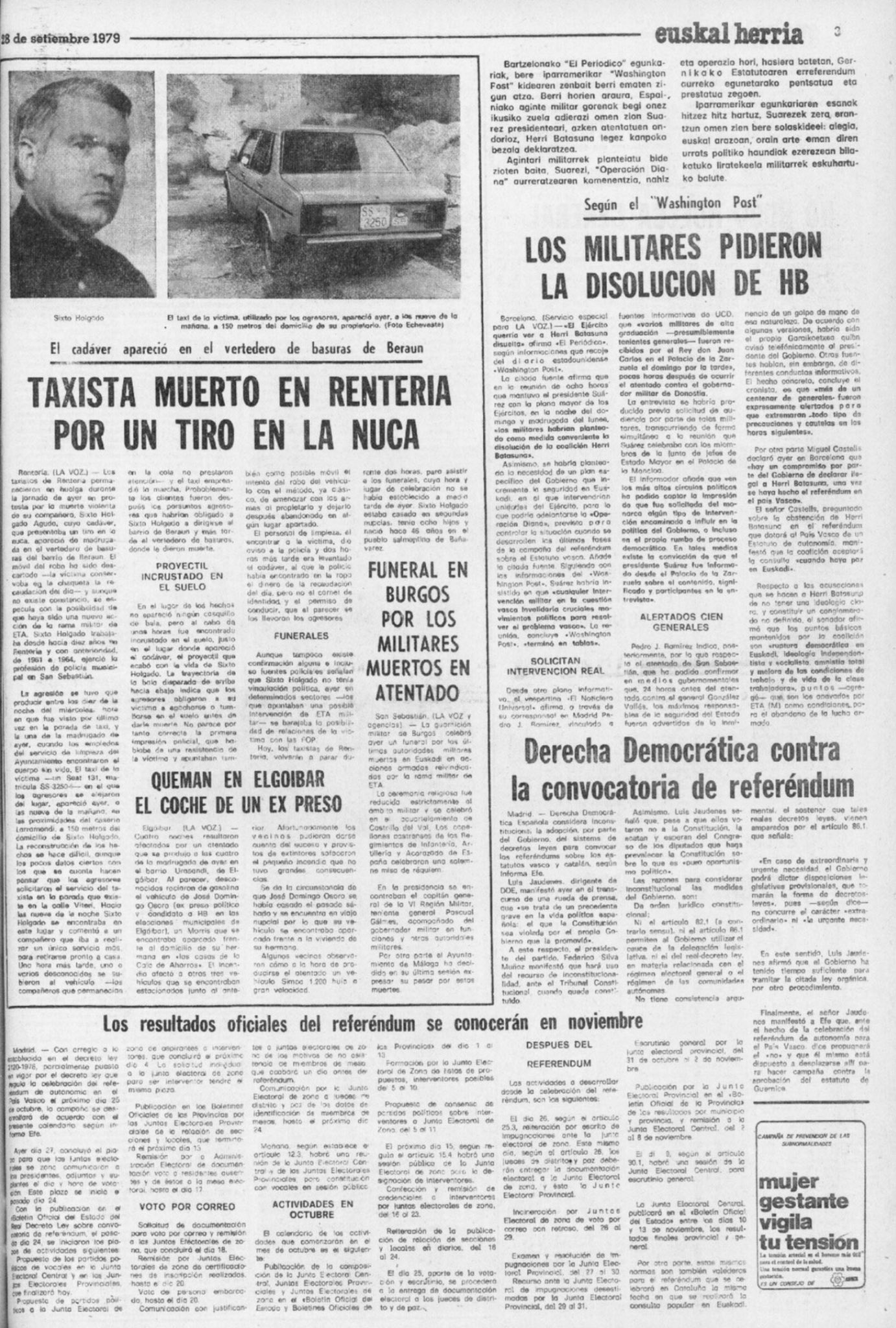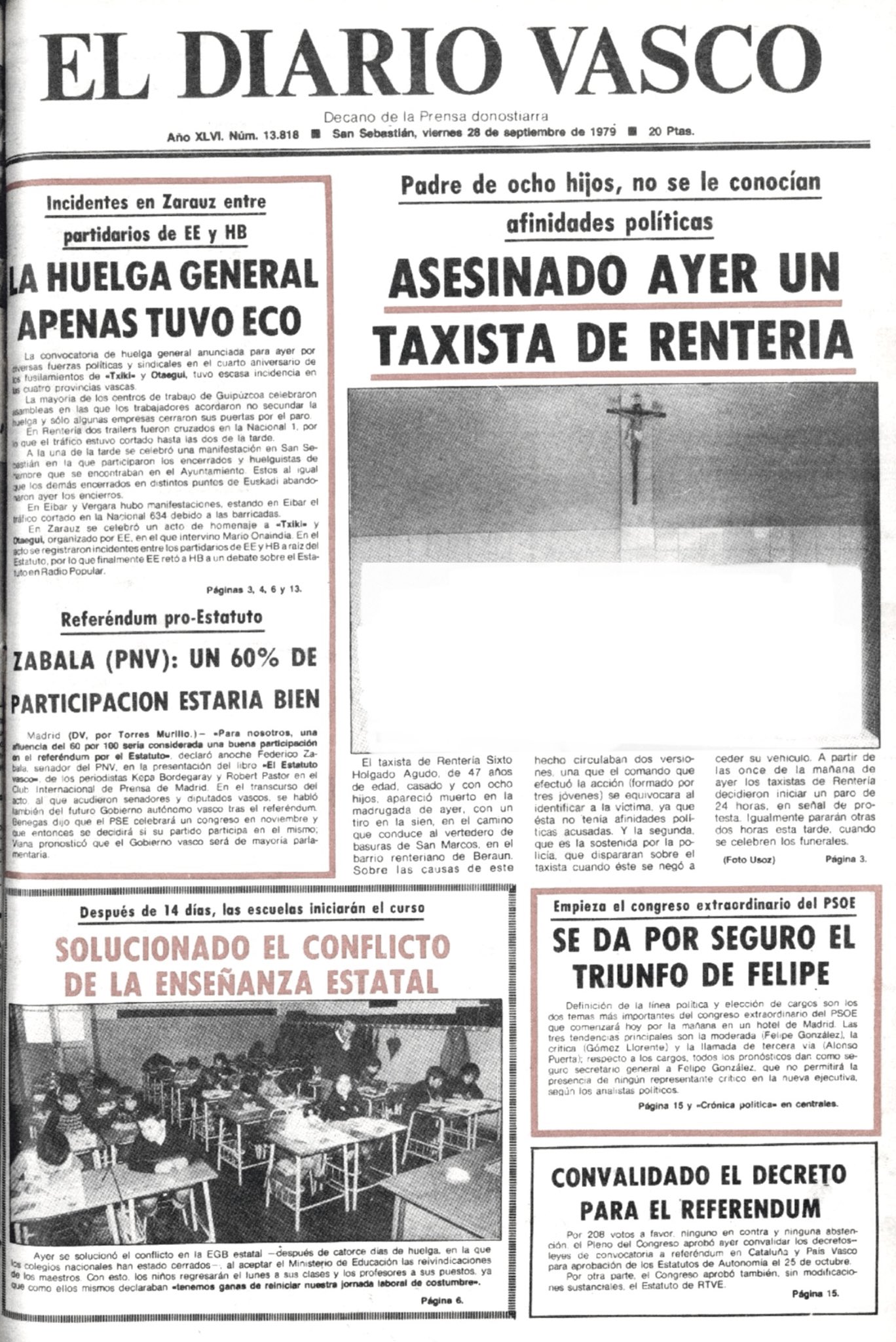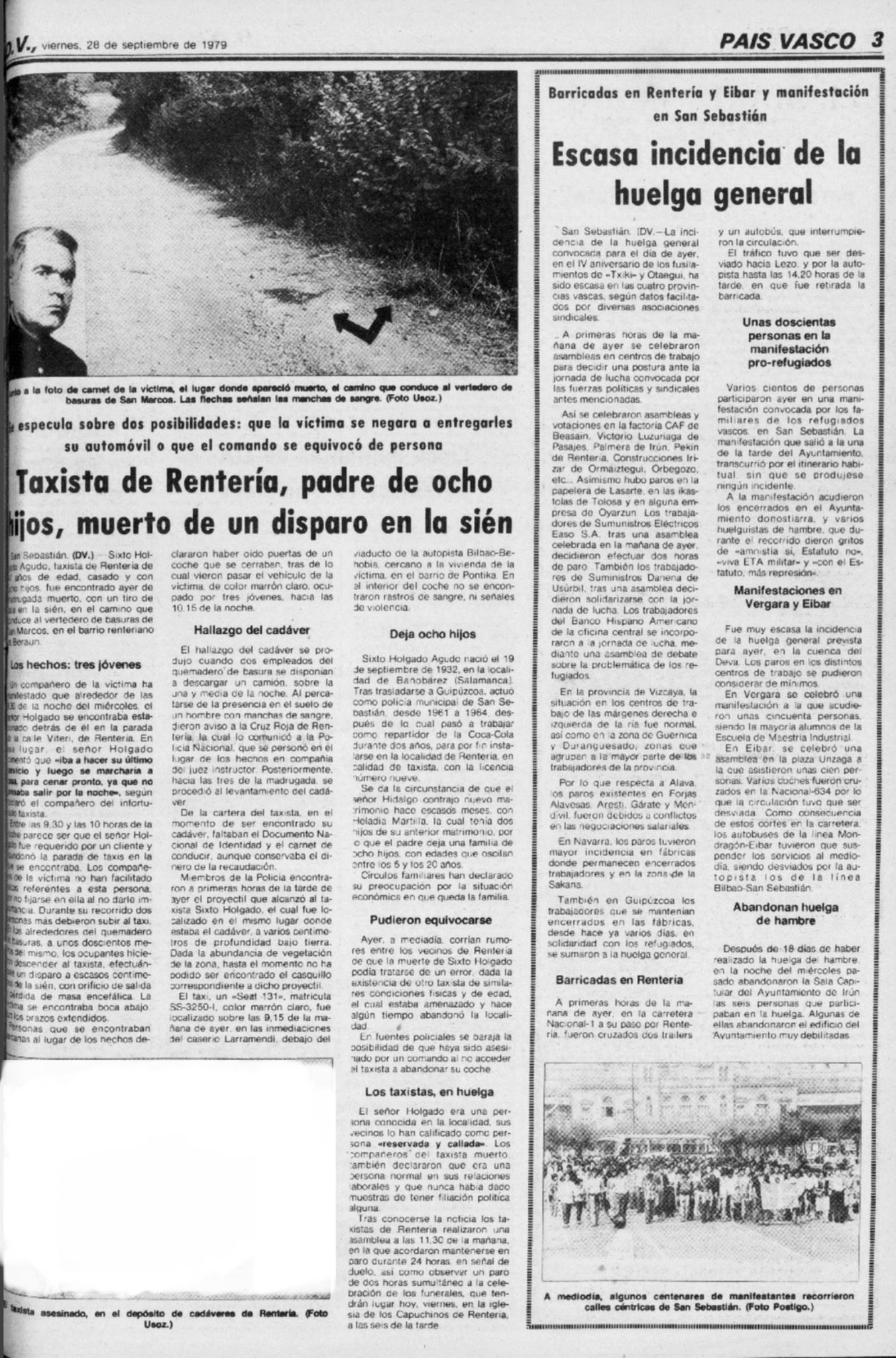 El 26 de septiembre de 1979, la banda terrorista ETA asesinaba en Rentería (Guipúzcoa) al taxista SIXTO HOLGADO AGUDO. Su cadáver, que presentaba un tiro en la nuca, apareció de madrugada en el vertedero de basuras de San Marcos, cerca del barrio de Beraun. El taxi de la víctima, un Seat 131 que los asesinos utilizaron para alejarse del lugar, apareció el 27 de septiembre a las nueve de la mañana, en las proximidades de su domicilio, cerca del caserío de Larramendi.