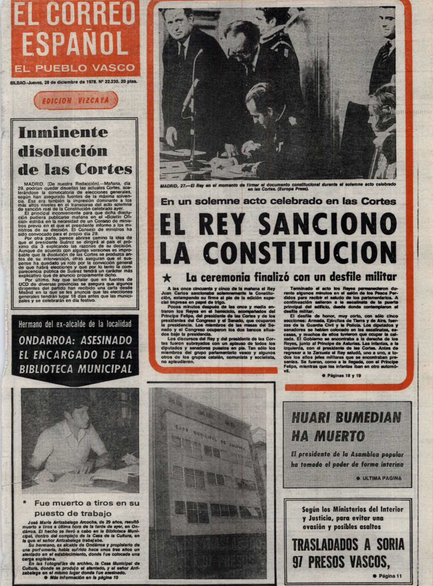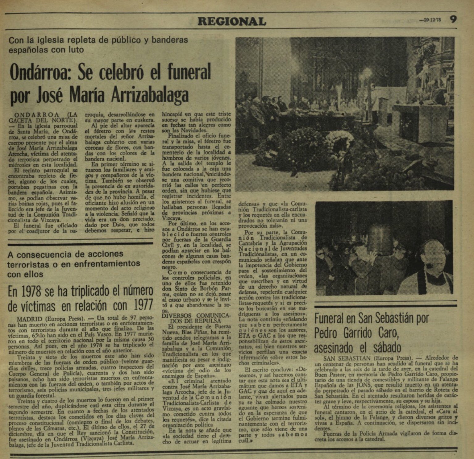 El miércoles 27 de diciembre de 1978, sobre las 18:00 horas de la tarde, dos miembros de ETA militar asesinaban a tiros a JOSÉ MARÍA ARRIZABALAGA ARCOCHA en la biblioteca municipal de Ondárroa. Arrizabalaga, que recibió nueve impactos de bala, era jefe de la Juventud de la Comunión Tradicionalista de Vizcaya y trabajaba como bibliotecario en la Casa de la Cultura de Ondárroa, donde fue asesinado.