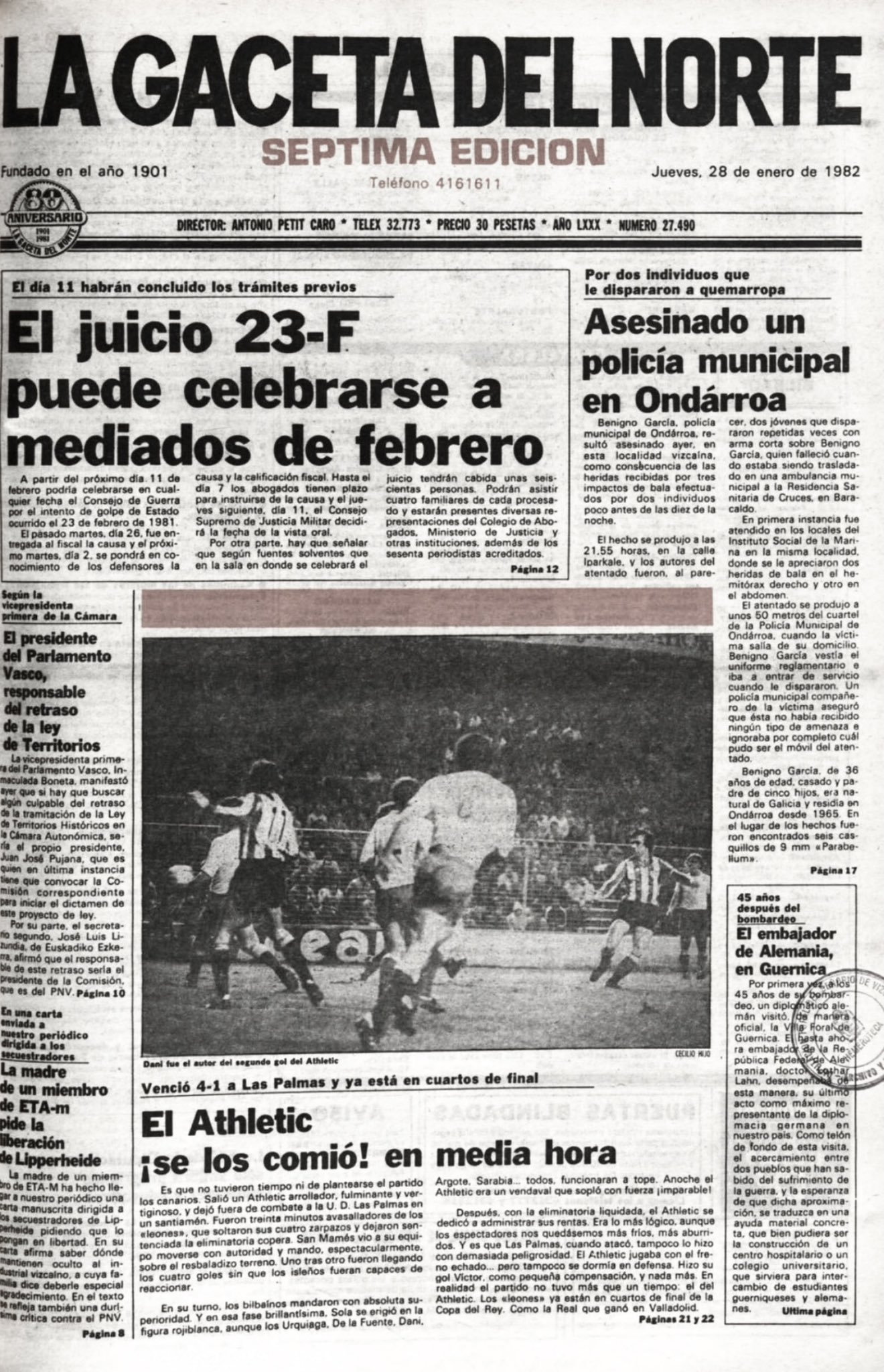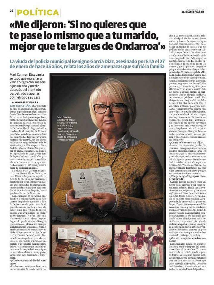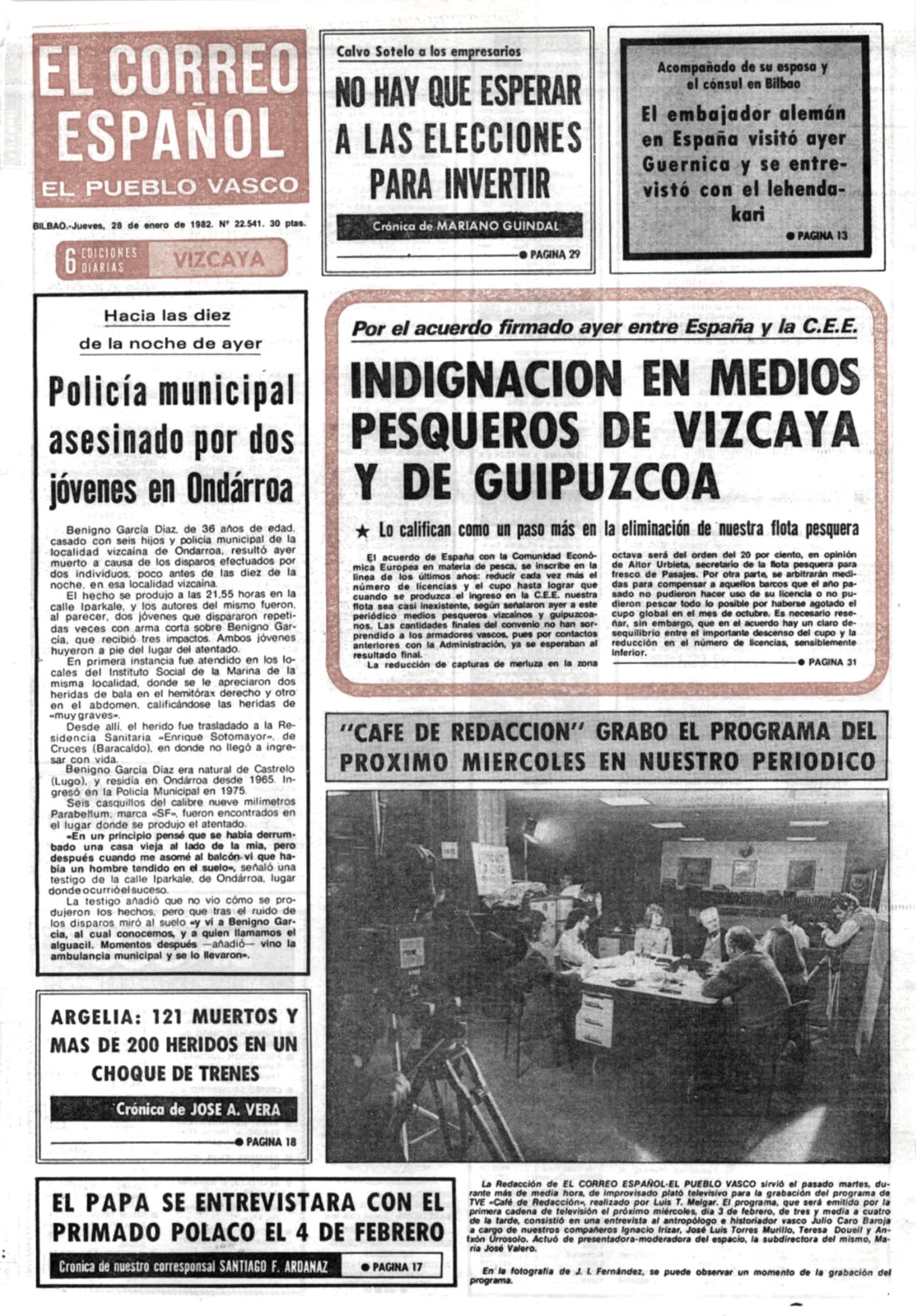 El 27 de enero de 1982 ETA asesinaba en Ondárroa al policía municipal BENIGNO GARCÍA DÍAZ. Dos pistoleros le dispararon por la espalda a las 22:00 horas cuando se dirigía de uniforme desde el cuartel a su domicilio. Herido de gravedad, el agente falleció mientras lo trasladaban al Hospital de Cruces.