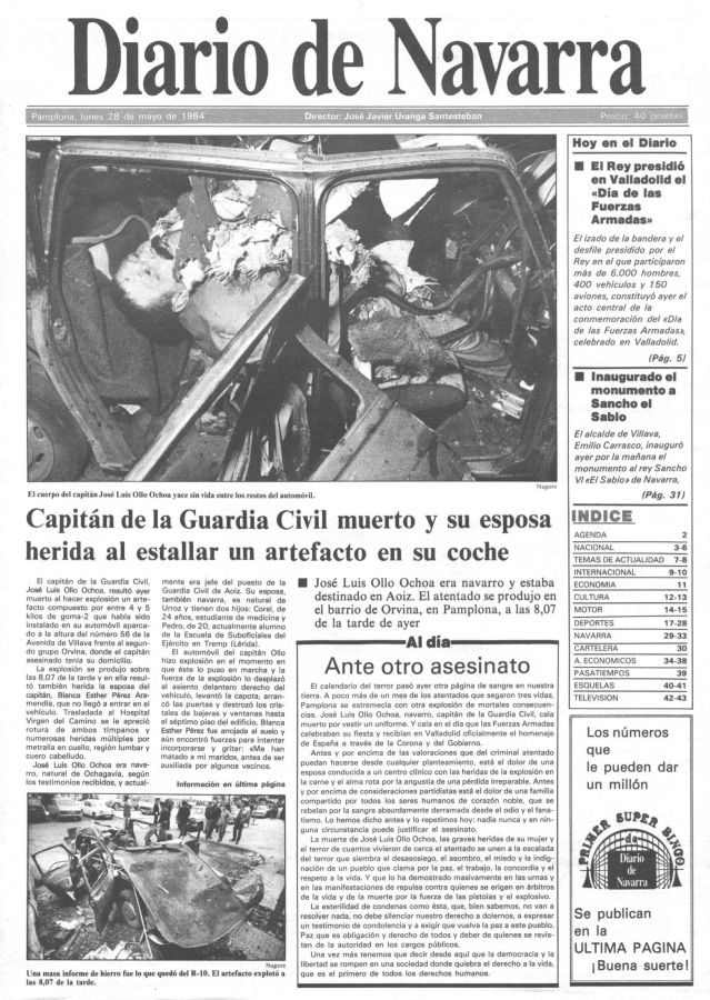 A las ocho y cuarto de la noche del 27 de mayo de 1984 la banda terrorista ETA asesinaba en Pamplona, mediante una bomba-lapa colocada en su vehículo, al capitán de la Guardia Civil LUIS OLLO OCHOA.