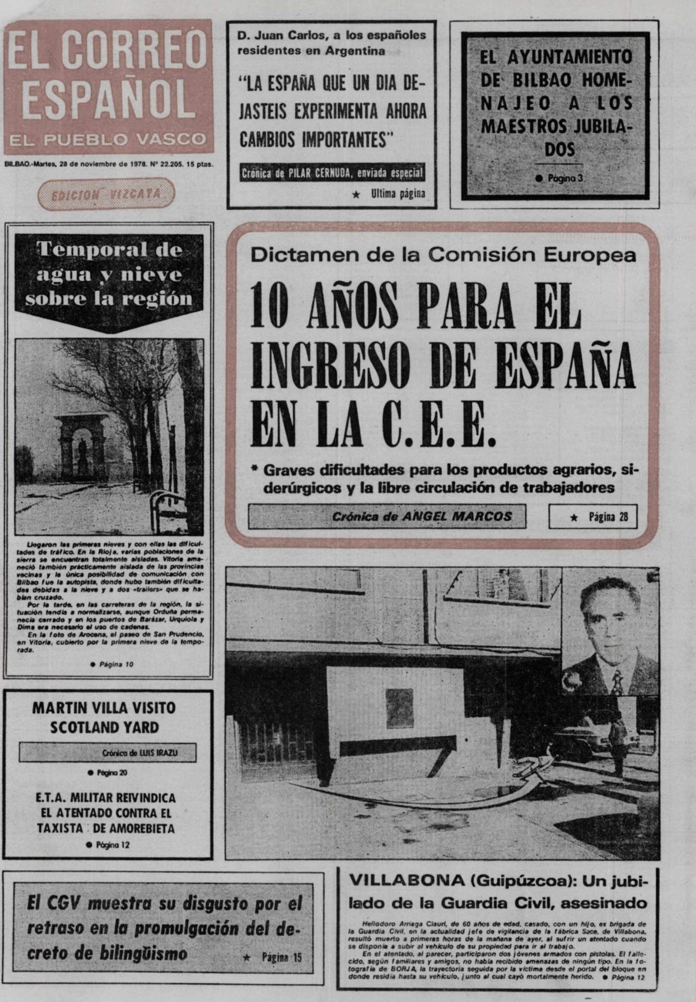 A primera hora de la mañana del lunes 27 de noviembre de 1978 la banda terrorista ETA asesinaba en Villabona (Guipúzcoa) a HELIODORO ARRIAGA CIAURRIZ, brigada de la Guardia Civil retirado y conserje de la empresa metalúrgica Sacem.