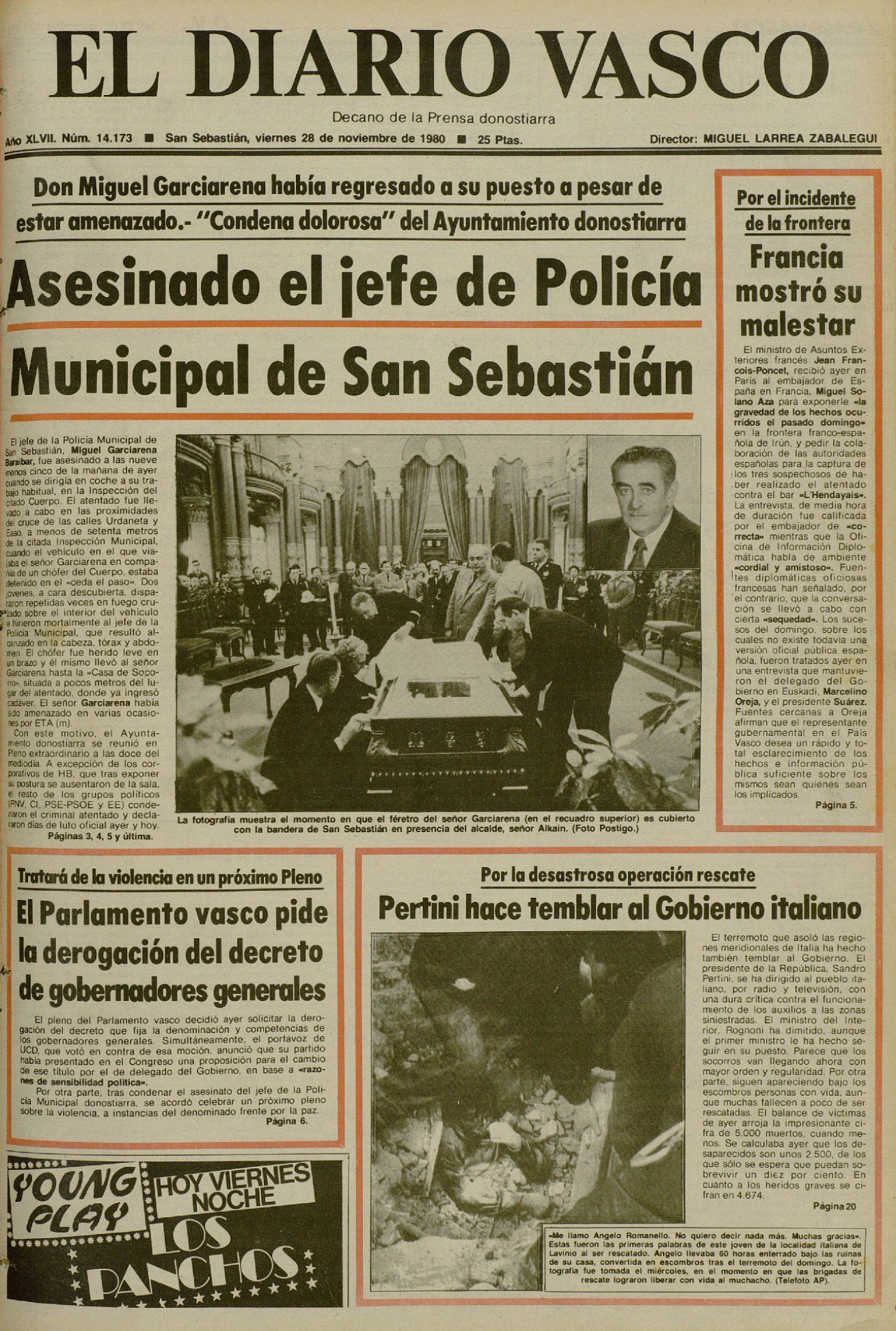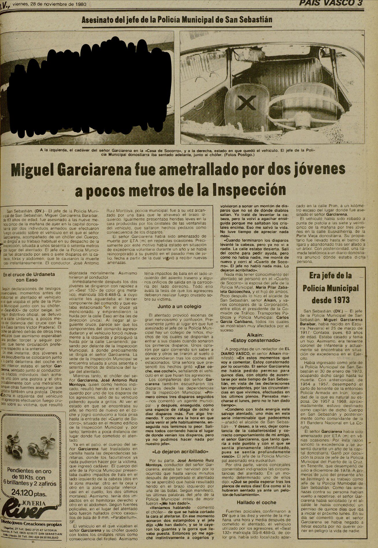El 27 de noviembre de 1980 la banda terrorista ETA comete dos atentados con una diferencia de doce horas en San Sebastián y Logroño. En el primero de ellos, los terroristas tirotearon con pistolas y una metralleta al teniente coronel del Ejército y jefe de la Policía Municipal de San Sebastián MIGUEL GARCIARENA BARAIBAR.