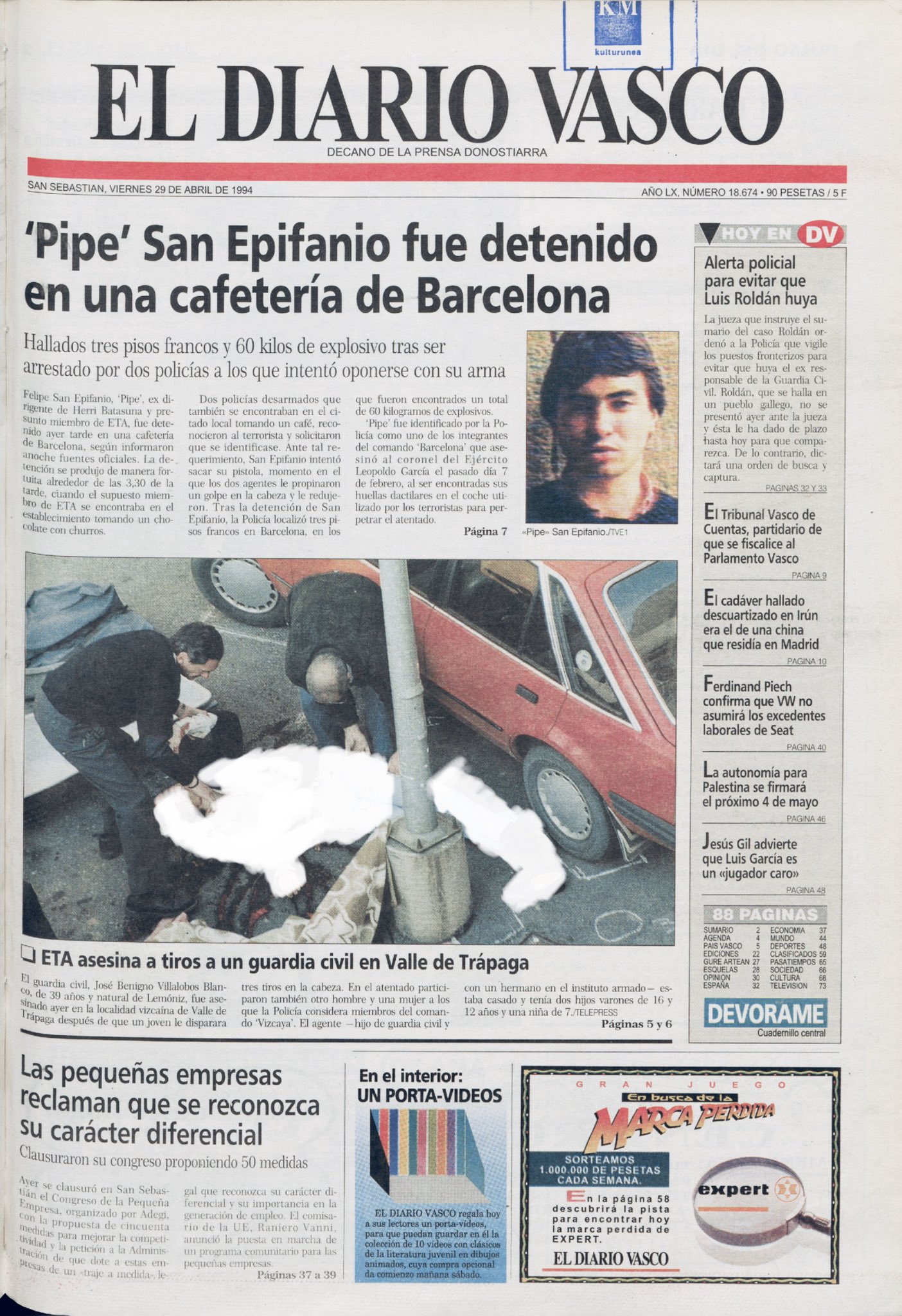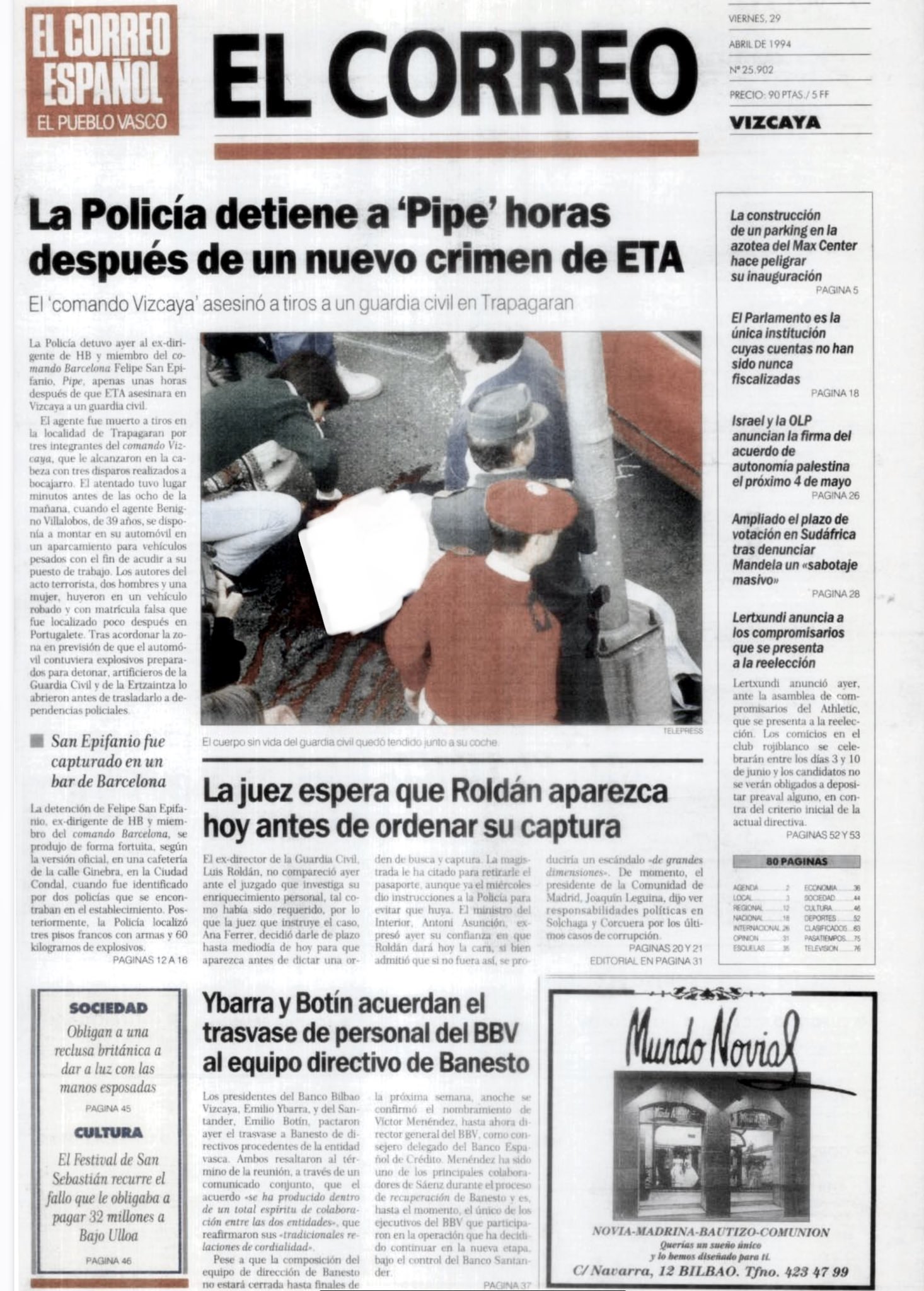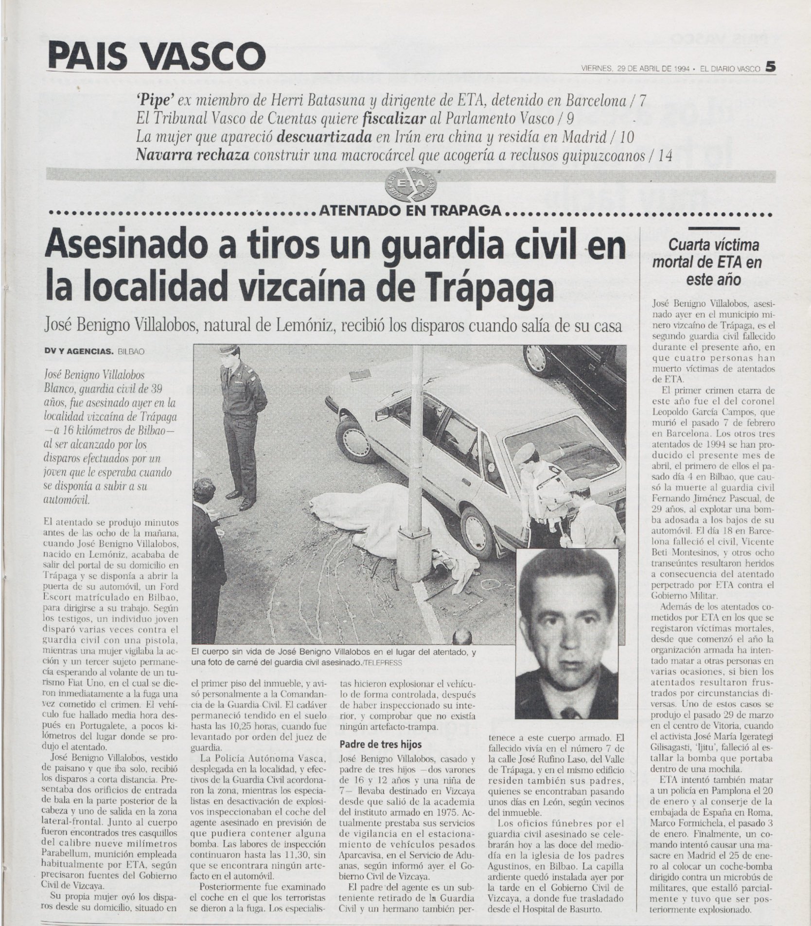 A las ocho de la mañana del jueves 28 de abril de 1994, tres miembros de ETA, dos hombres y una mujer, asesinaban en la localidad vizcaína de Valle de Trápaga al guardia civil JOSÉ BENIGNO VILLALOBOS BLANCO, que recibió dos impactos de bala en la cabeza cuando se dirigía a su trabajo vestido de paisano.
