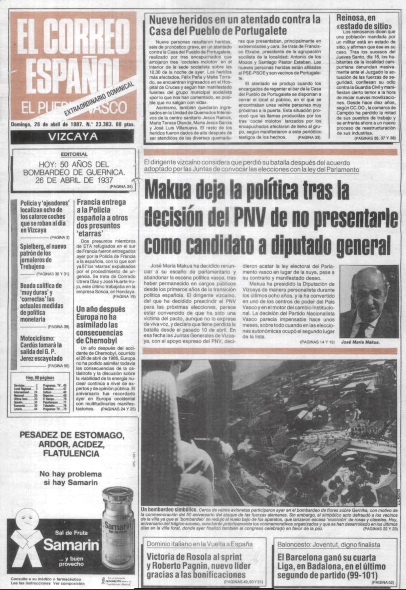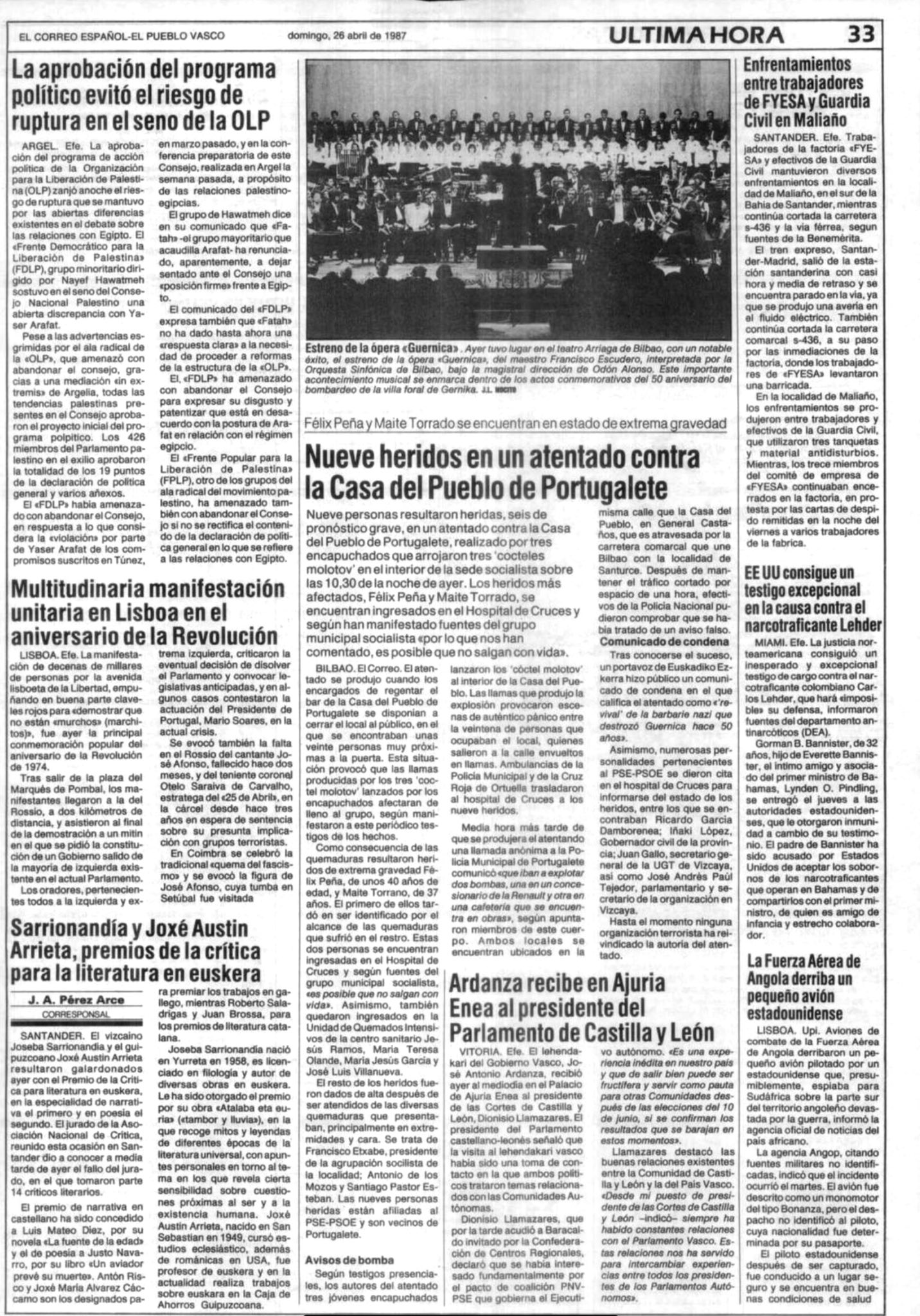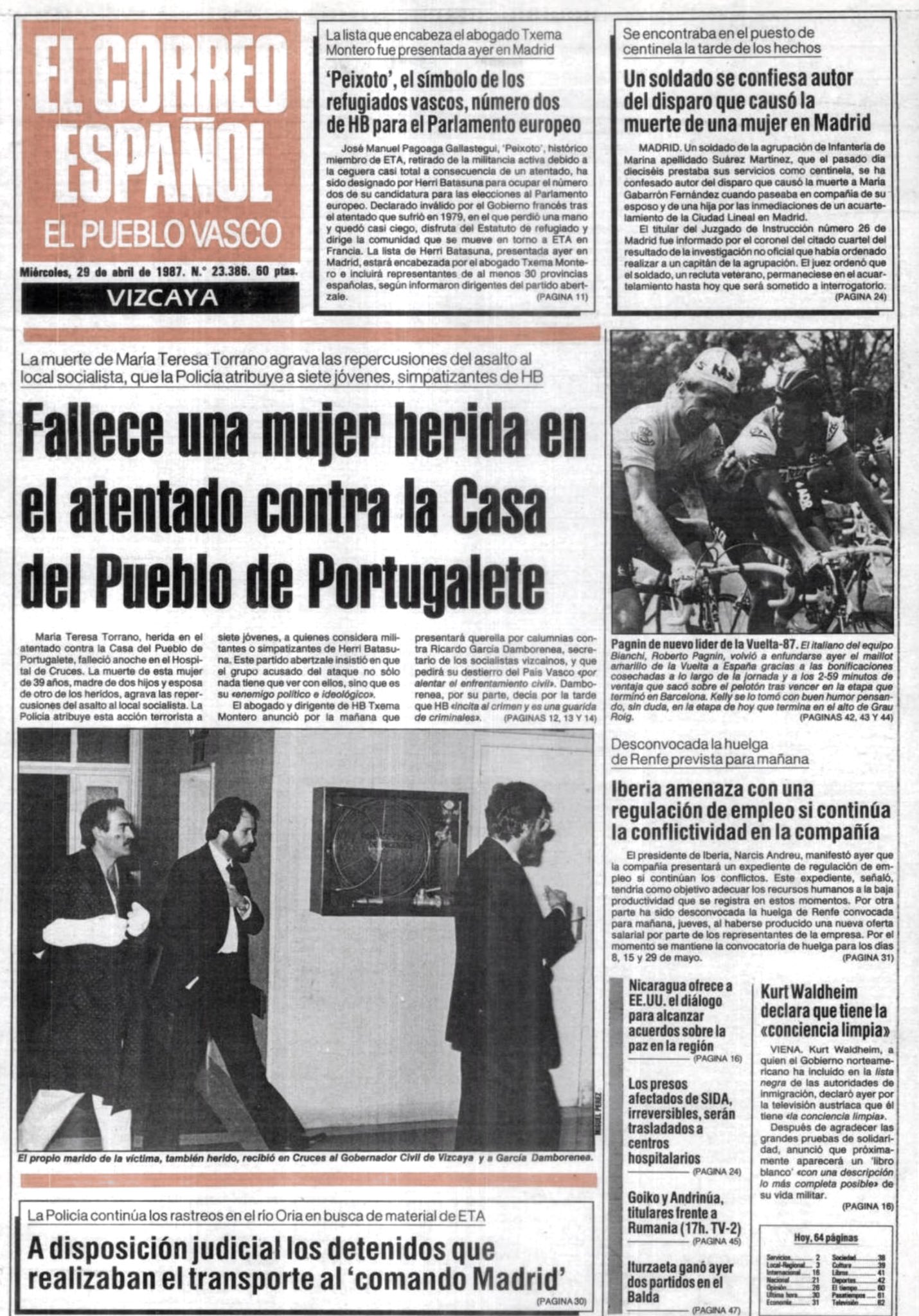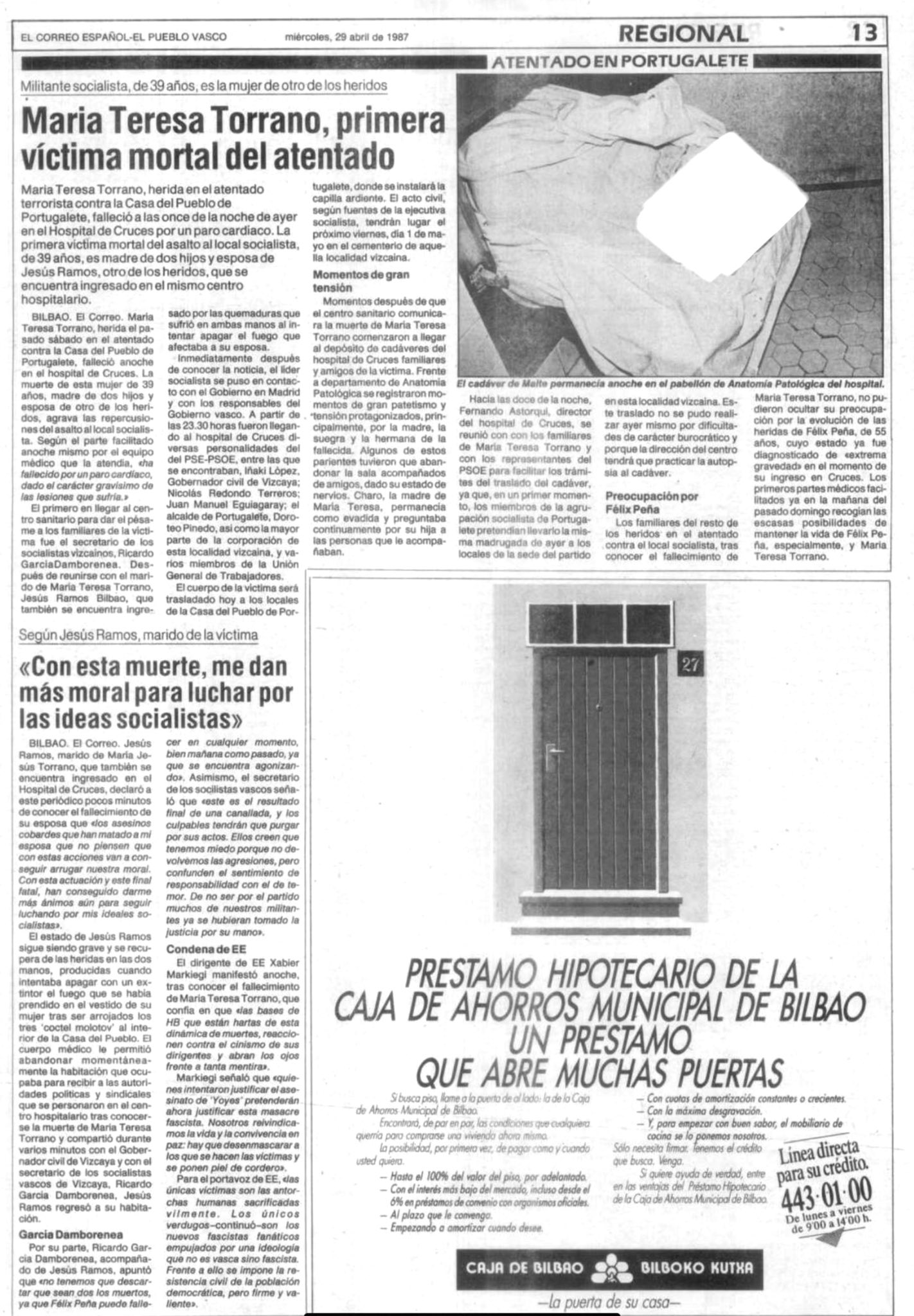 El 28 de abril de 1987 fallecía MARÍA TERESA TORRANO FRANCIA, ama de casa y militante socialista que había resultado gravemente herida en el ataque con cócteles molotov que siete etarras llevaron a cabo contra la Casa del Pueblo de Portugalete (Vizcaya) el 25 de marzo.