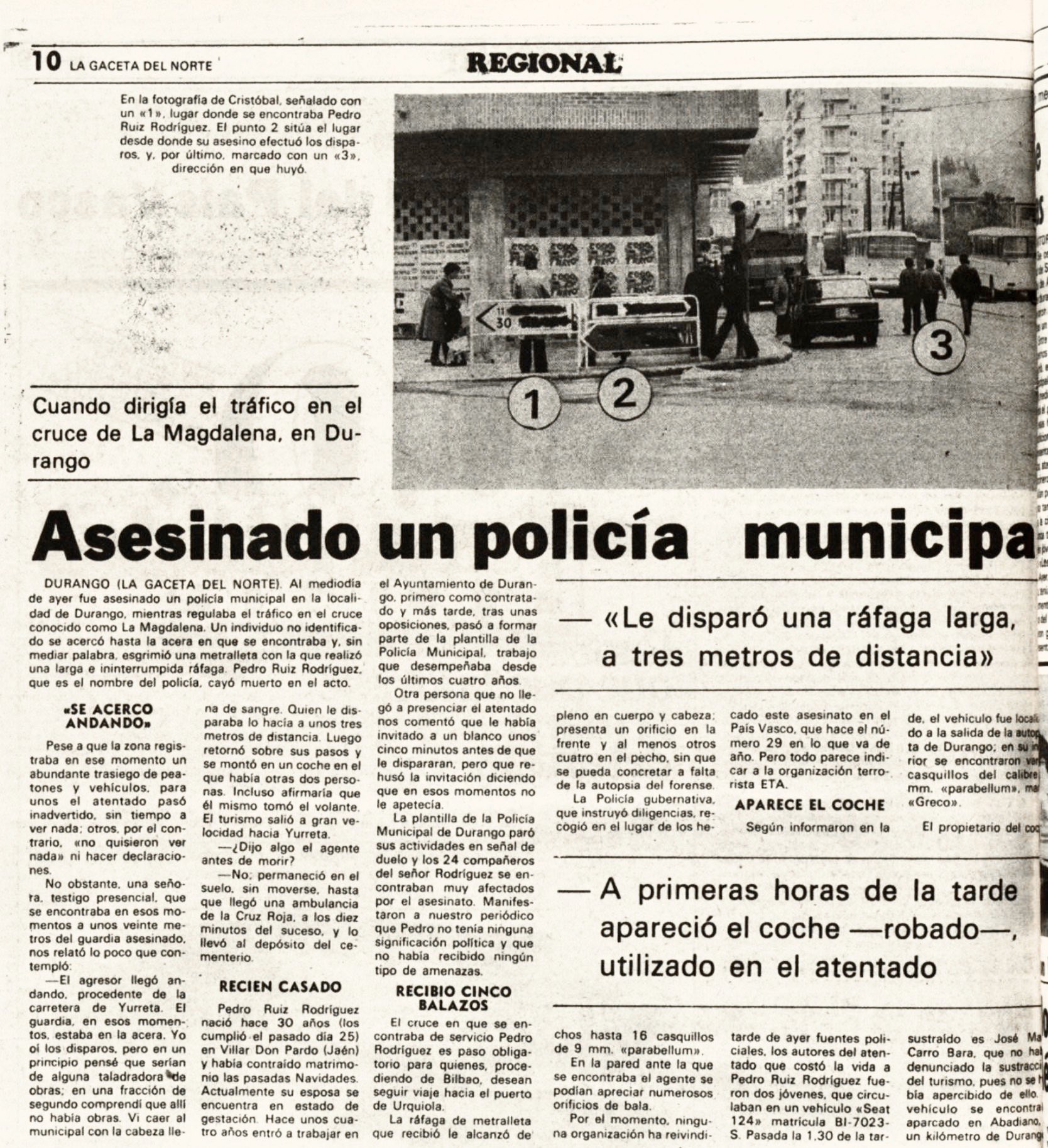 A principios de abril de 1979, la dirección de la banda terrorista ETA ordenó a un grupo de etarras que operaba en la zona de Durango y Guernica que prepararan el asesinato de un policía municipal de la localidad. En la carta se daban, además, los datos que se habían recopilado sobre la víctima. Tras comprobar esos datos, el 28 de abril de 1979 asesinan en Durango (Vizcaya) a PEDRO RUIZ RODRÍGUEZ.Eran aproximadamente las once y media de la mañana y el agente dirigía el tráfico en el cruce de la Magdalena cuando tres individuos lo ametrallaron desde un coche. Recibió dos ráfagas de metralleta a escasa distancia que le provocaron la muerte casi en el acto.
