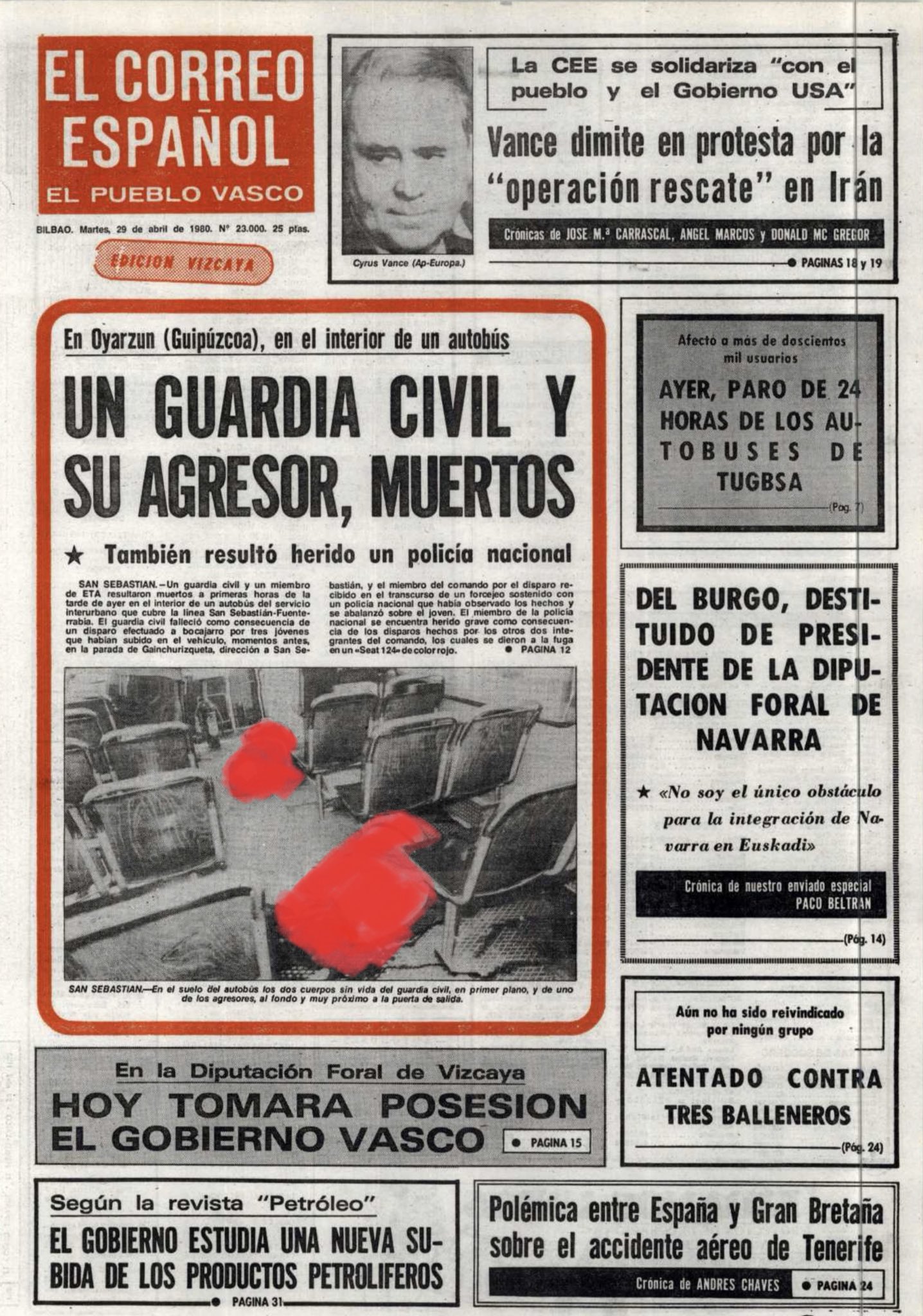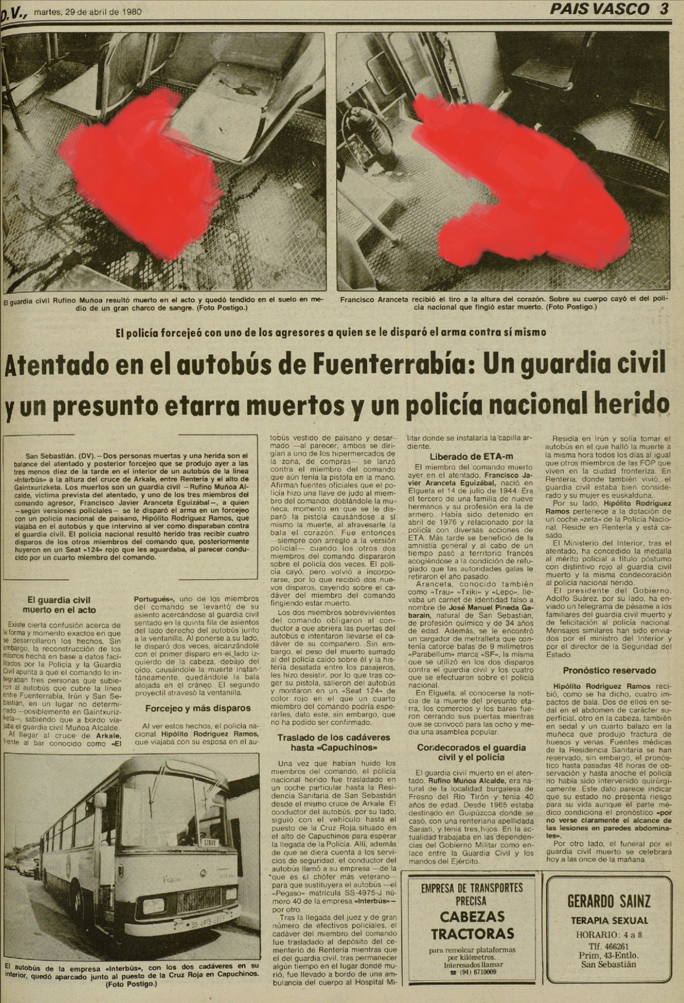En torno a las dos de la tarde del 28 de abril de 1980 es asesinado en San Sebastián RUFINO MUÑOZ ALCALDE. Era guardia civil y estaba destinado en el Gobierno Militar de la capital guipuzcoana.Rufino regresaba a su casa en Fuenterrabía en un autobús de línea desde San Sebastián. En la misma parada se subió el policía nacional Hipólito Rodríguez Ramos y su esposa. Tanto Rufino como Hipólito iban vestidos de paisano y se sentaron en diferentes asientos del autobús.En el alto de Gaintxurisketa, a unos cinco kilómetros de Rentería, subieron al autobús tres individuos. Poco después de reanudarse la marcha, dispararon a bocajarro contra Rufino, que se encontraba en la parte delantera del vehículo hablando con el conductor. Rufino Muñoz se desplomó, sangrando abundantemente. Murió casi en el acto.